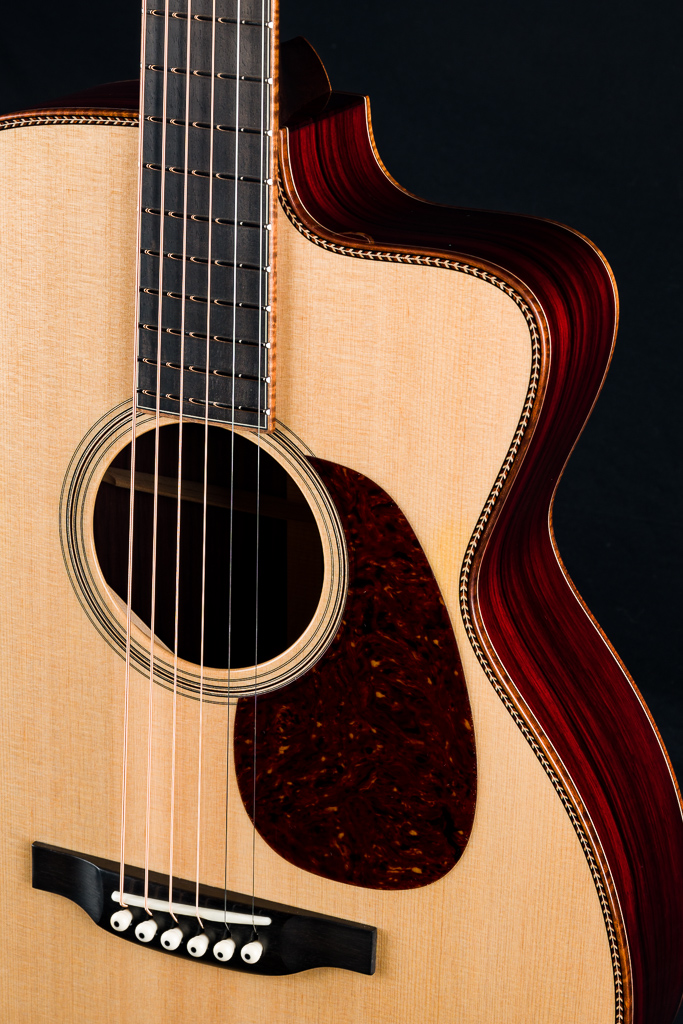 A very cool offering from Bourgeois Guitars, this “Coupe” 00-12C is their 12-fret offering on a 00 body shape and features rare Maritima Rosewood (Dalbergia maritima) back and sides, a true Rosewood from Madagascar also called Bois de Rose. It has a very striking and vibrant color with rich reds and purples- almost a combination of traditional Madagascar Rosewood and Cocobolo. It has a hardness very close to the famed Brazilian Rosewood and produces a similar glassy tone. The top is a wonderful pairing of Port Orford Cedar (Chamaecyparis lawsoniana), a rare wood in itself from the Pacific Northwest. Though called a Cedar it is harder and stiffer than a Cedar, and is actually in the Cypress family and rings like a true punchy Spruce.
