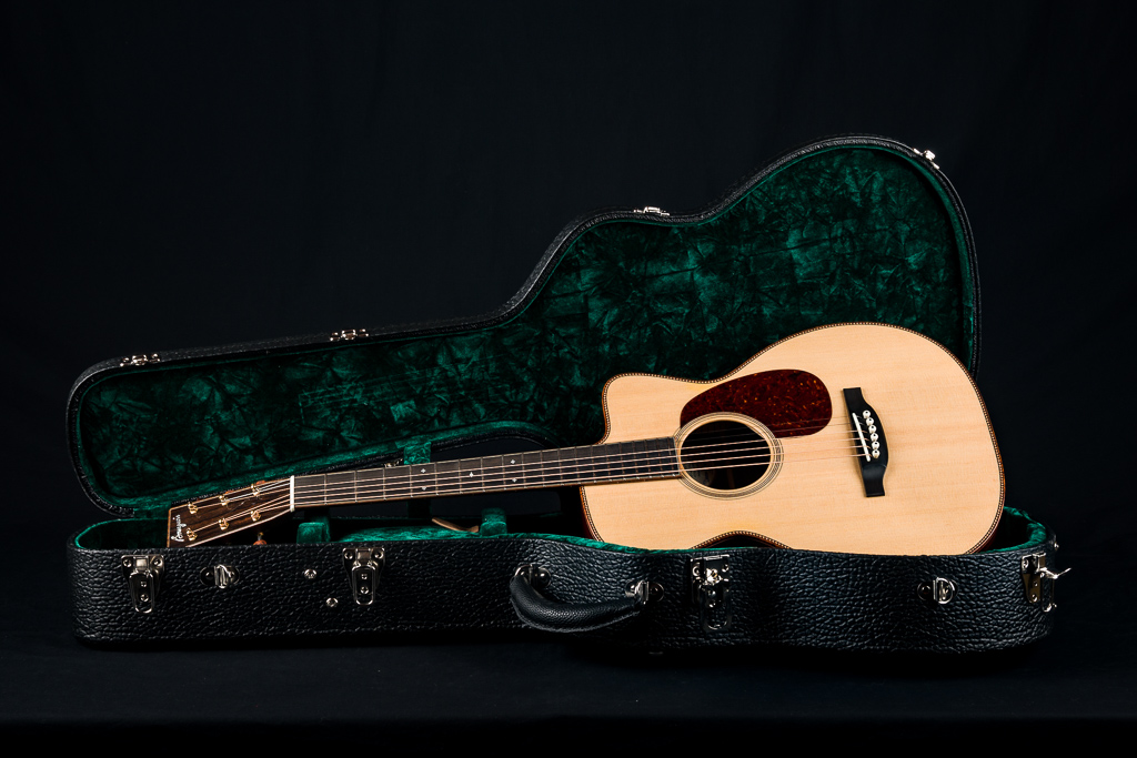 A showpiece for the 2023 Artisan Guitar Show this April, the custom 00-12C is built with the DB Signature Deluxe package which features full figured Hawaiian Koa bound body, fretboard and headstock, DB signature multi-colored wood herringbone top purfling, rosette and wood arrow backstrip, Gold Waverly tuners with Snakewood buttons plus the full Aged Tone package- the Aged Tone thin gloss finish and Aged Tone torrefied Adirondack Spruce bracing with Animal Protein Glue construction under the hood.  Other Features include Ebony fretboard and bridge, Mahogany neck, Ziricote headstock overlay, Bone square and diamond fretboard inlays, Koa heelcap and wedge, 1 3/4″ nut width and more. Providing extraordinary comfort through a short scale length and condensed total length, the 00 Coupe is not your standard 12 fret small body 00. It transforms your perfect couch guitar into a versatile instrument with a surprisingly large sound. It’s got the shape of an elongated OM, just slightly smaller. The 12 fret short scale configuration pushes the bridge more towards the lower bout, more in the ‘sweet spot’ of the top. Warmth, volume and an ease of playing ensue.