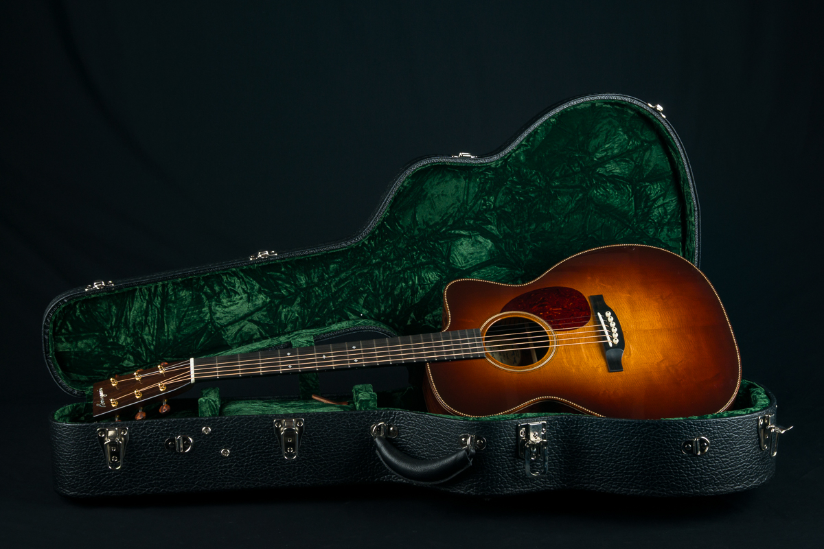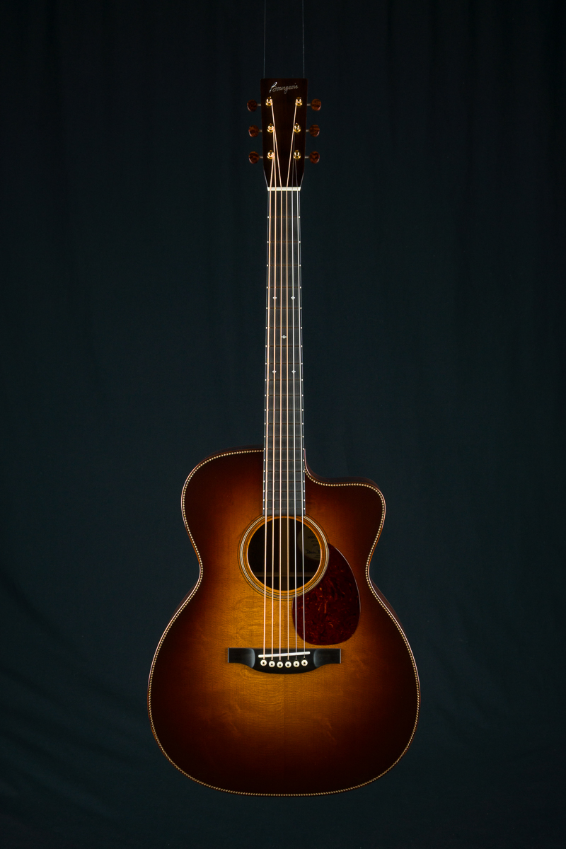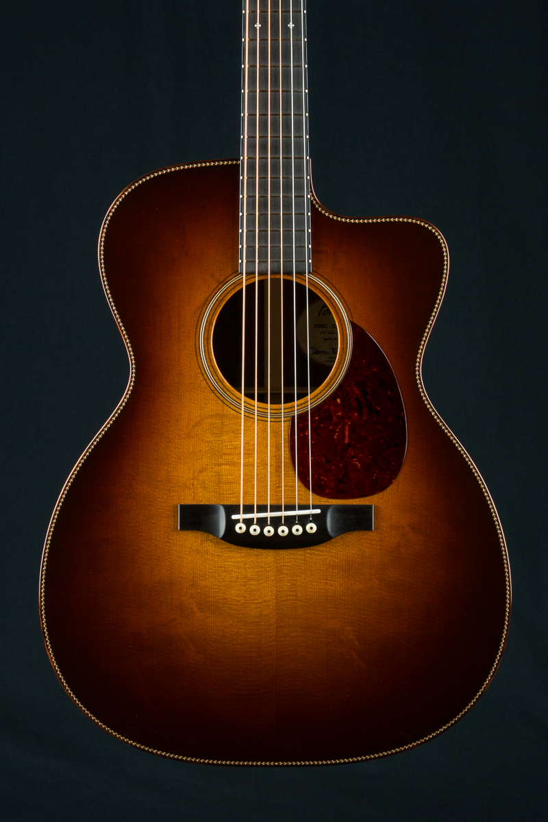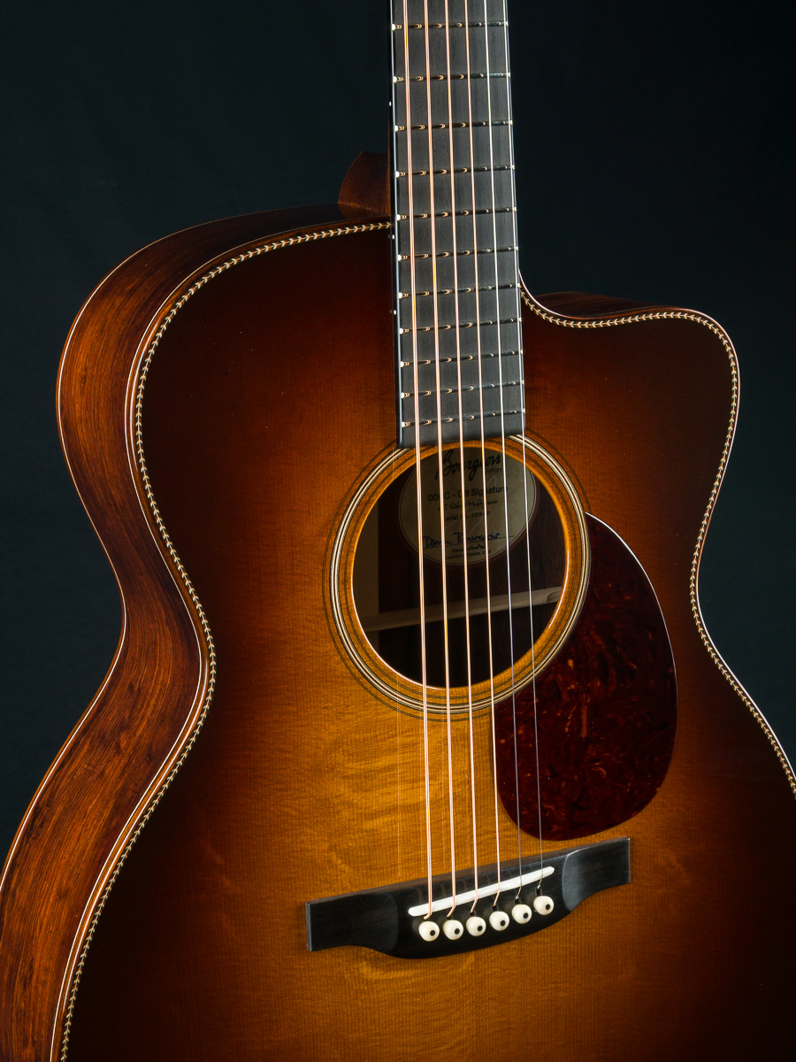 This stunning custom 000C DB Signature model combines a figured Aged Tone torrefied Adirondack Spruce sunburst top with gorgeous Madagascar Rosewood back and sides with beautiful reddish-brown hue and dramatic contrasting black grain lines and streaks throughout. Adirondack Spruce bracing drives this custom 000 under the hood.