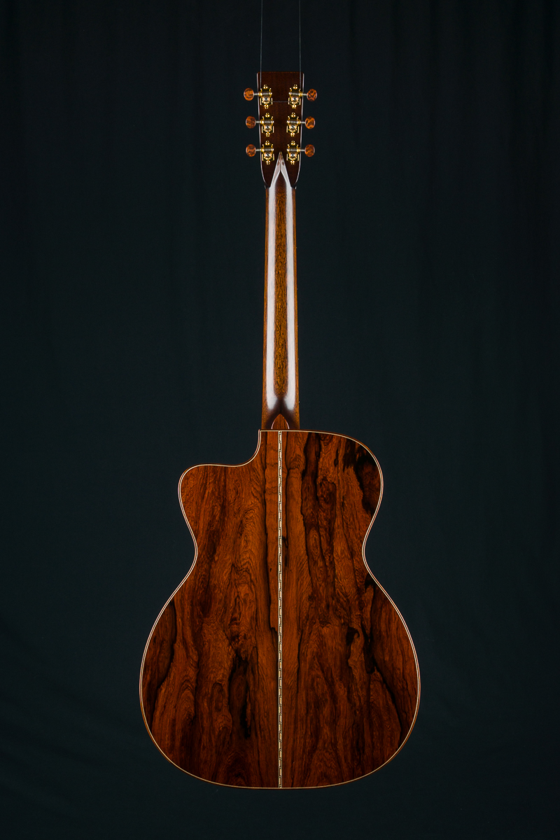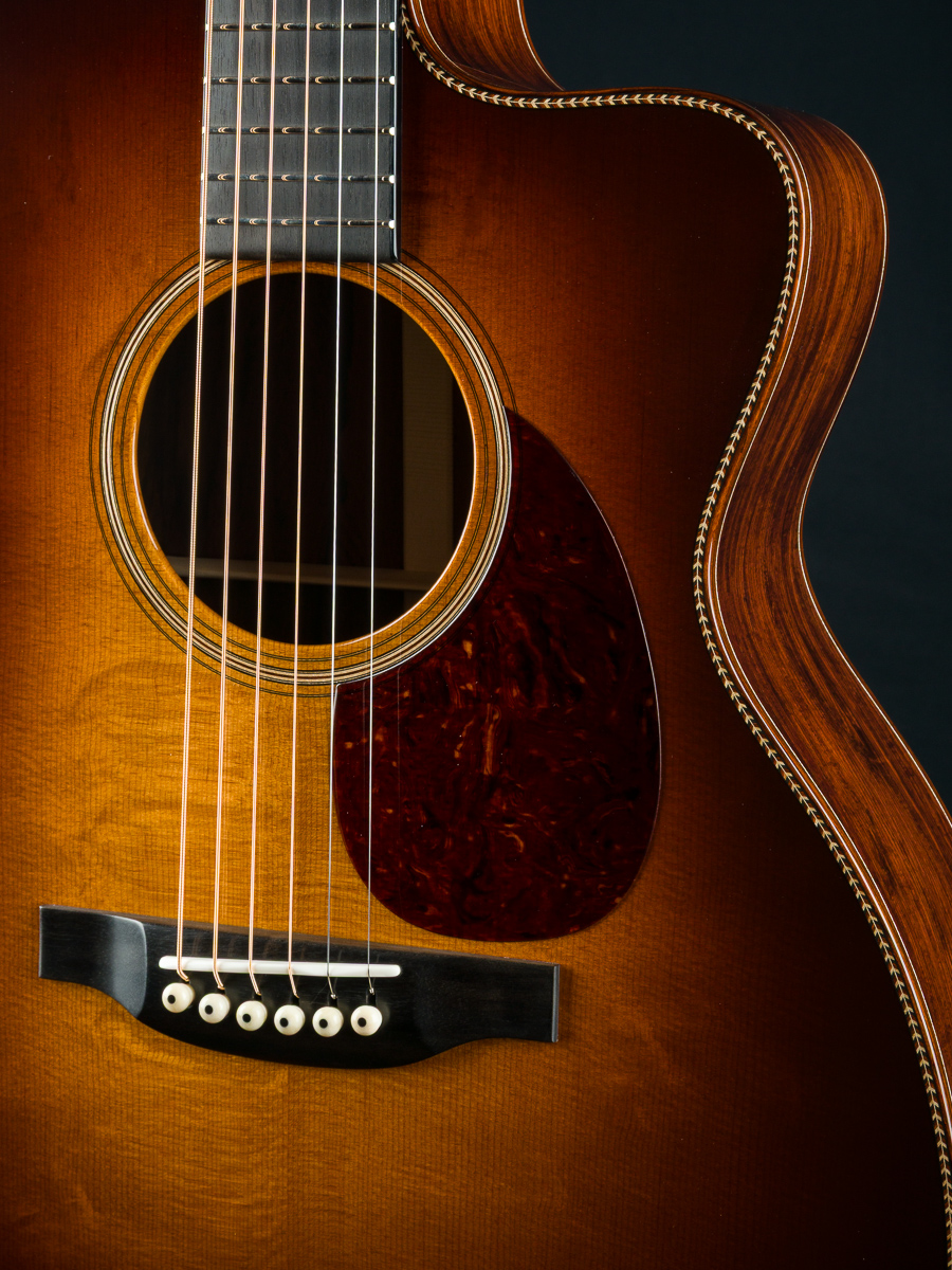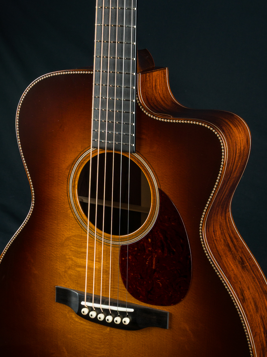 This stunning custom 000C DB Signature model combines a figured Aged Tone torrefied Adirondack Spruce sunburst top with gorgeous Madagascar Rosewood back and sides with beautiful reddish-brown hue and dramatic contrasting black grain lines and streaks throughout. Adirondack Spruce bracing drives this custom 000 under the hood.