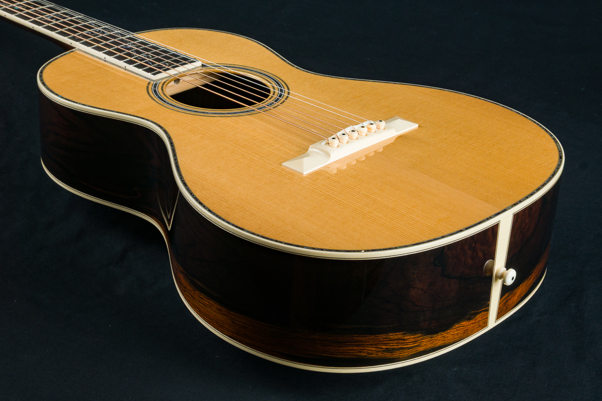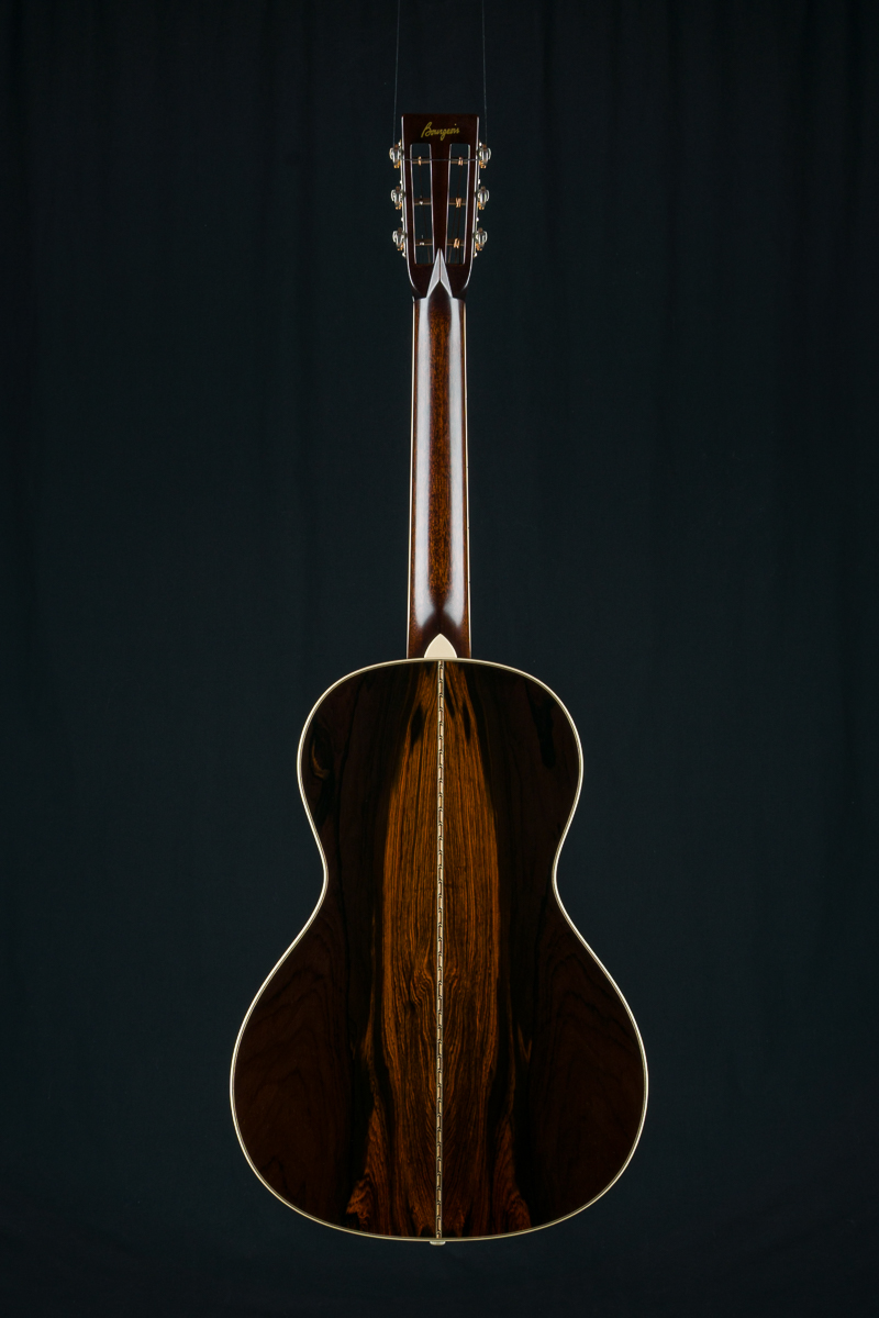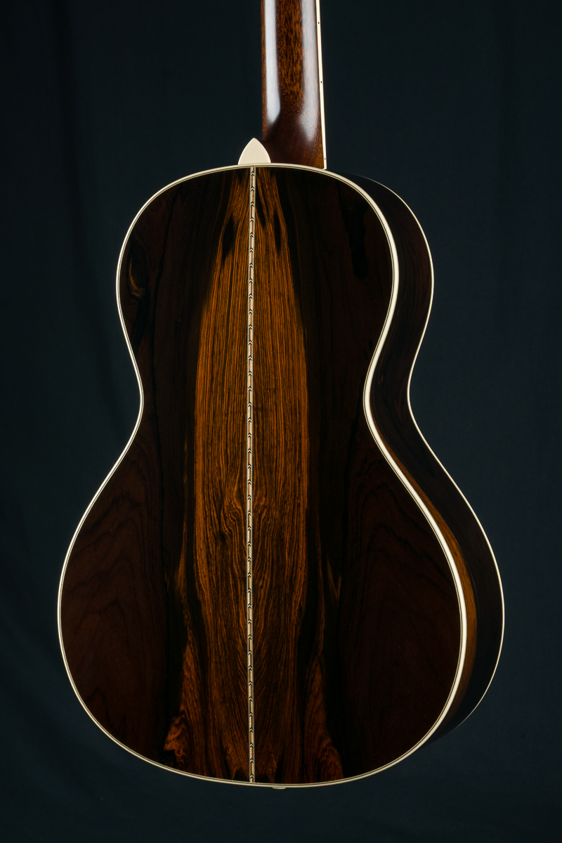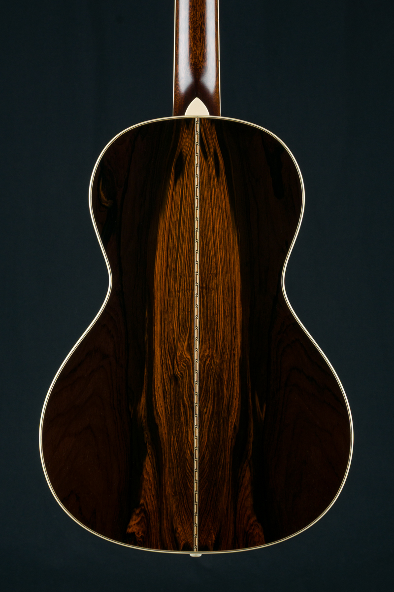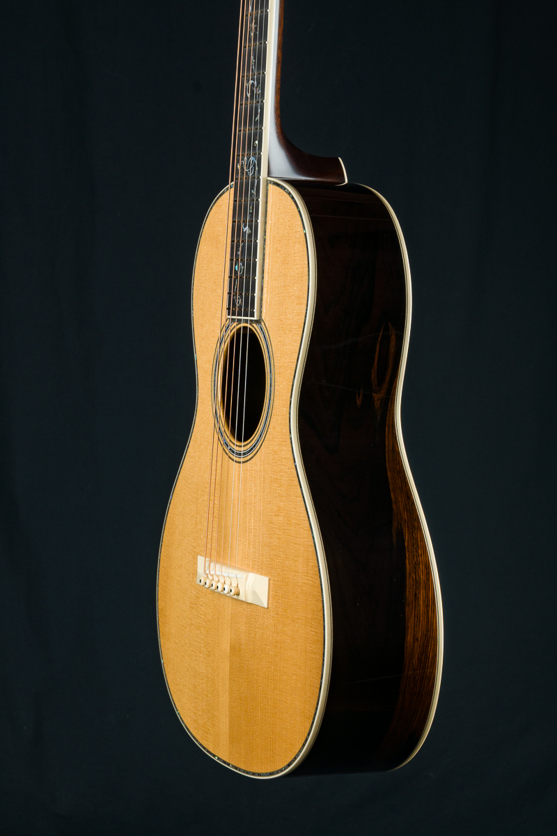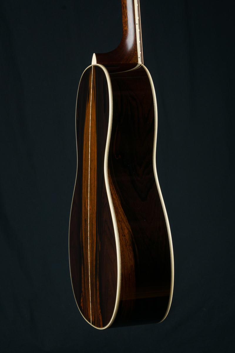 A recent addition to the Bourgeois lineup and one of our new favorites, the Concert Parlor is a scaled-up version of their smallest model, the Piccolo Parlor. While it shares the same 7.5″ waist, every other dimension has been expanded. With a 13.5″ lower bout, 9.25″ upper bout, 4″ body depth, and a 19″ body length, this model offers a distinctive silhouette reminiscent of early 12-fret Size 1 and 0 guitars from the turn of the century. Sitting between the Piccolo Parlor and Bourgeois’ 00 12-fret model, the Concert Parlor is just slightly smaller than the 00 but features a bit more body depth and length. Its comfortable size makes it perfect for fingerpicking, whether you’re playing delicate melodies or bluesy riffs. The powerful combination of Brazilian Rosewood and Adirondack Spruce, a pairing often hailed as the “Holy Grail”, delivers punchy dynamics, wide tonal range, and glass like clarity.