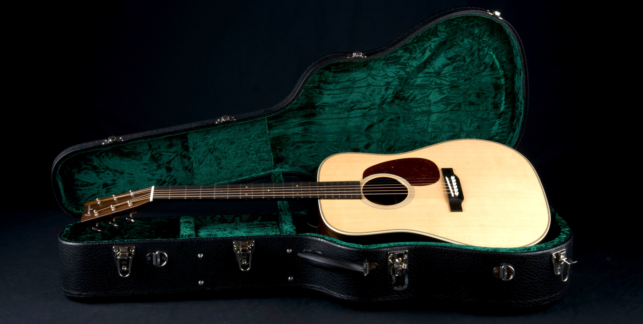 Features include Ebony fretboard and bridge, Mahogany neck with diamond volute, vintage herringbone purfling, Ivoroid body bindings, Ziricote headstock overlay, vintage ring rosette, Abalone Pearl square and diamond inlays, Schaller vintage Nickel tuners, Ivoroid pins with black dots, zipper backstrip, 1 23/32″ nut width, 2.2″ saddle spacing, 25.5″ scale length and more.
