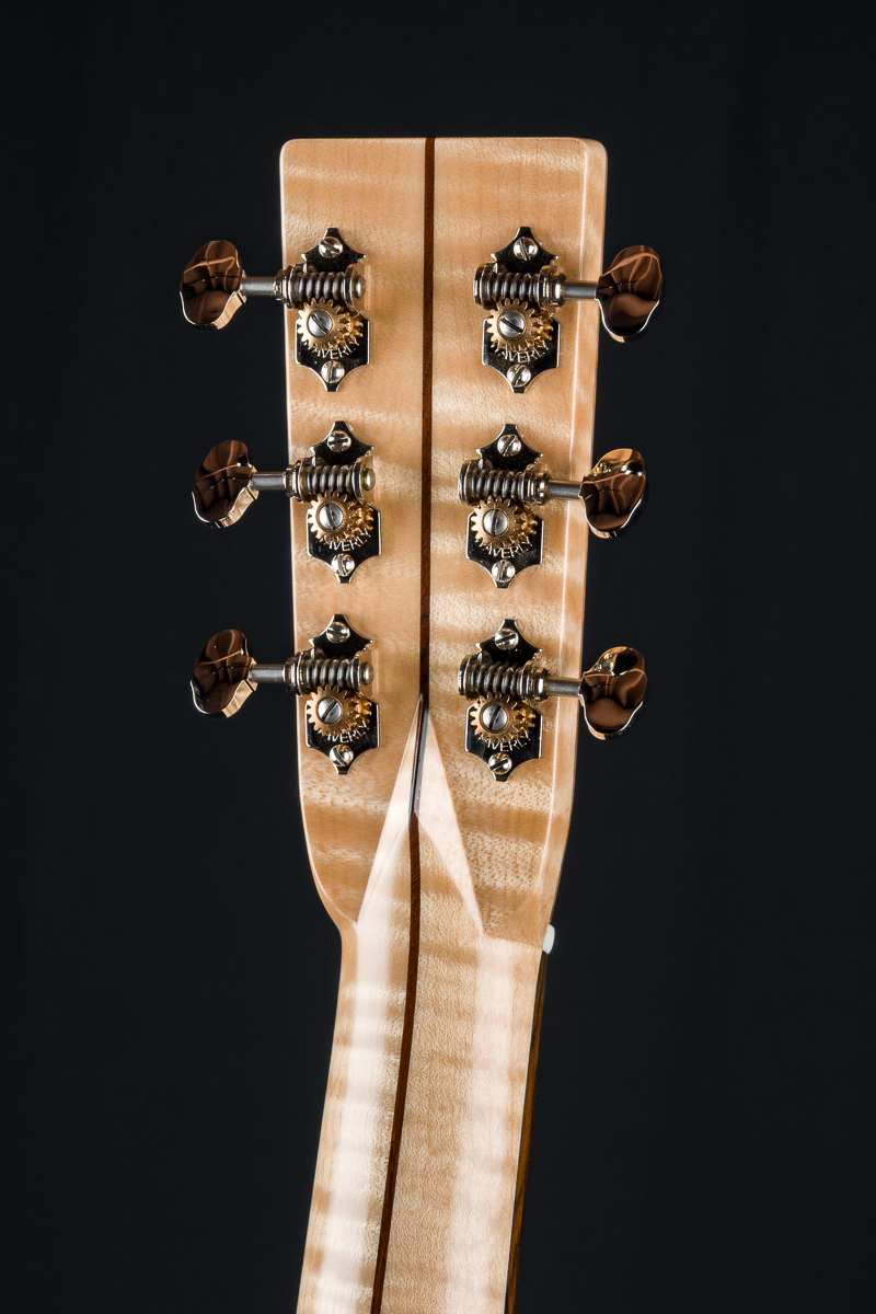Other features include Abalone Pearl ring rosette, DB signature multi-colored herringbone top purfling, tortoise body bindings, Abalone Pearl slotted squares & diamonds fretboard inlay, figured Walnut headstock overlay, Waverly Nickel tuners, DB signature wood arrow backstrip, Walnut heelcap and wedge, Bone nut and saddle, Ebony pins with Pearl dots, 1 23/32″ nut width, 2.2″ saddle spacing and more.