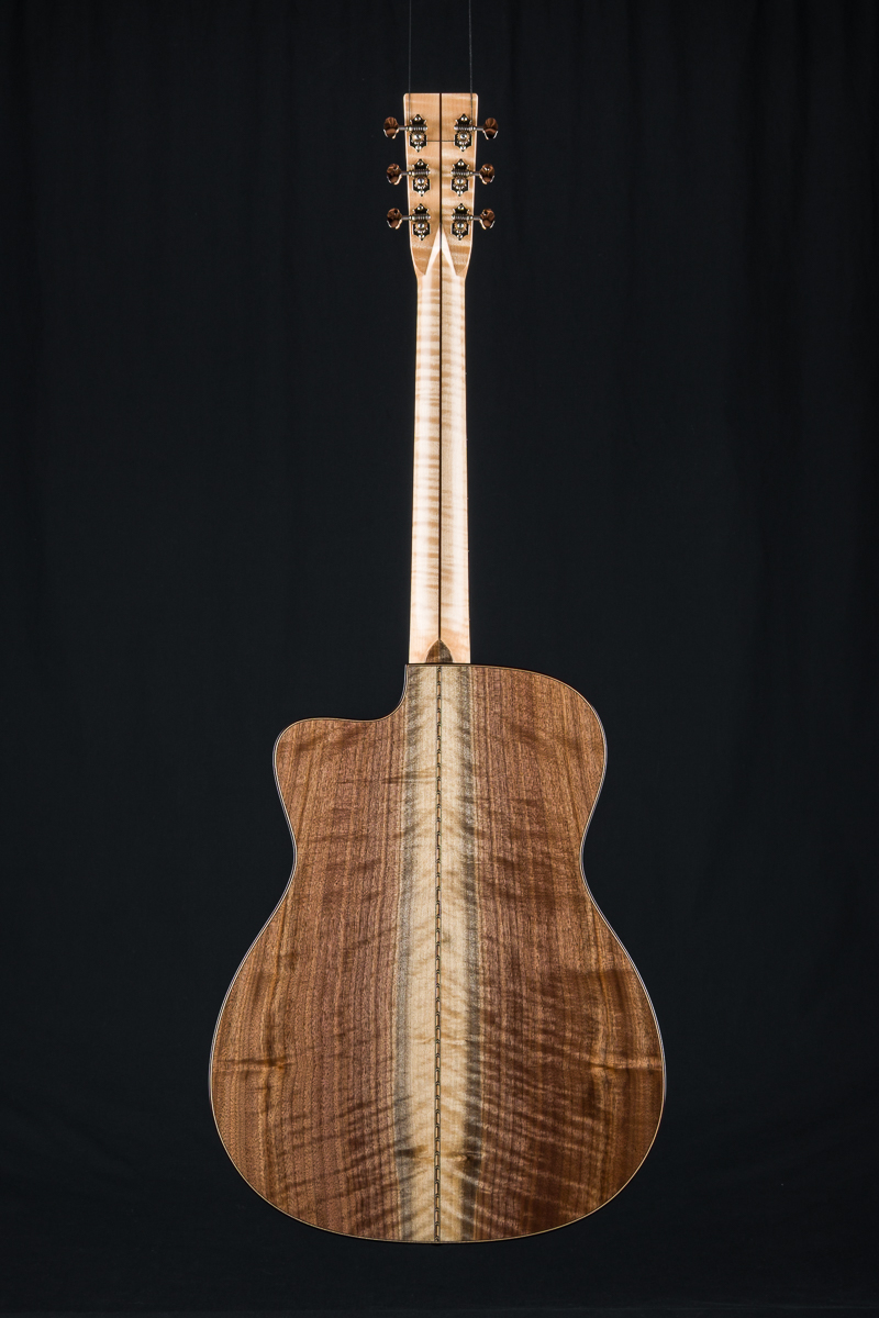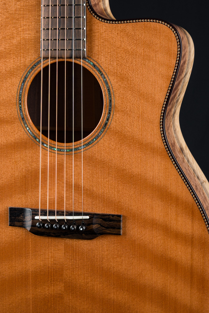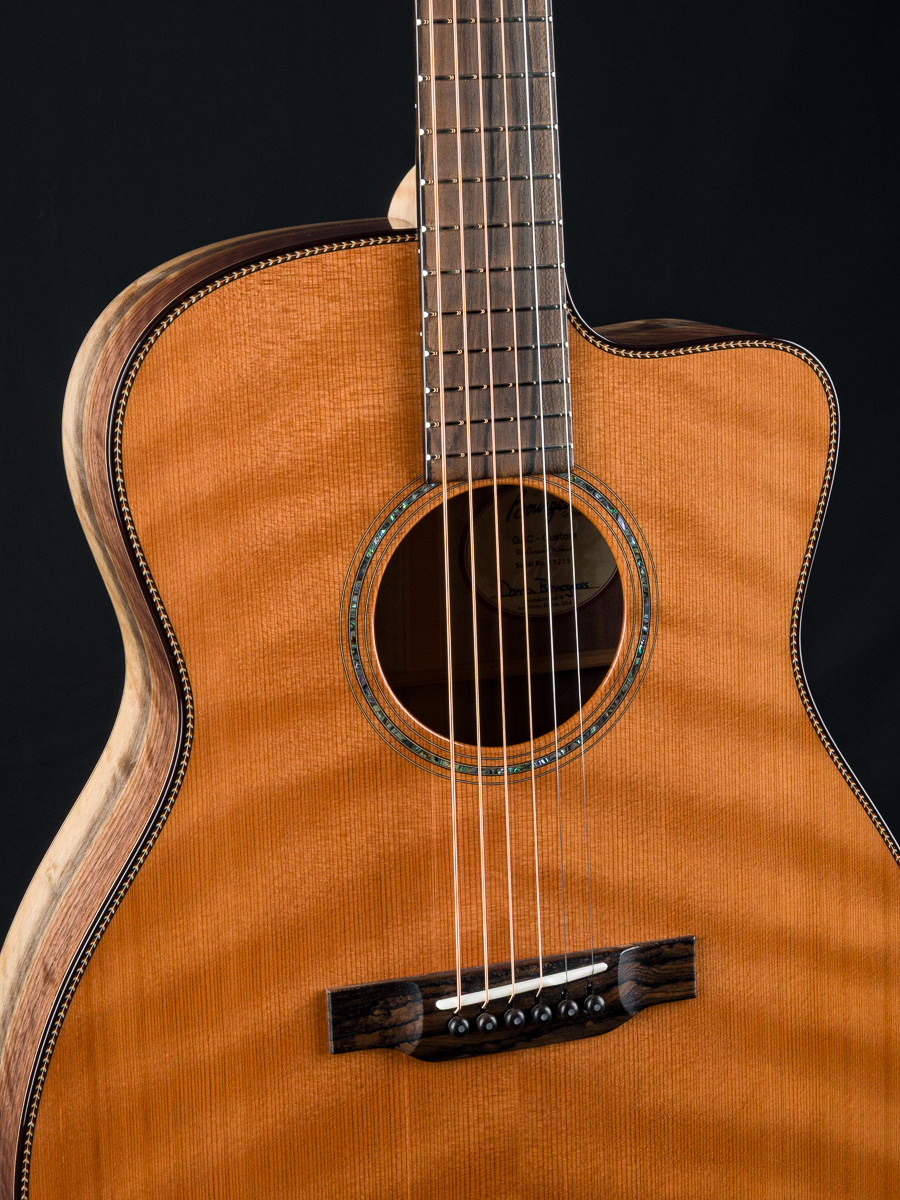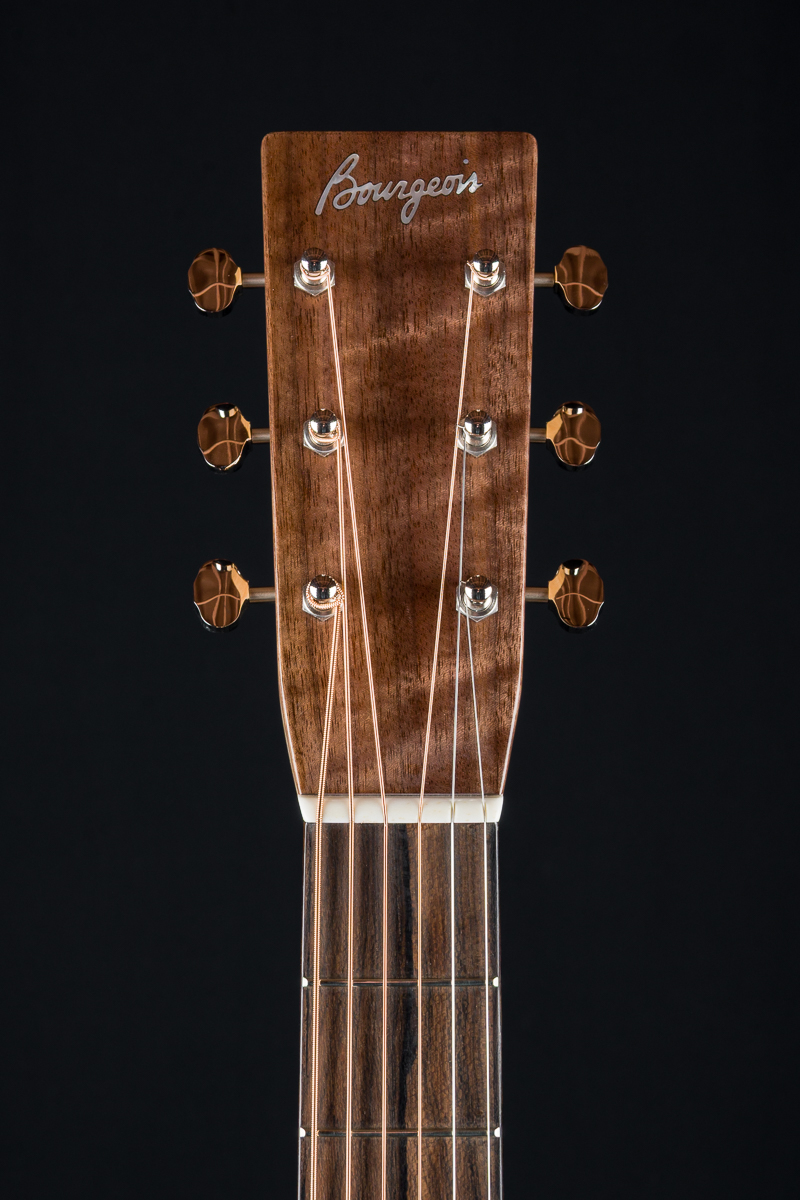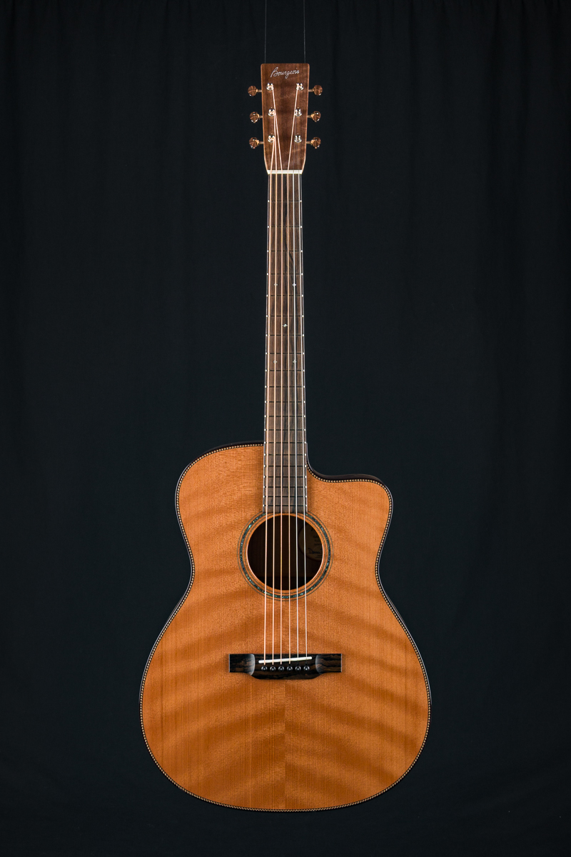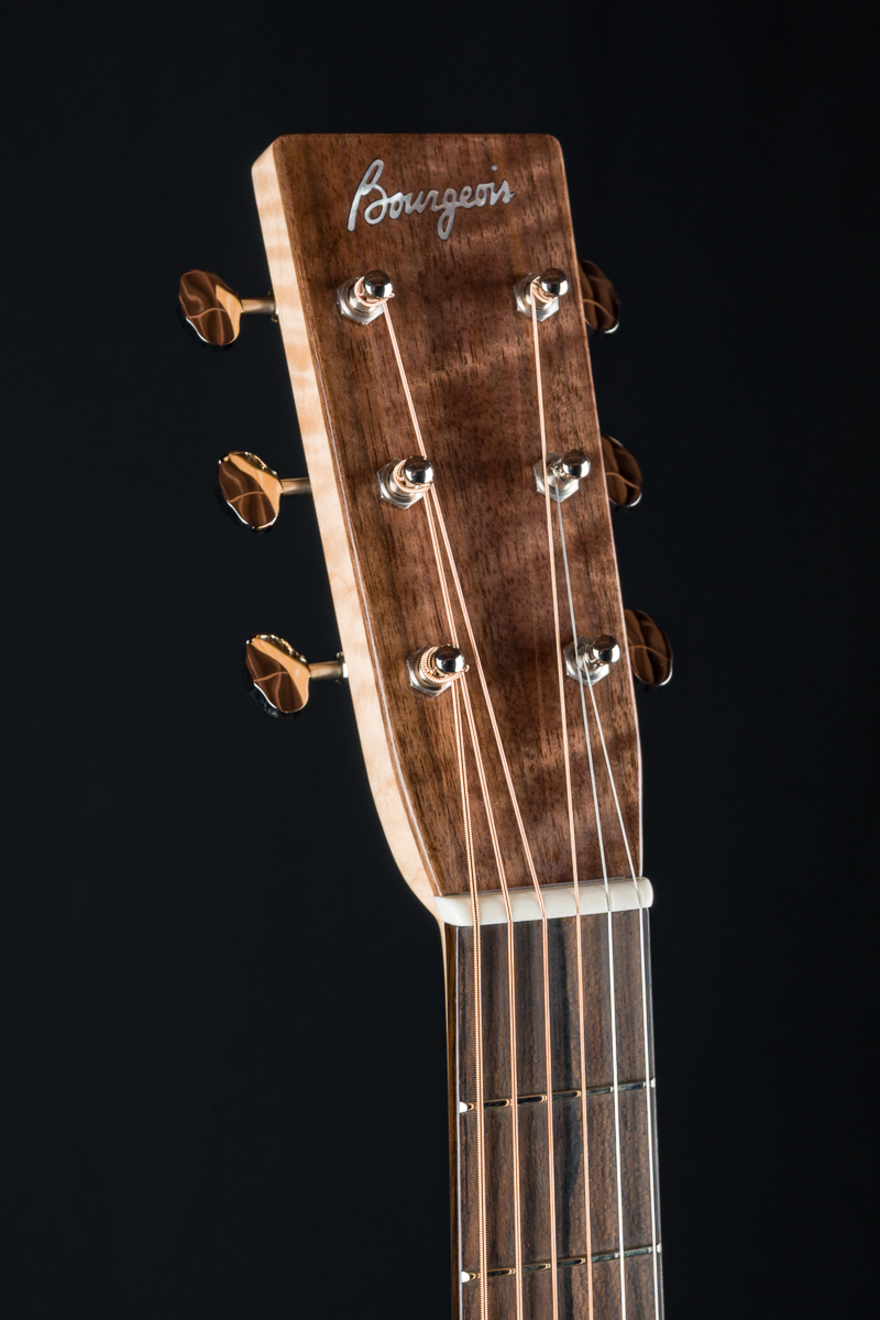 The Bourgeois Grand Auditorium (GA), or thin body JOM (Jumbo OM), is a body style that was developed by Dana Bourgeois in response to players’ requests for a comfortable mid-sized guitar with the balance and clarity of an OM but with a bigger presence. The idea was simple: Start with the OM outline, enlarge it a bit, play around with the curves but instead of deepening the body, keep it at the standard OM depth for more focused midrange, and you have the Bourgeois GA. The result is a wonderfully versatile guitar; larger than an OM, smaller than a Dreadnought, capable of handling almost any playing style you can imagine, and equally capable of operating in solo or ensemble situations. The soft venetian cutaway allows ease of access to the higher register for more variety of playing.