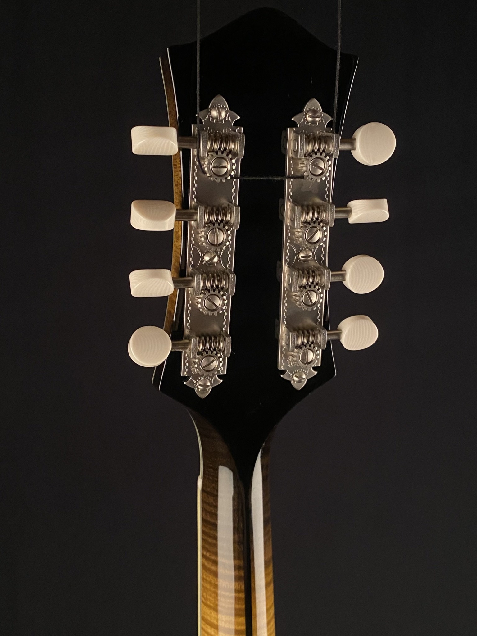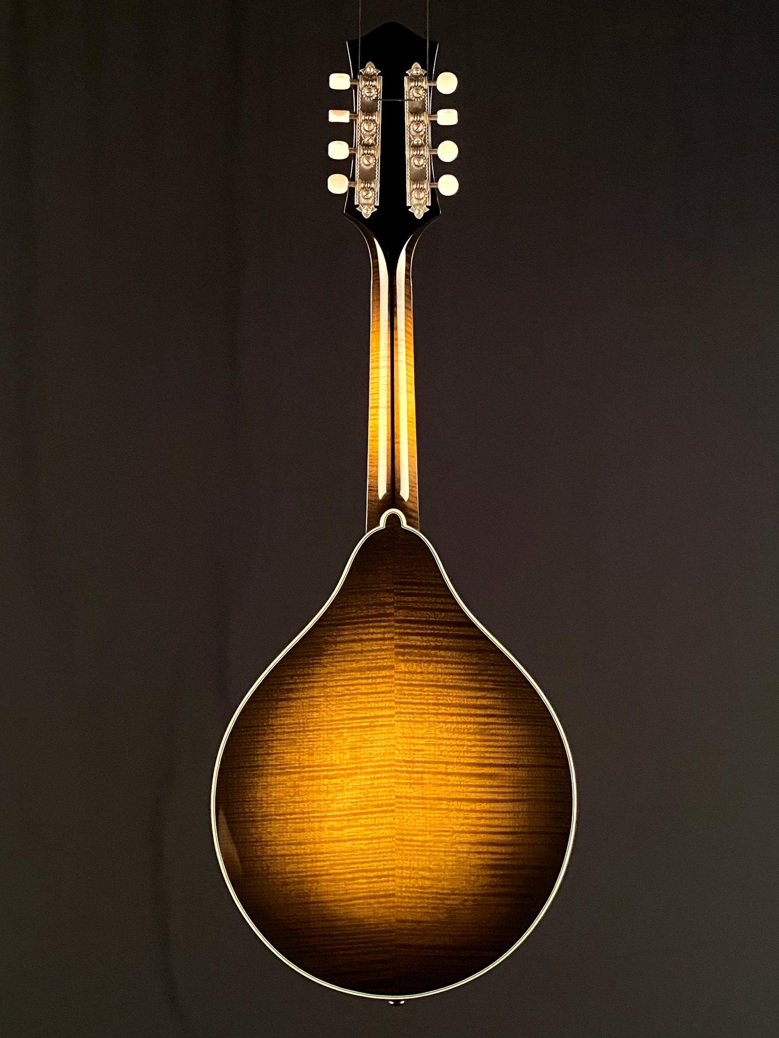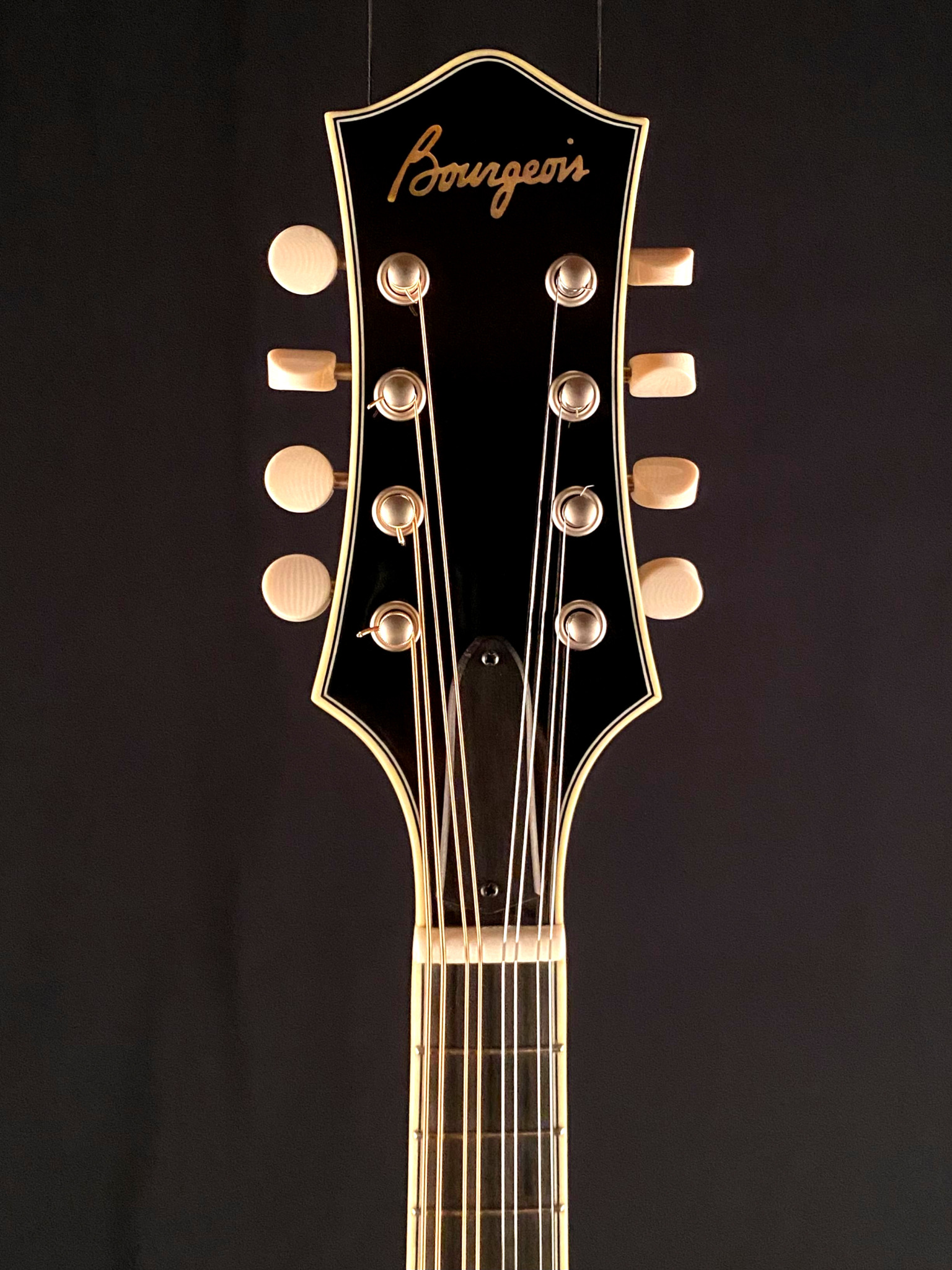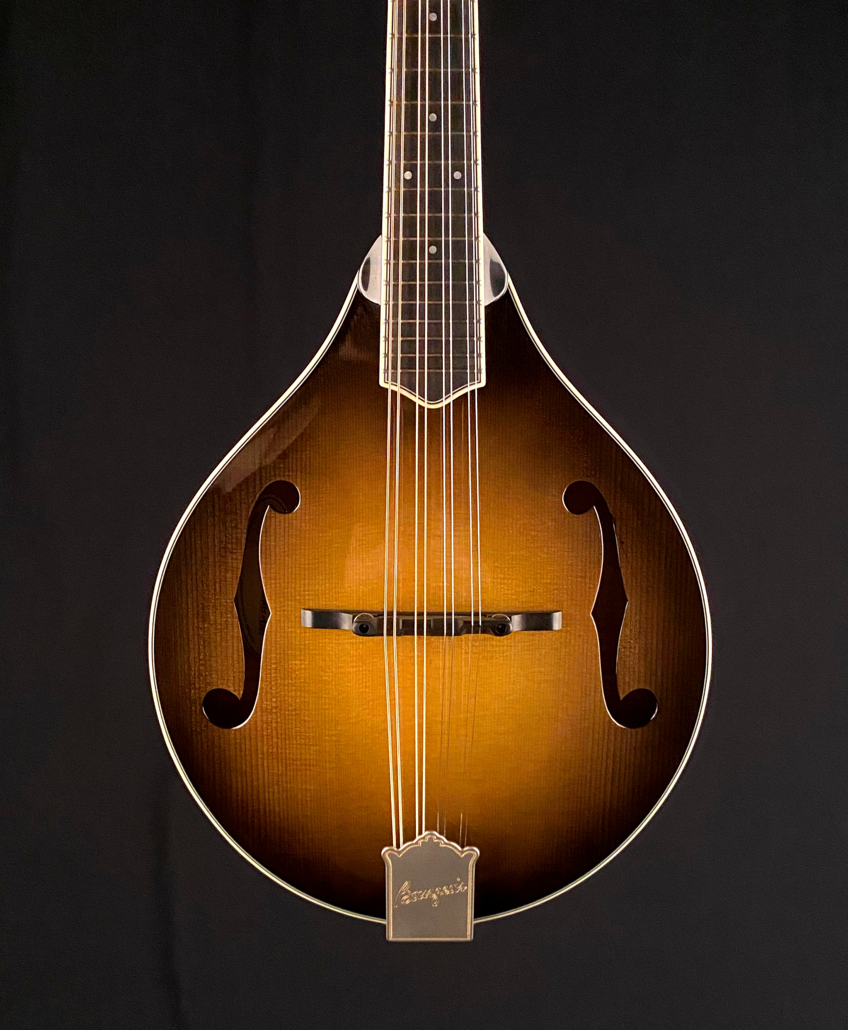 Features include full gloss tobacco sunburst finish, Ebony fretboard and adjustable bridge, Golden Age Waverly Golden Age satin finish tuners with ivoroid buttons, custom engraved Bill James satin Nickel tailpiece, full Ivoroid bindings, Pearl dot inlays, 1 3/32″ Bone nut and more.