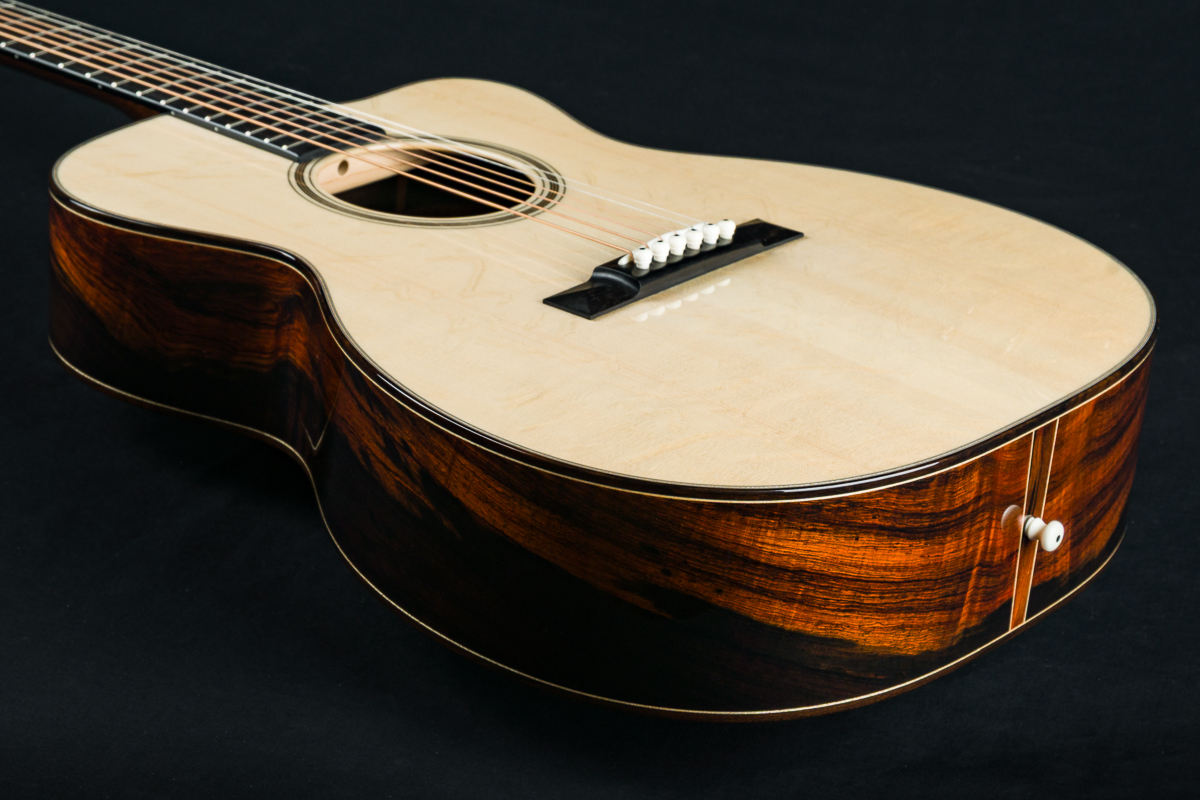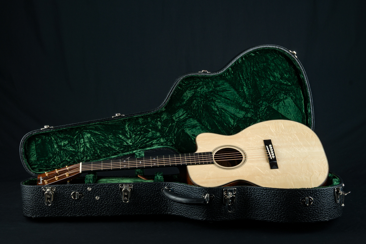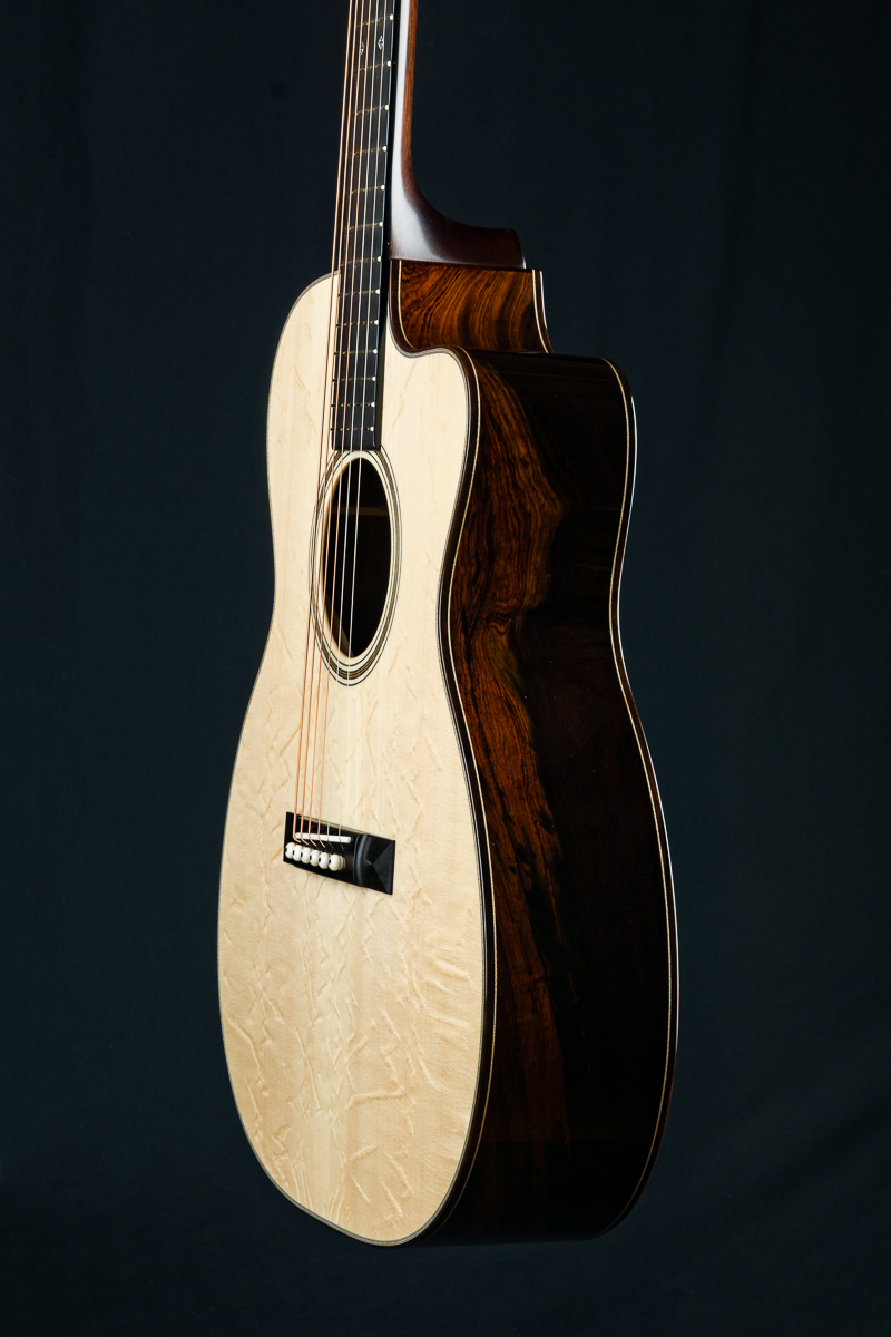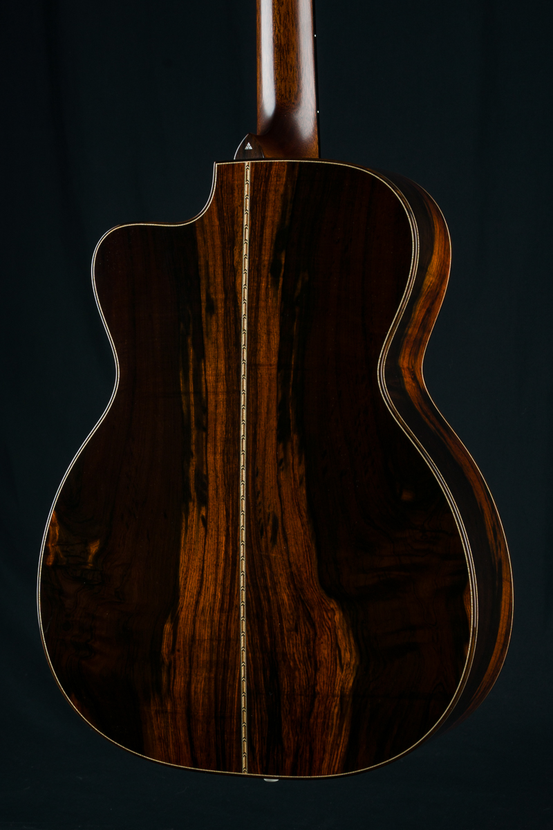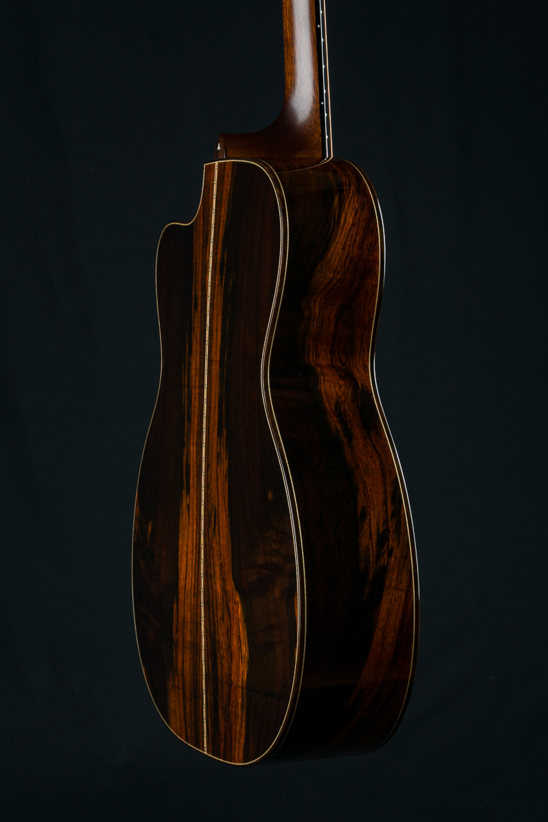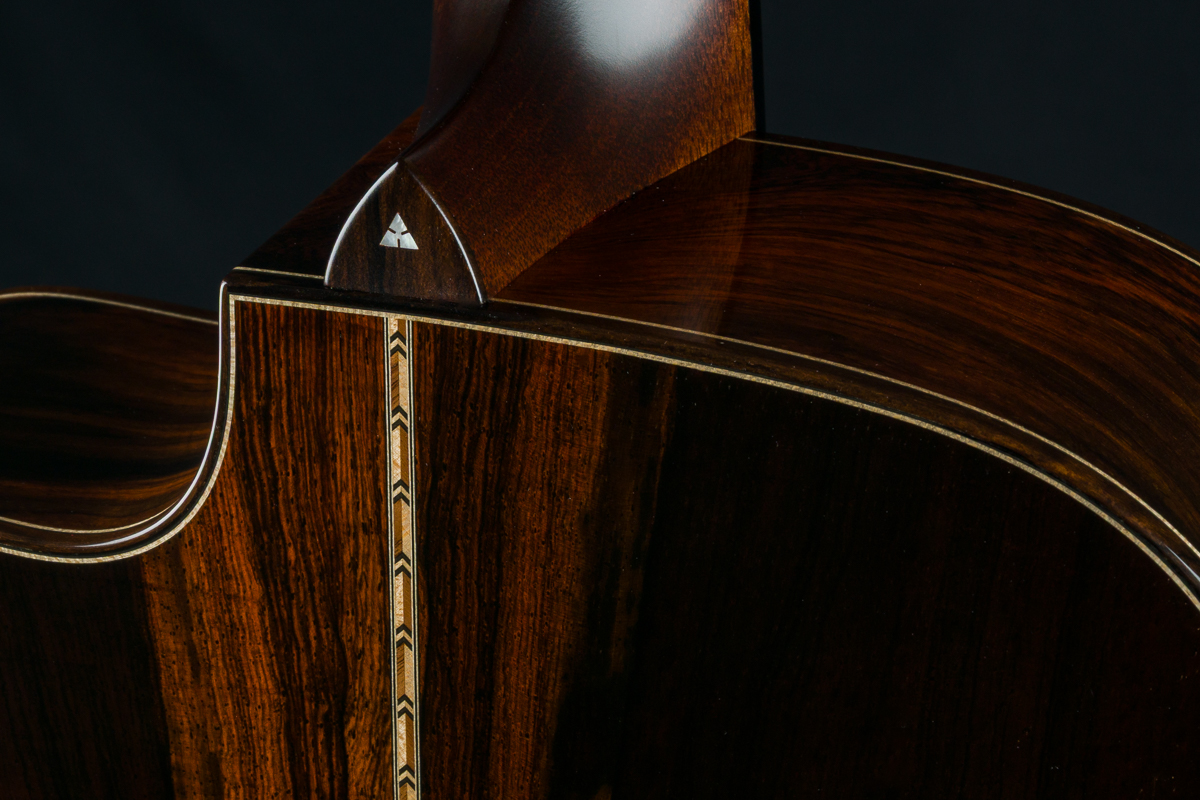 Other features include venetian cutaway, Soloist style top purfling, Ziricote body bindings, Ebony fretboard and pyramid bridge, Mahogany neck with volute, wood rings rosette, Brazilian Rosewood wedge and heelcap, Bone pins with black dots, Waverly Gold tuners with Ebony buttons, 1 3/4″ nut width and 2 5/16″ saddle spacing and more.