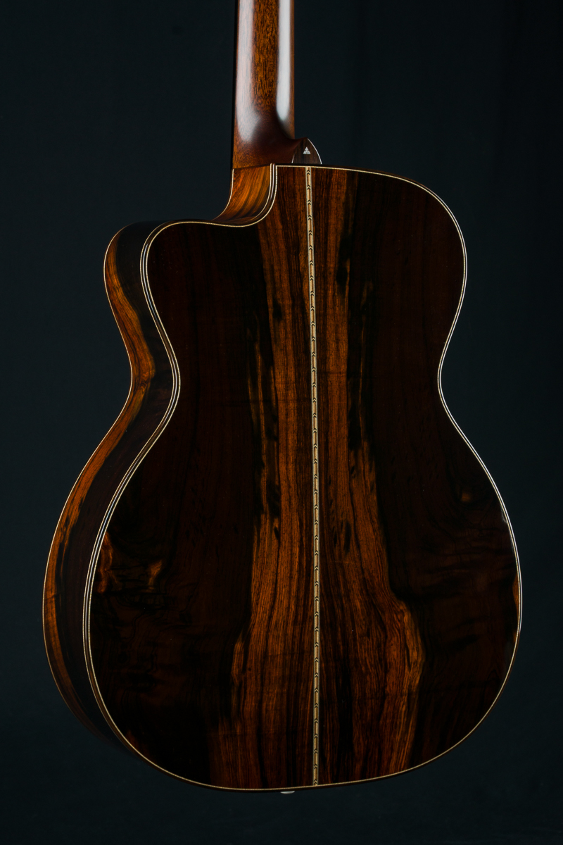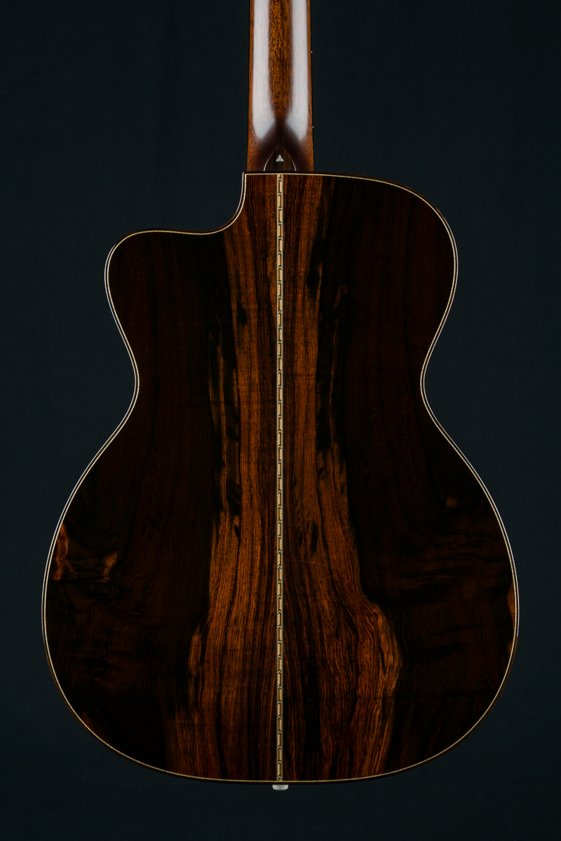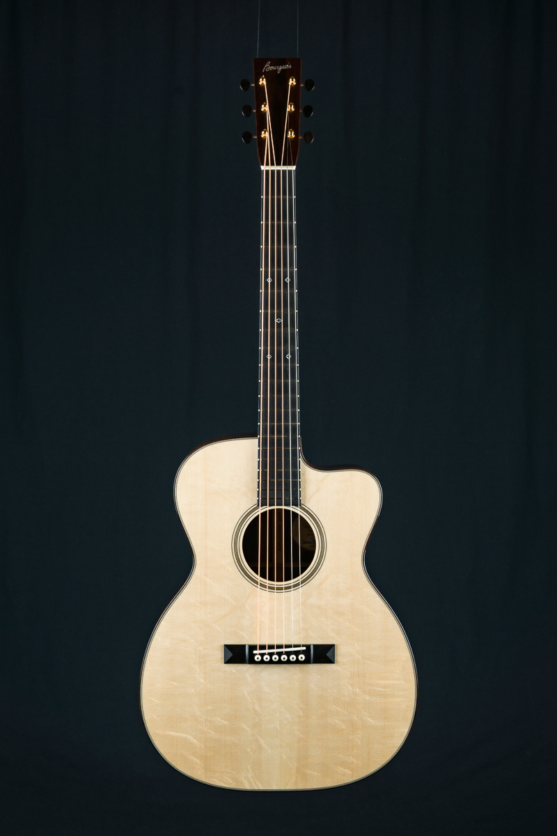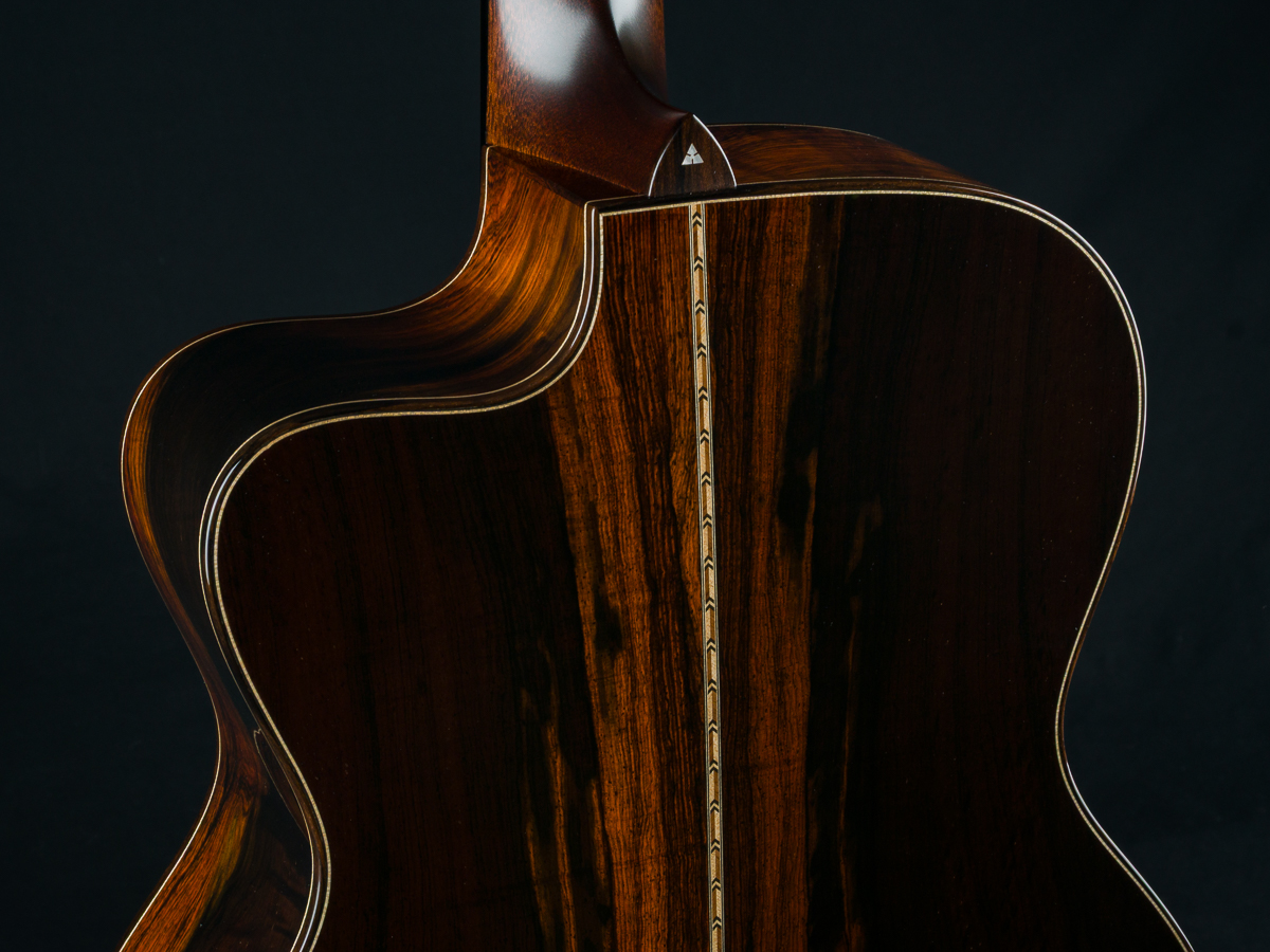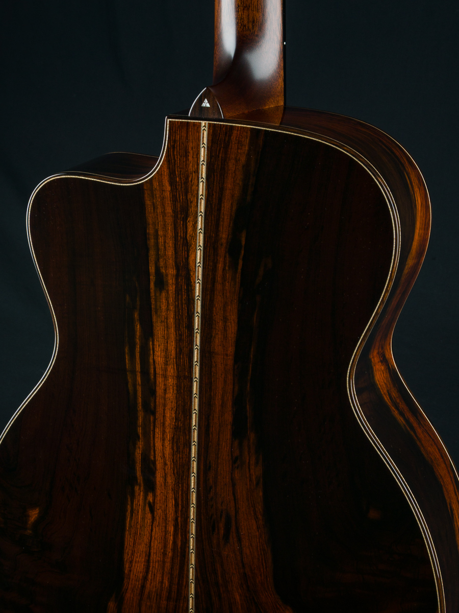 Other features include venetian cutaway, Soloist style top purfling, Ziricote body bindings, Ebony fretboard and pyramid bridge, Mahogany neck with volute, wood rings rosette, Brazilian Rosewood wedge and heelcap, Bone pins with black dots, Waverly Gold tuners with Ebony buttons, 1 3/4″ nut width and 2 5/16″ saddle spacing and more.