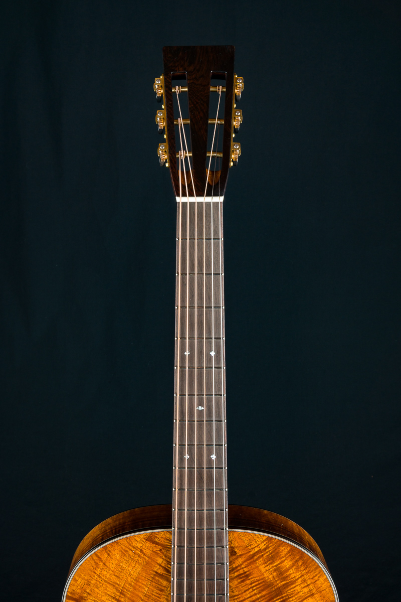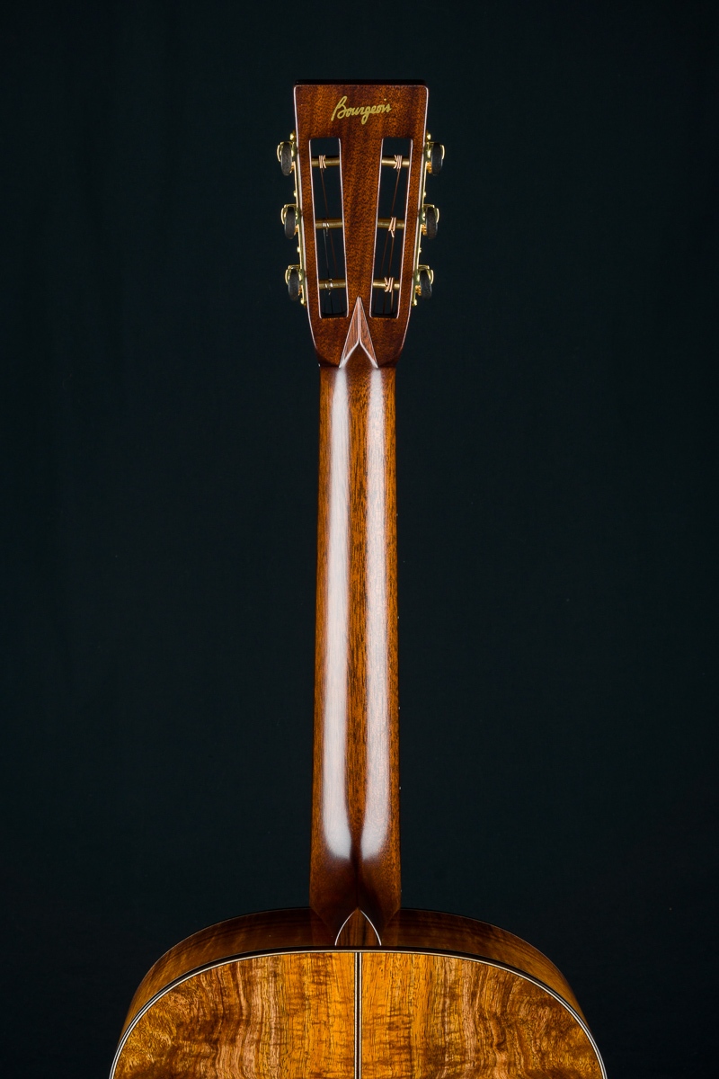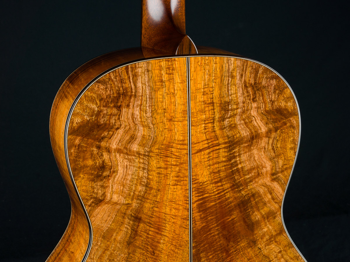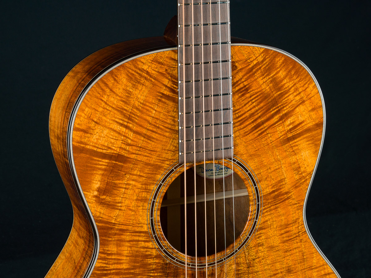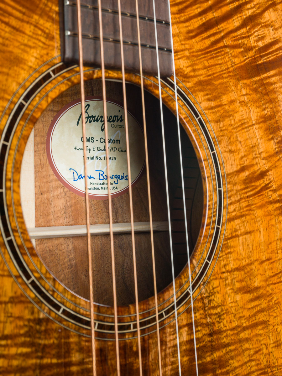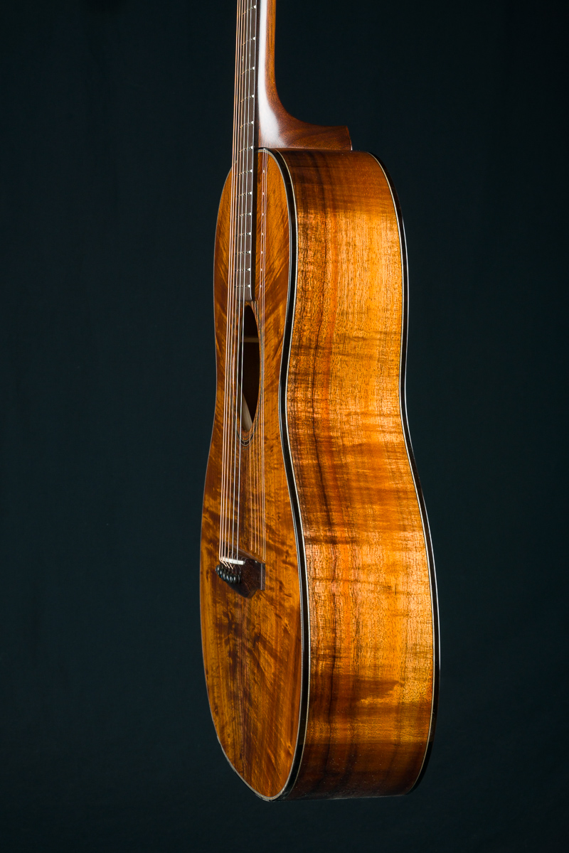 In the late 1920s, 12-fret, slotted head guitars began their historic transformation into the solid headstock and alternate body sizes found in guitars still to this day. This is a stunning custom OMS 12-Fret Custom, harkening back to the days of the early larger body slotted head Hawaiian guitars. Built by our our friends at Bourgeois Guitars in Lewiston, ME. this custom OMS features a stunning set of Premium Hawaiian Koa top, back and sides with flamed and ripple throughout. Custom Brazilian Rosewood fretboard, bridge and headstock overlay along with matching Brazilian Rosewood bindings, backstrip and custom segmented tile rosette with Maple border add deep contrast to the natural color Koa.