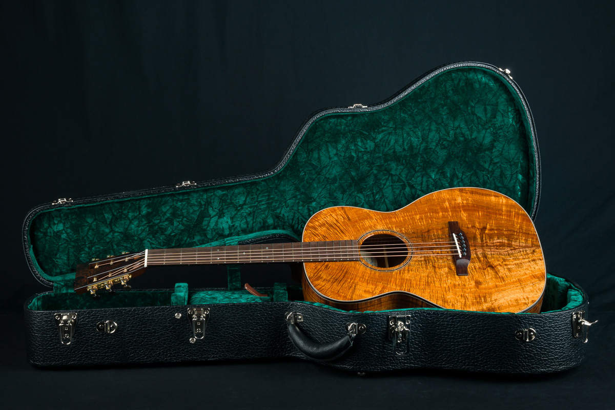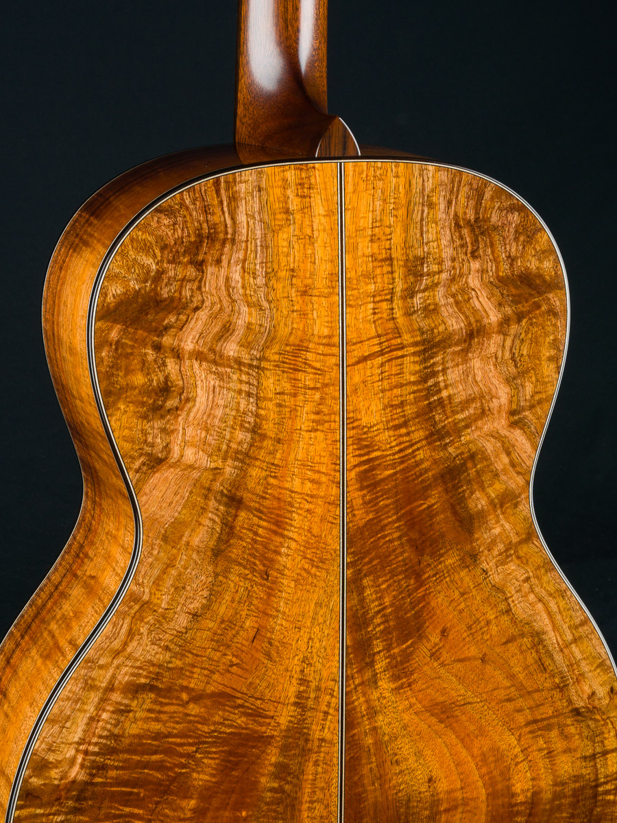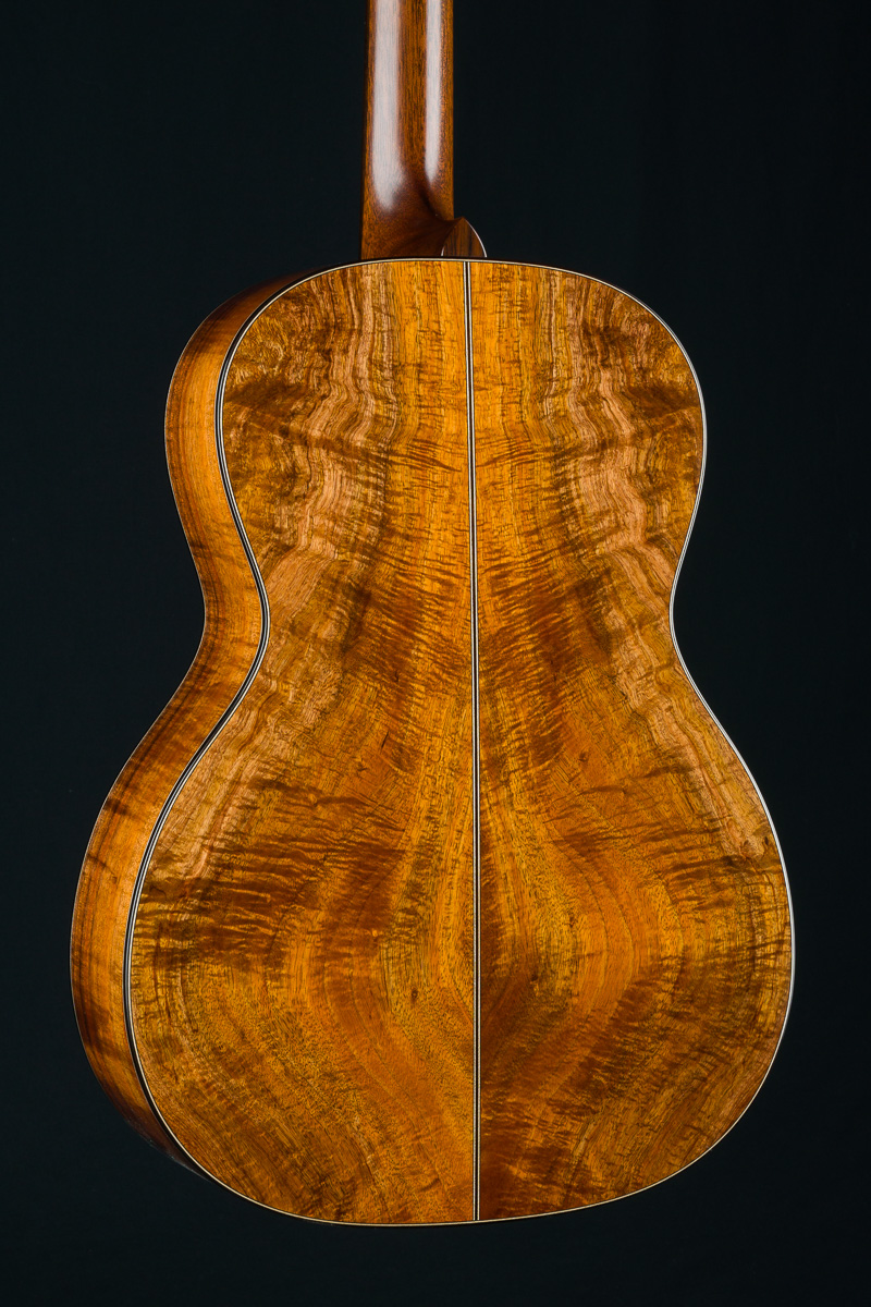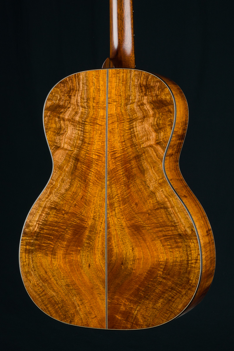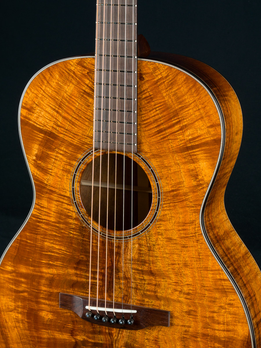 In the late 1920s, 12-fret, slotted head guitars began their historic transformation into the solid headstock and alternate body sizes found in guitars still to this day. This is a stunning custom OMS 12-Fret Custom, harkening back to the days of the early larger body slotted head Hawaiian guitars. Built by our our friends at Bourgeois Guitars in Lewiston, ME. this custom OMS features a stunning set of Premium Hawaiian Koa top, back and sides with flamed and ripple throughout. Custom Brazilian Rosewood fretboard, bridge and headstock overlay along with matching Brazilian Rosewood bindings, backstrip and custom segmented tile rosette with Maple border add deep contrast to the natural color Koa.