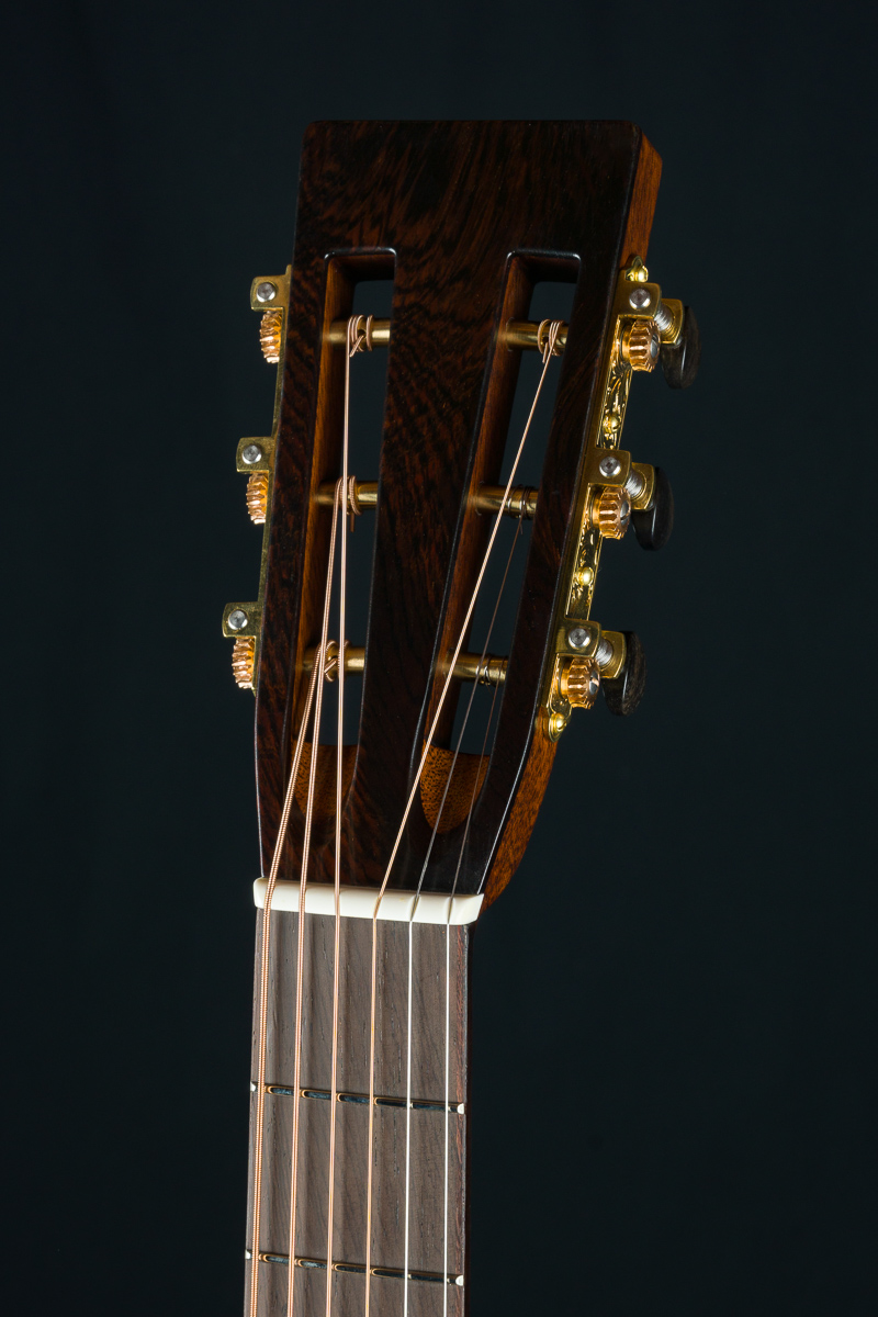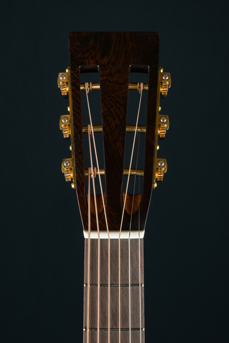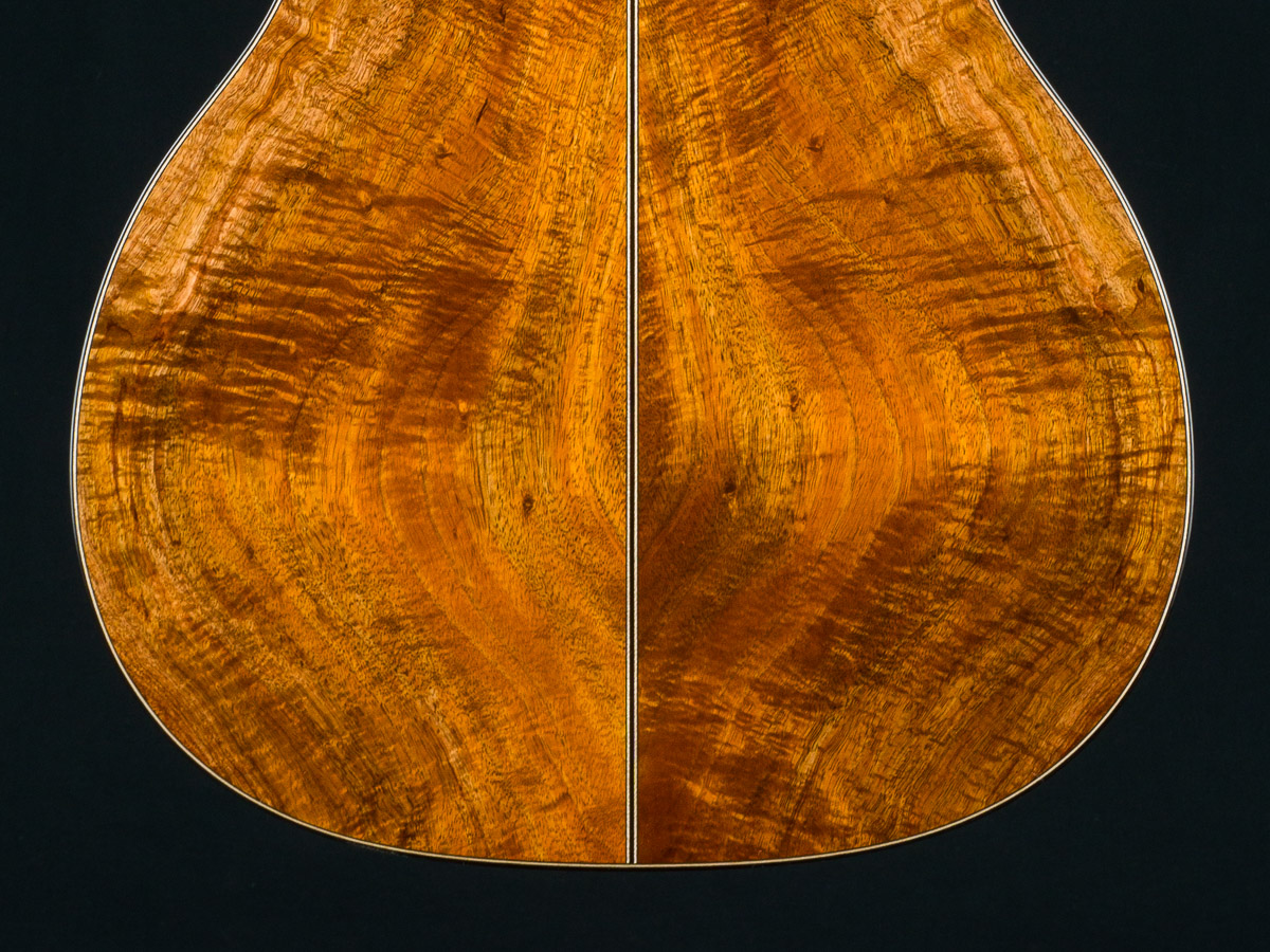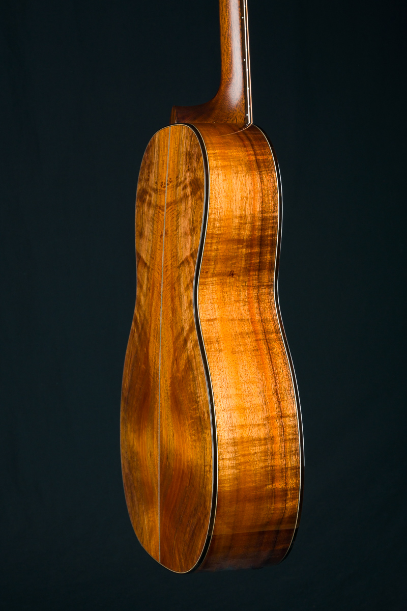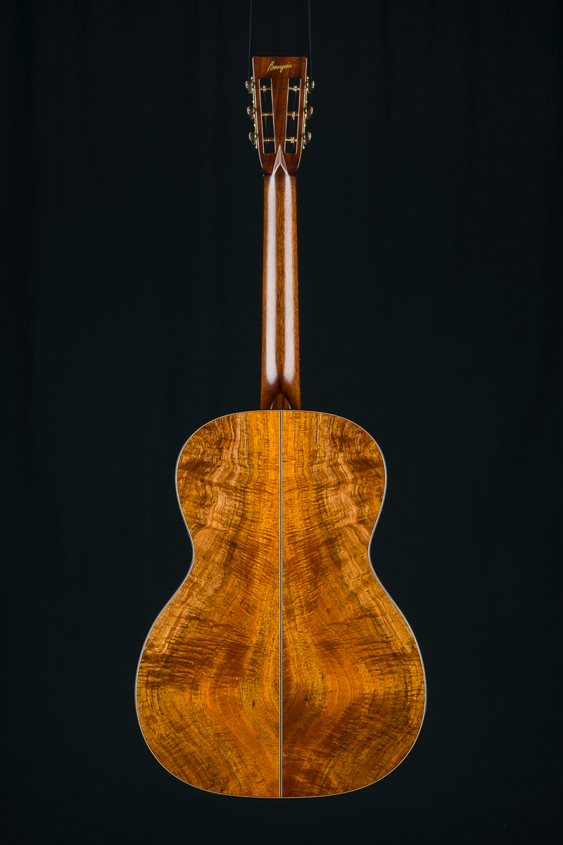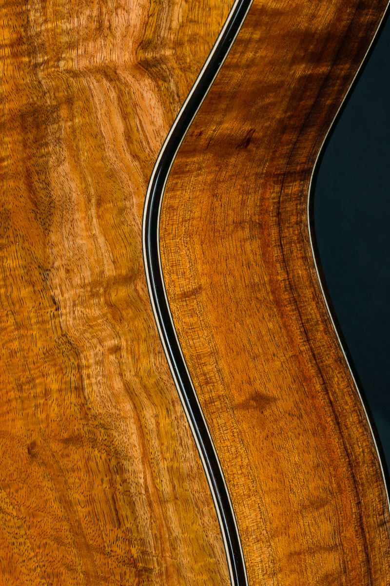 In the late 1920s, 12-fret, slotted head guitars began their historic transformation into the solid headstock and alternate body sizes found in guitars still to this day. This is a stunning custom OMS 12-Fret Custom, harkening back to the days of the early larger body slotted head Hawaiian guitars. Built by our our friends at Bourgeois Guitars in Lewiston, ME. this custom OMS features a stunning set of Premium Hawaiian Koa top, back and sides with flamed and ripple throughout. Custom Brazilian Rosewood fretboard, bridge and headstock overlay along with matching Brazilian Rosewood bindings, backstrip and custom segmented tile rosette with Maple border add deep contrast to the natural color Koa.