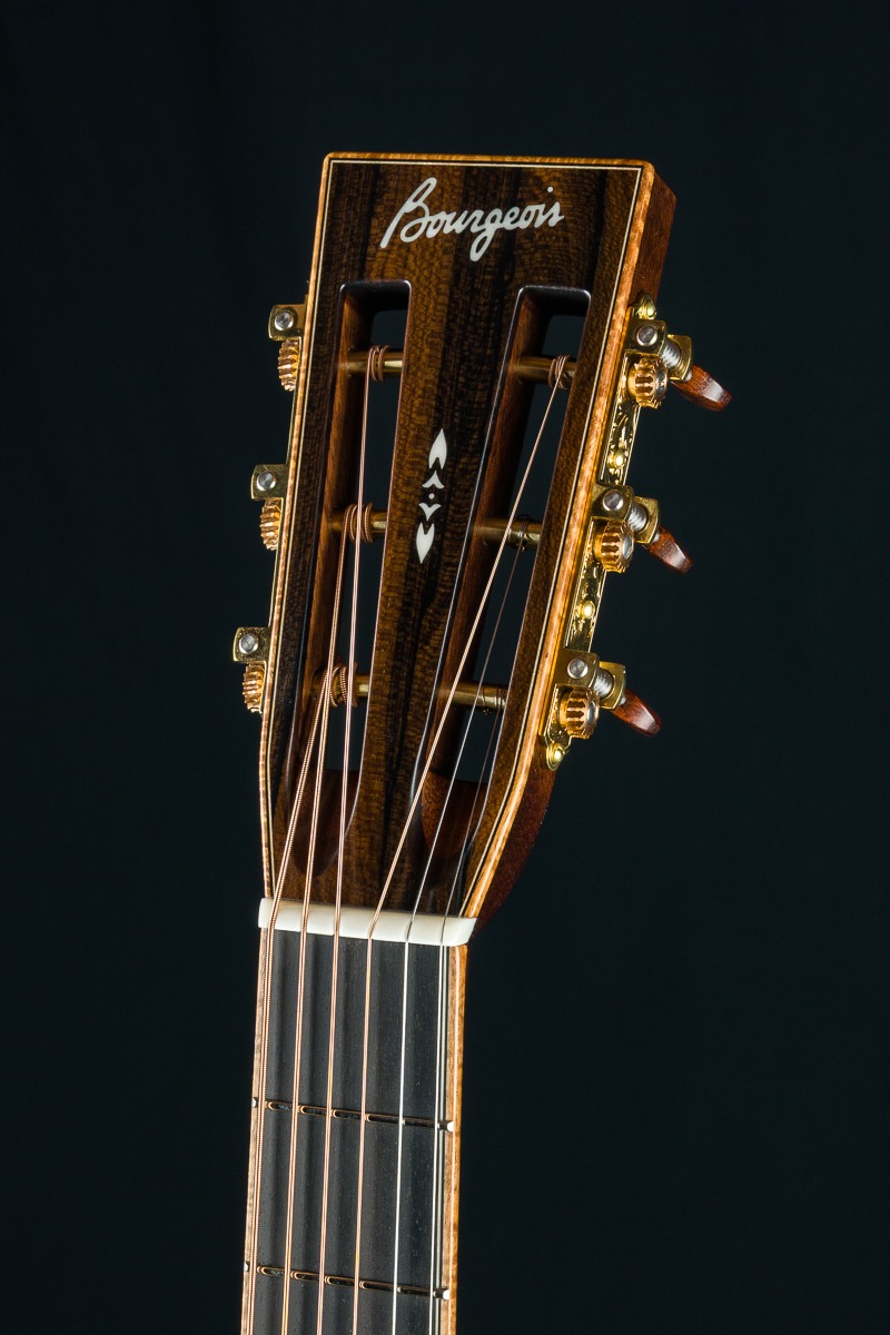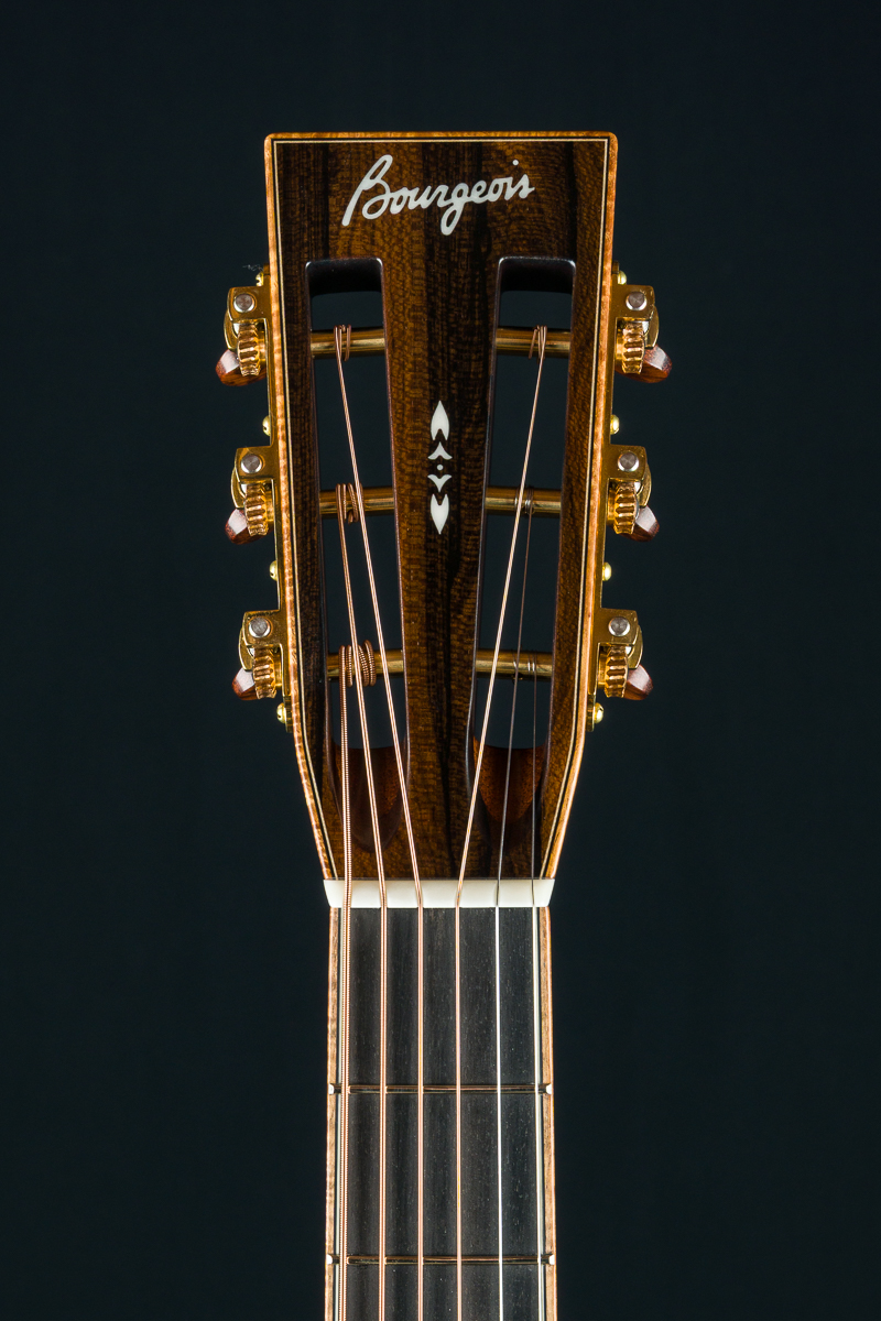 A great custom OMSC with slotted headstock from Bourgeois Guitars with hand picked tonewoods. This DB Signature Deluxe model features a great set of Madagascar Rosewood back and sides paired with an Aged Tone Adirondack Spruce top and bracing with figured Hawaiian Koa full body, fretboard and headstock bindings, DB Sig herringbone top purfling, Bone square and diamond inlays, Db Sig rosette and backstrip, Mahogany neck with slotted headstock, soft venetian cutaway, Gold Waverly tuners with Snakewood buttons, Animal Protein glue construction and more.