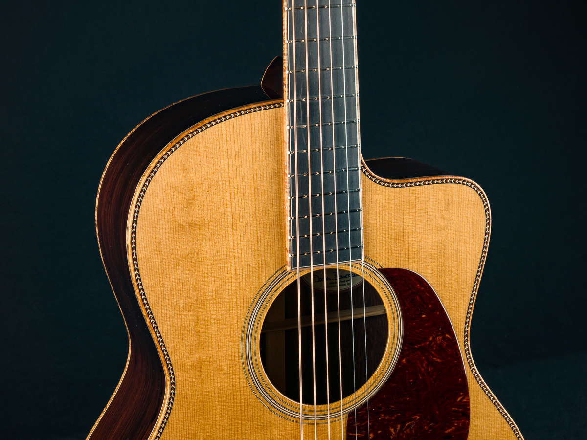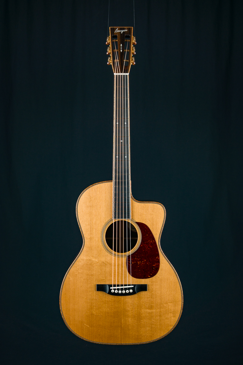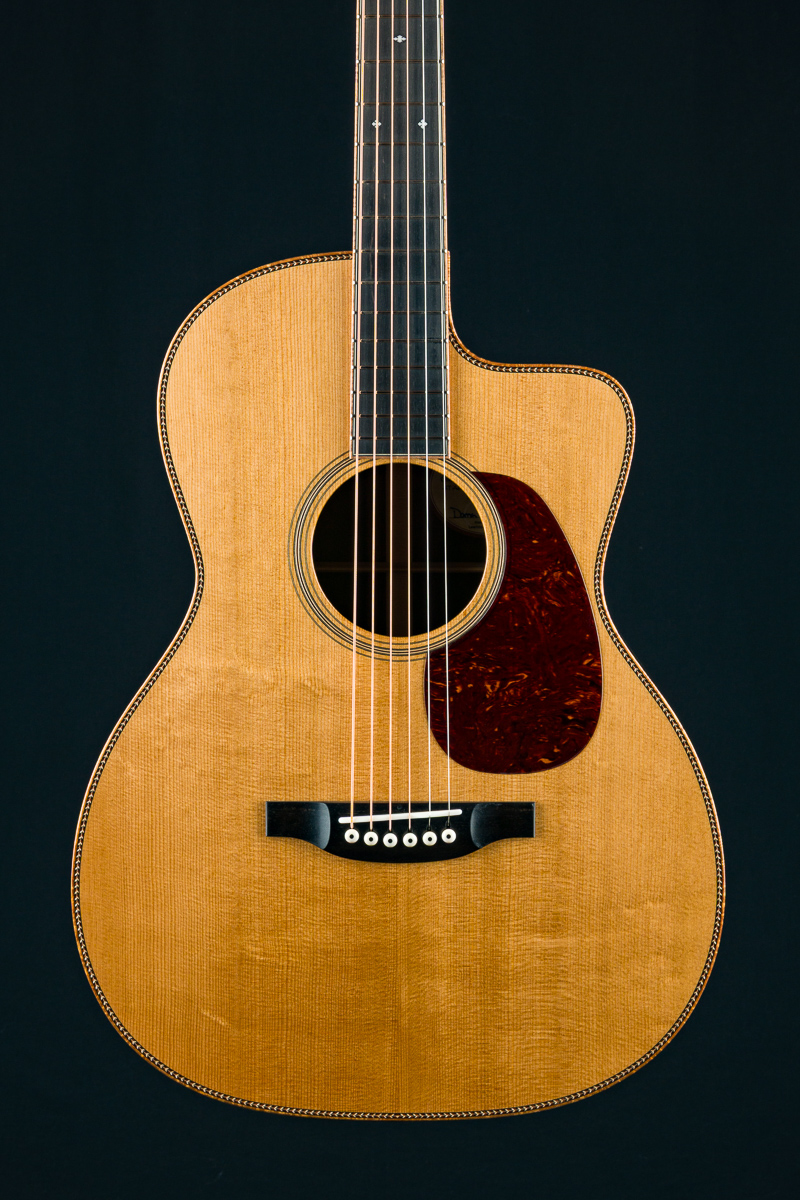 Dana Bourgeois thinks of the OMS as the 12-fret version of the OM, as opposed to the other way around. It boasts all the tonal properties of the OM, with the added power and fullness of a 12-fret. The 12-fret design places the soundhole closer to the waist of the guitar and locates the bridge at the widest part of the lower bout. This is where it can most efficiently drive the top. This throwback design allows maximum power with minimum playing effort while affording a loose, open quality to the sound. If you find yourself missing those extra two frets on standard 12-fret guitars, take them back!  The OMSC has the added soft cutaway with extra frets to spare.