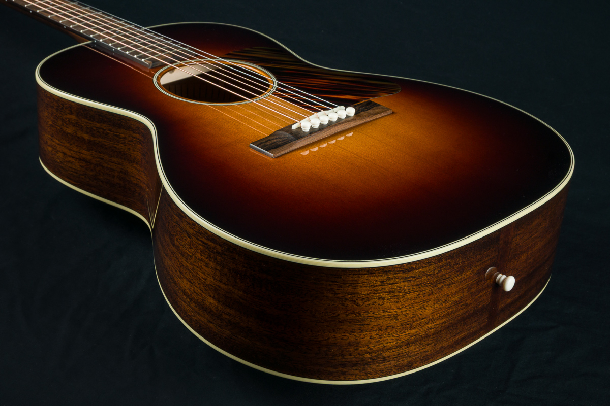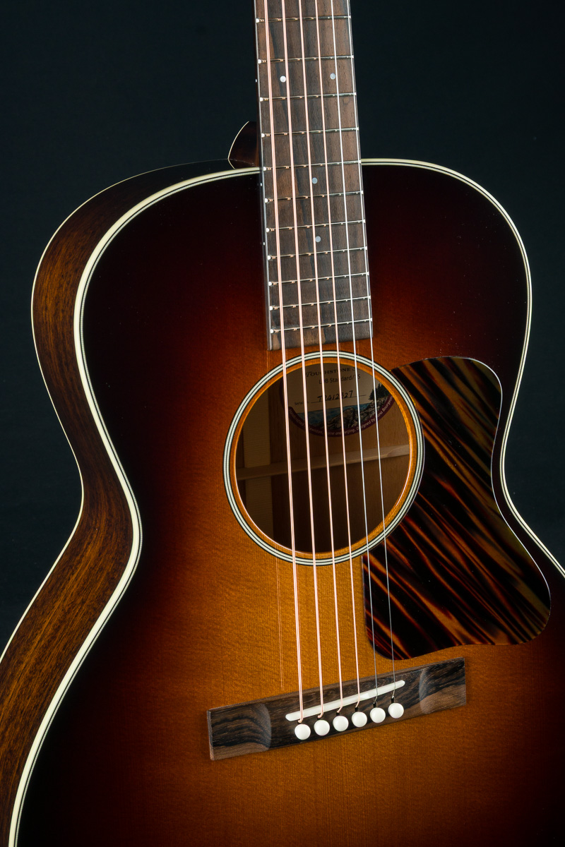 The Touchstone L-DBO Standard features select Mahogany back and sides and a torrefied Sitka Spruce soundboard with vintage sunburst, Ziricote fretboard and bridge, Ivoroid body bindings, Adirondack Spruce bracing, Schaller Grand Tune Nickel tuners, bone nut and saddle, 1 23/32″ nut width, 2.2″ saddle spacing, 25″ short scale length and more.