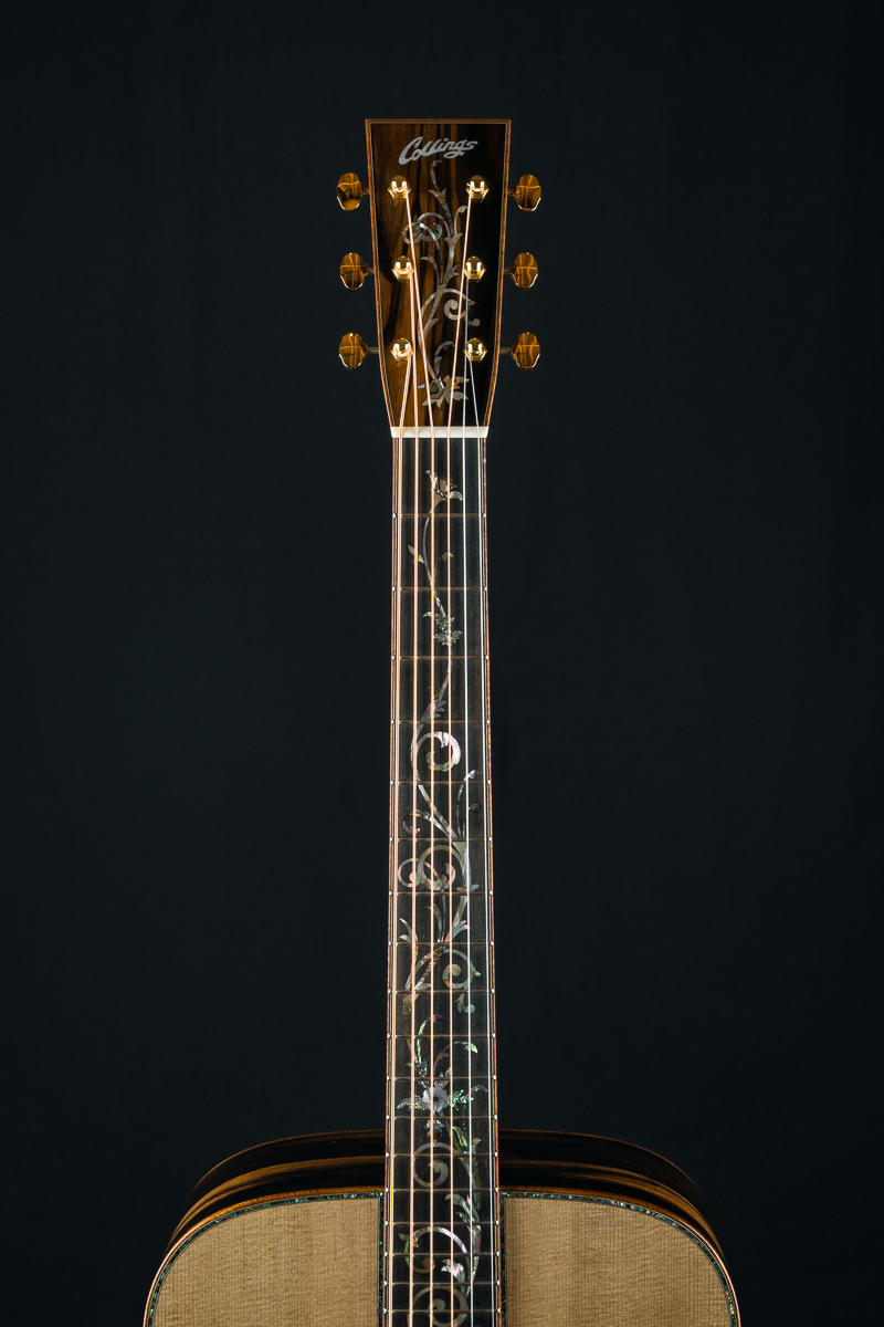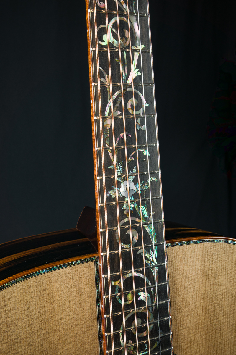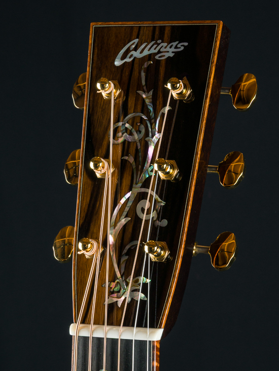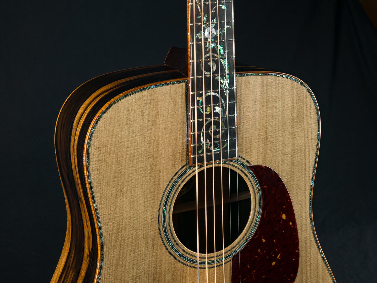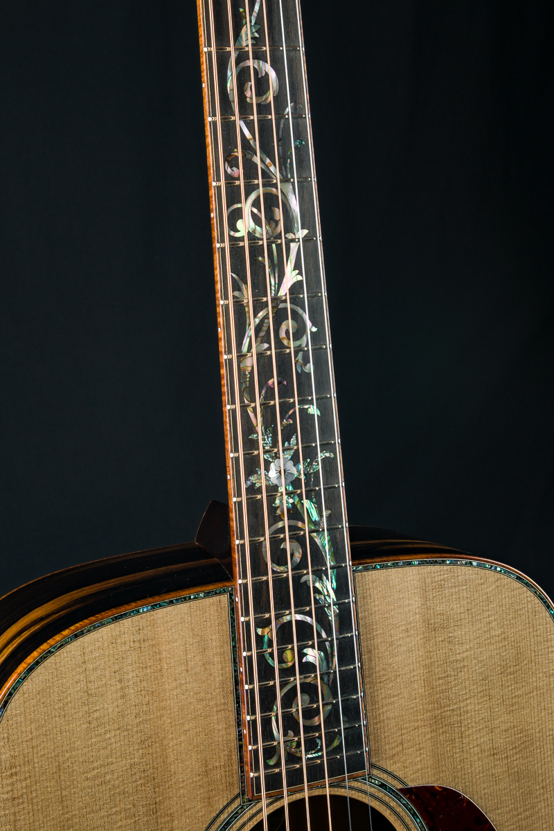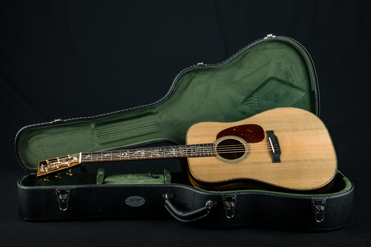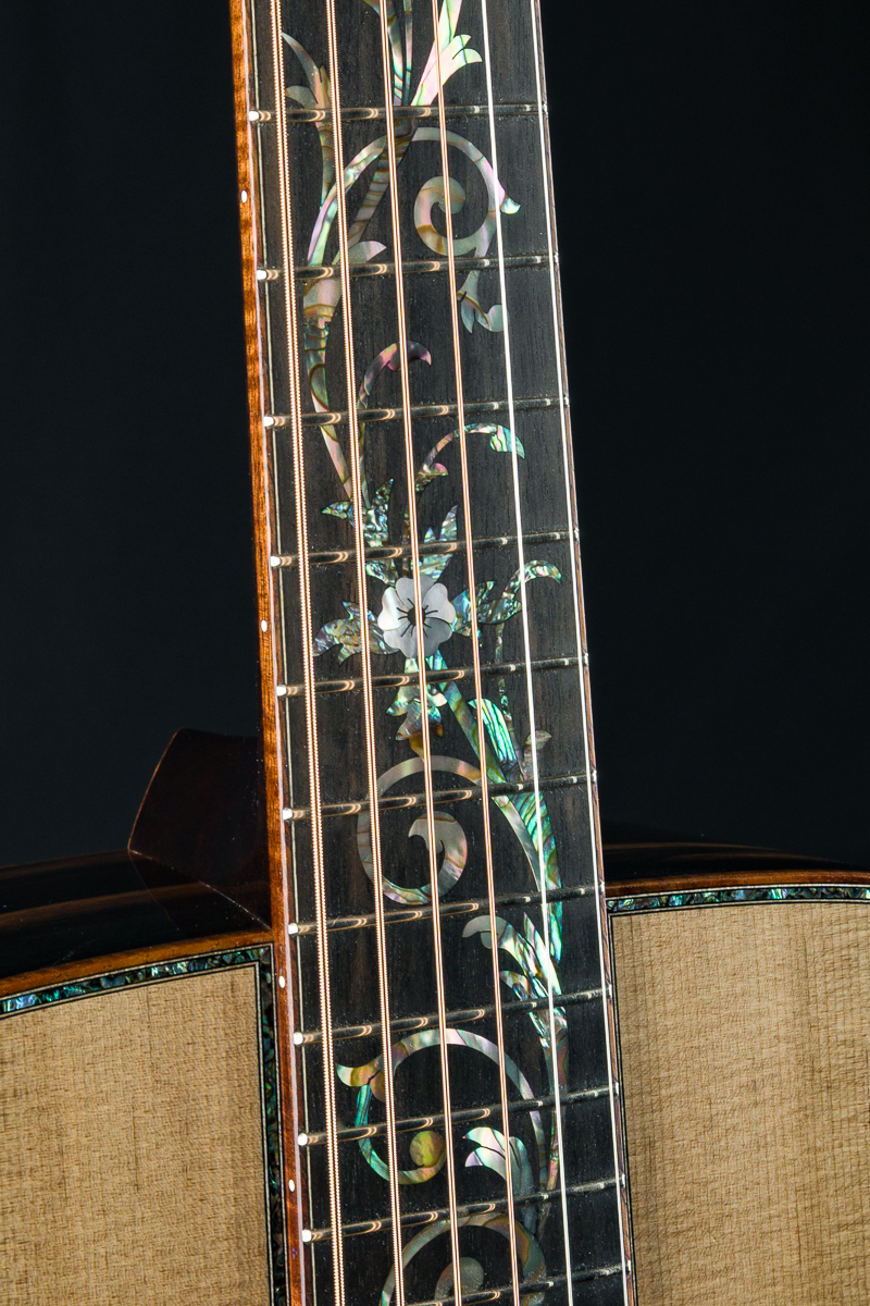 Other features include Striped African Ebony headstock overlay, black Ebony fretboard and bridge, Honduran Mahogany neck with volute, figured Koa heelcap and wedge, Gold Waverly tuners, Ebony pins with Pearl dots, tortoise pickguard, 1 23/32″ custom nut width and more.
