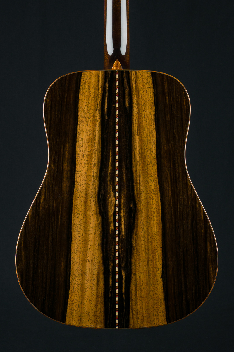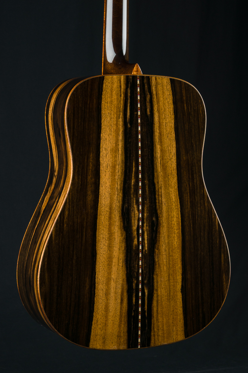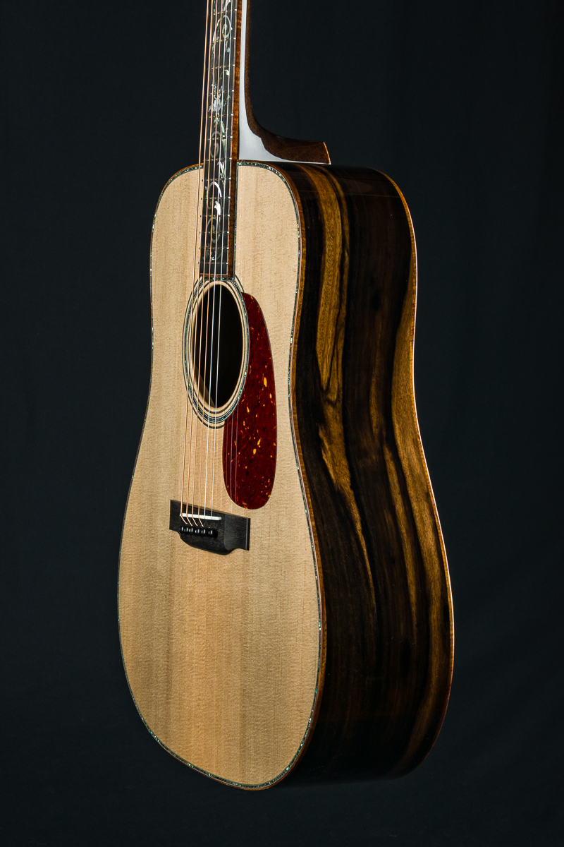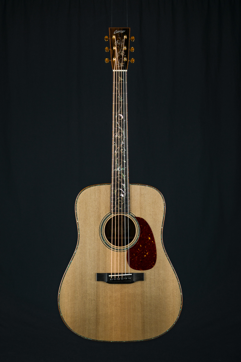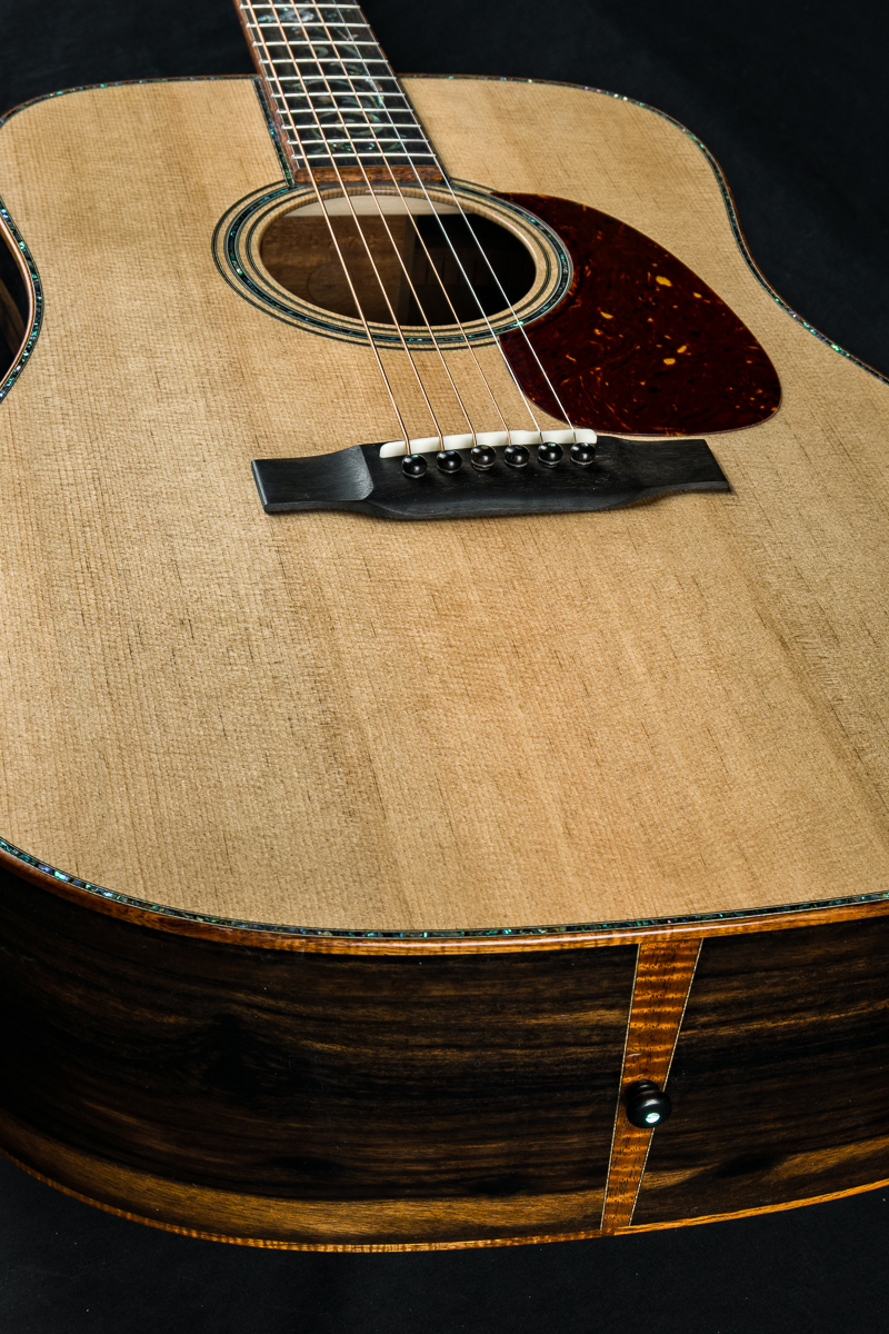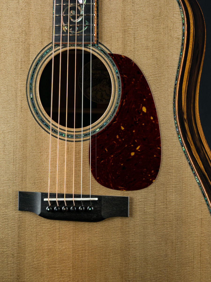 Other features include Striped African Ebony headstock overlay, black Ebony fretboard and bridge, Honduran Mahogany neck with volute, figured Koa heelcap and wedge, Gold Waverly tuners, Ebony pins with Pearl dots, tortoise pickguard, 1 23/32″ custom nut width and more.