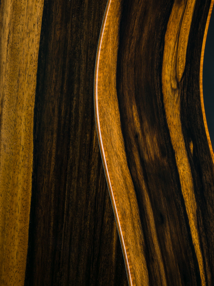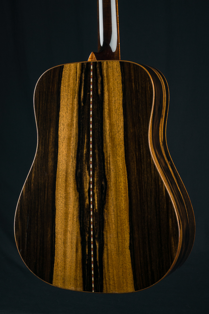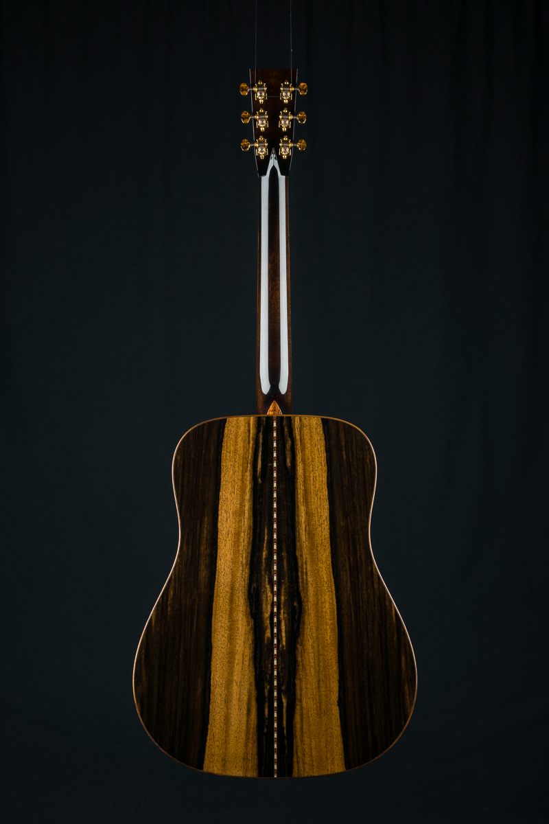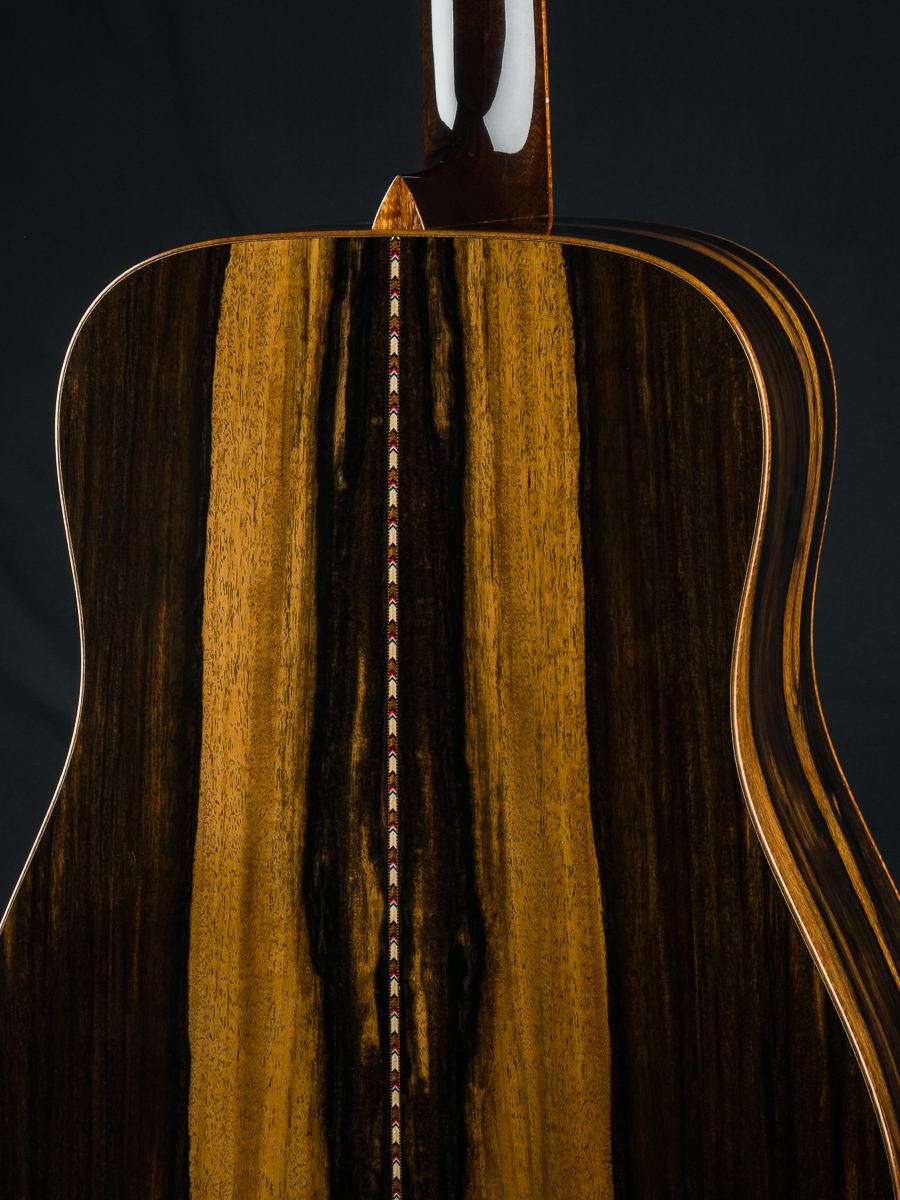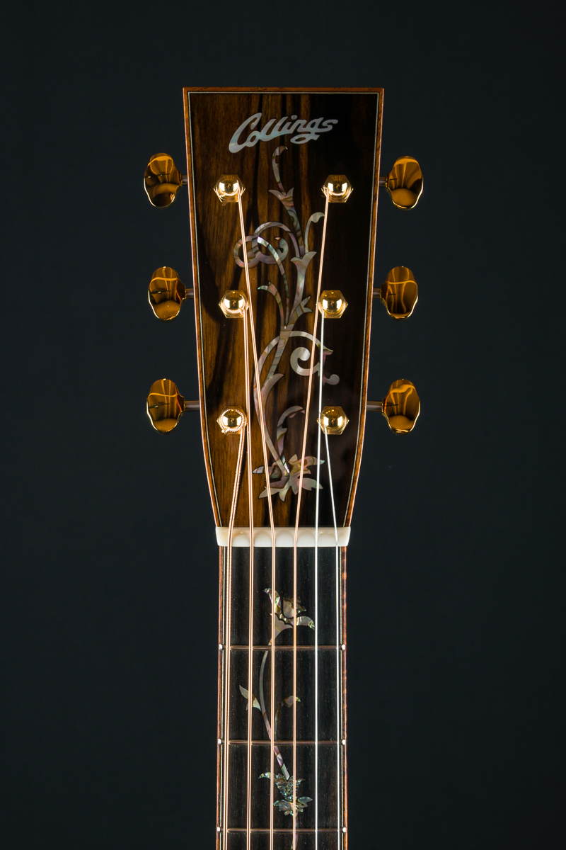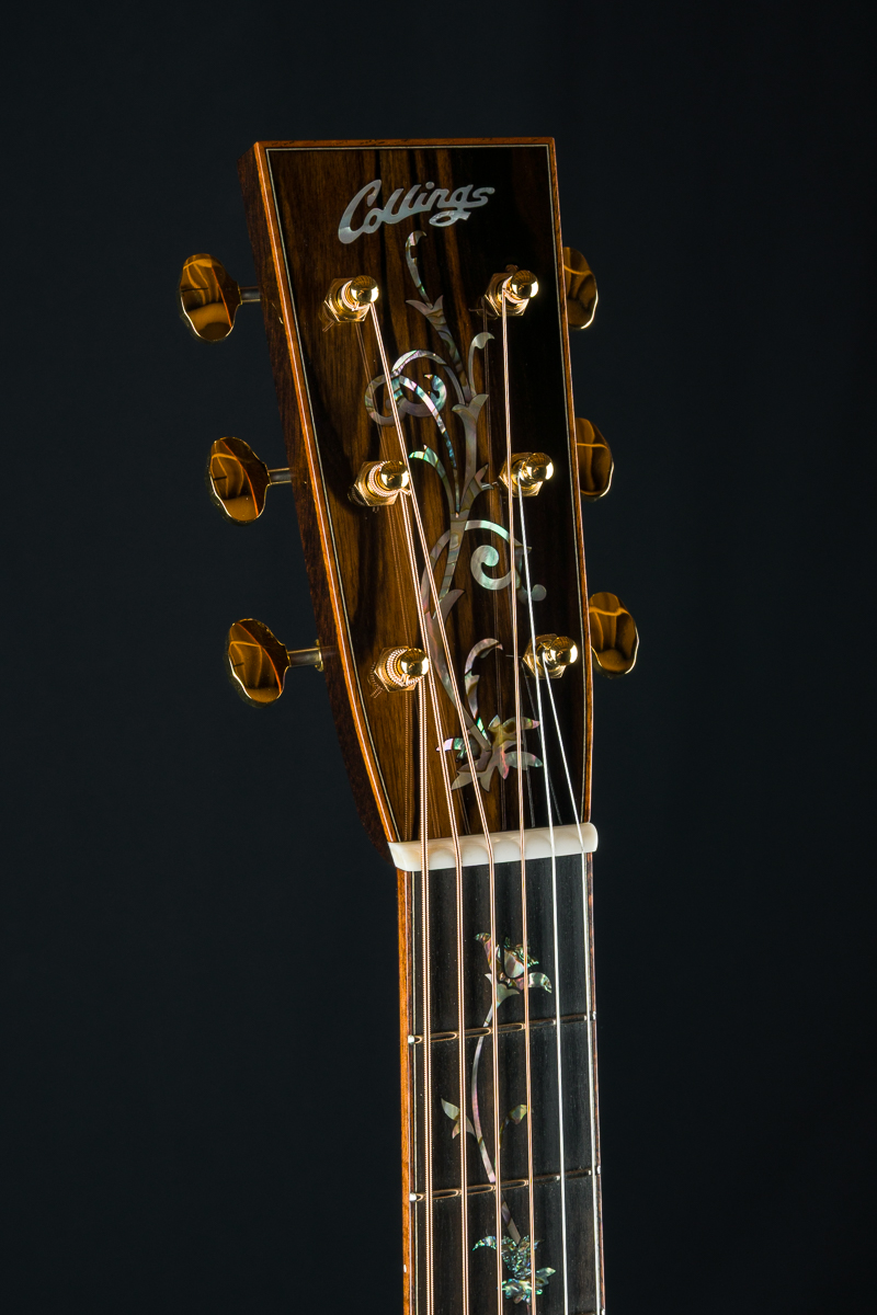 Other features include Striped African Ebony headstock overlay, black Ebony fretboard and bridge, Honduran Mahogany neck with volute, figured Koa heelcap and wedge, Gold Waverly tuners, Ebony pins with Pearl dots, tortoise pickguard, 1 23/32″ custom nut width and more.