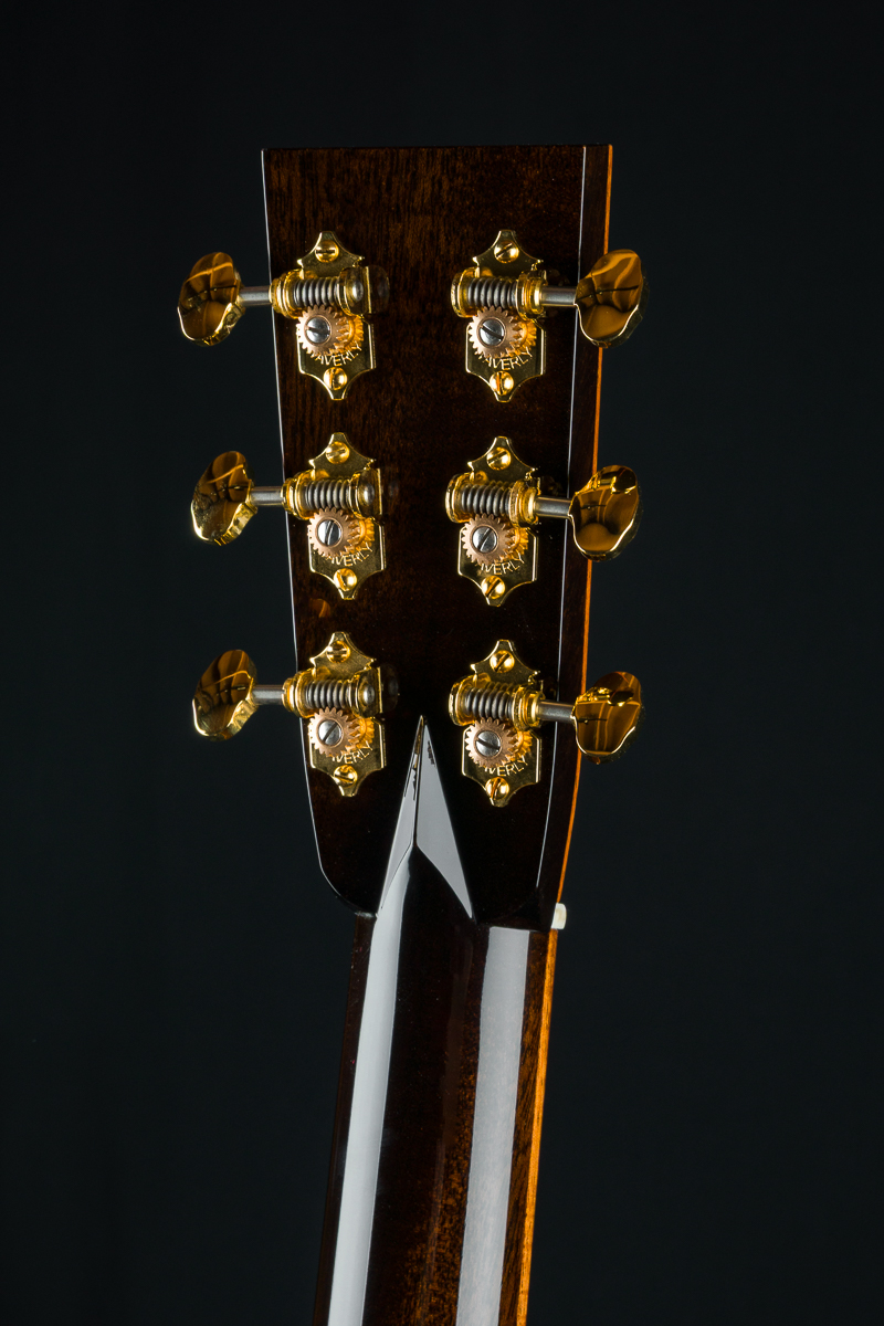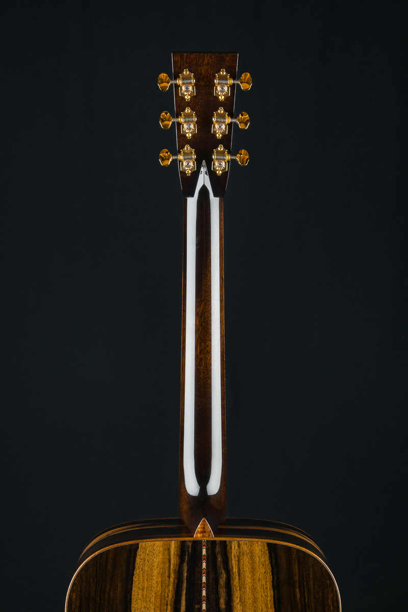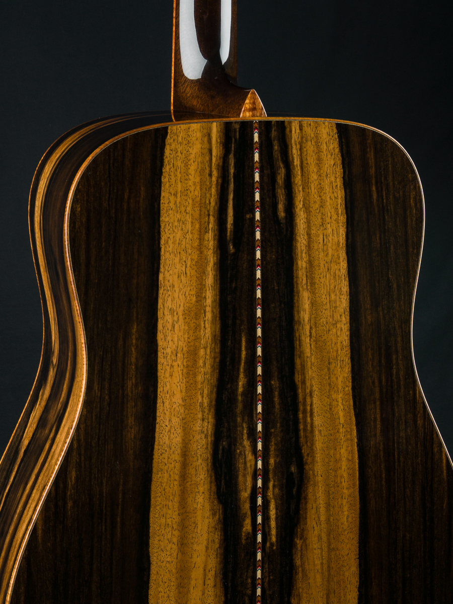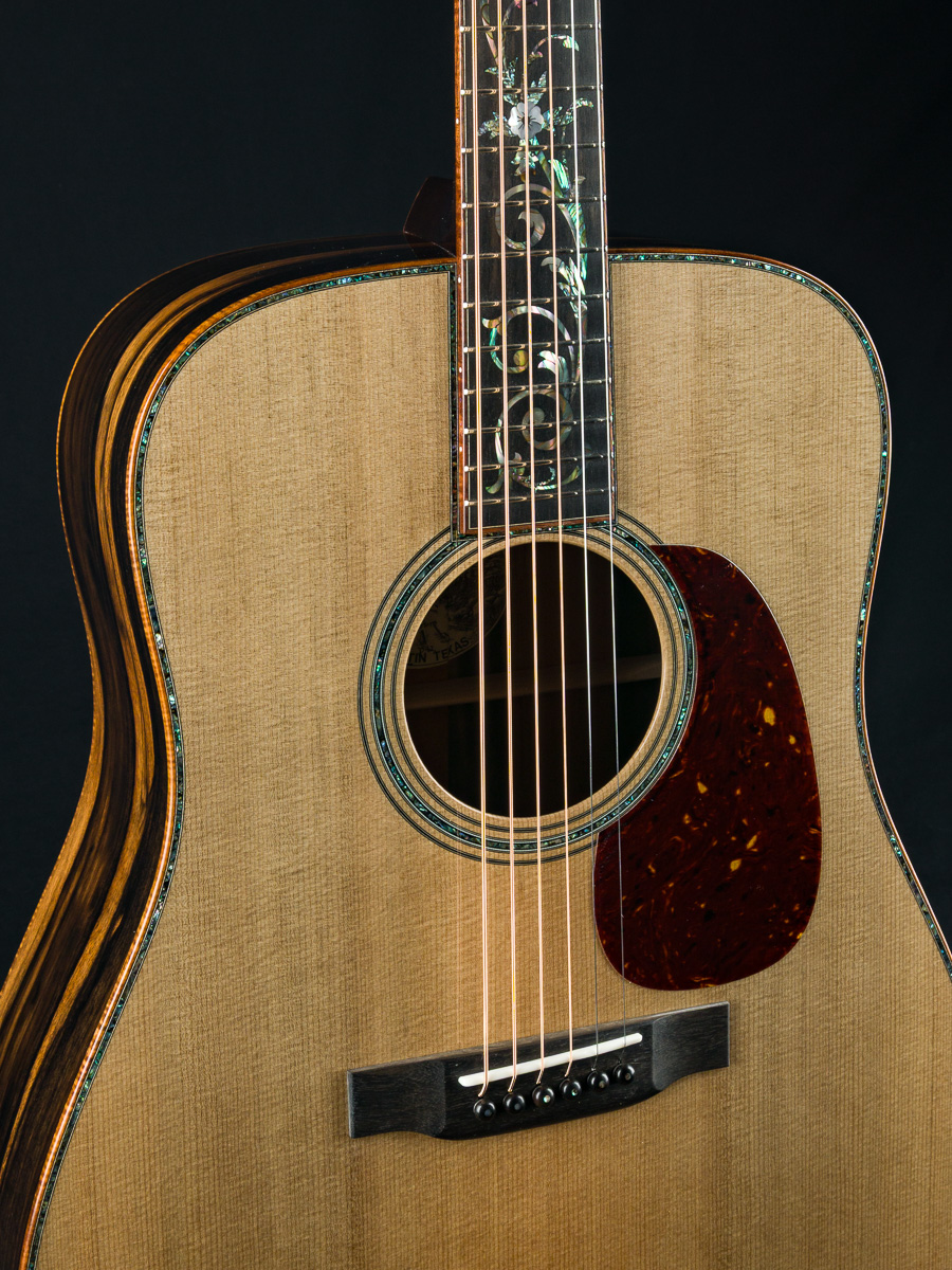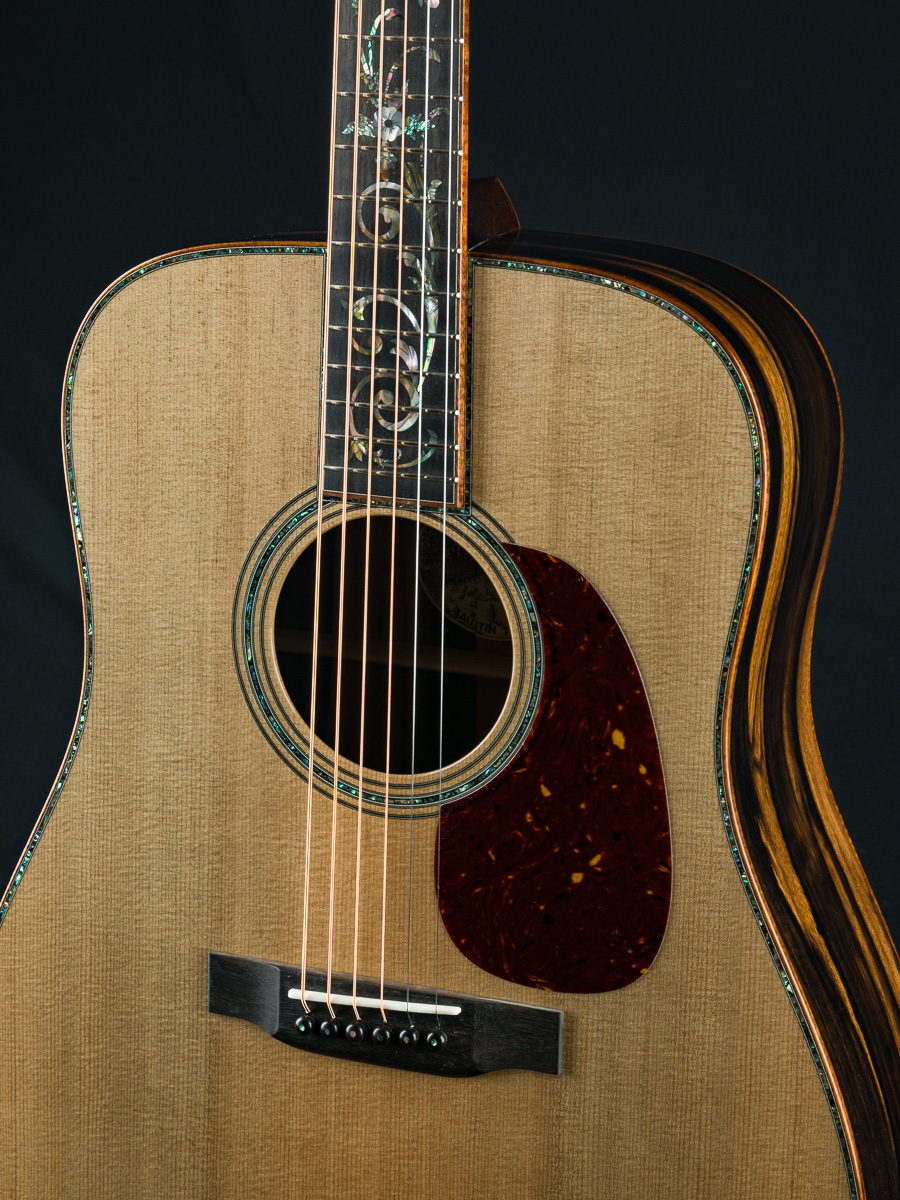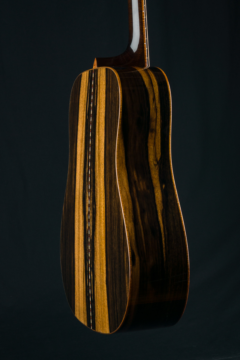 Other features include Striped African Ebony headstock overlay, black Ebony fretboard and bridge, Honduran Mahogany neck with volute, figured Koa heelcap and wedge, Gold Waverly tuners, Ebony pins with Pearl dots, tortoise pickguard, 1 23/32″ custom nut width and more.