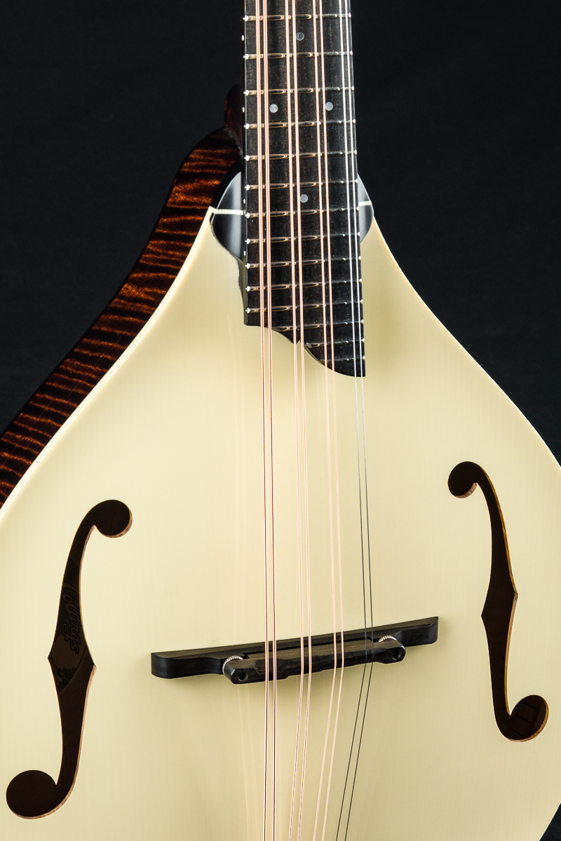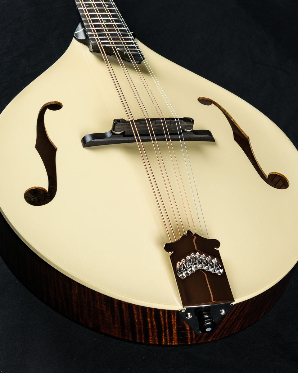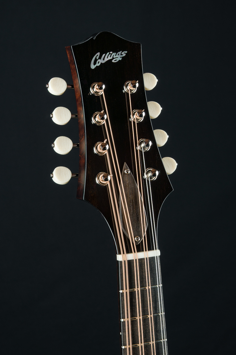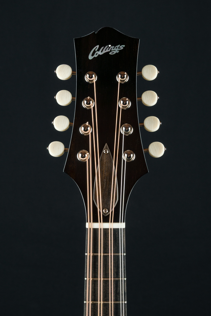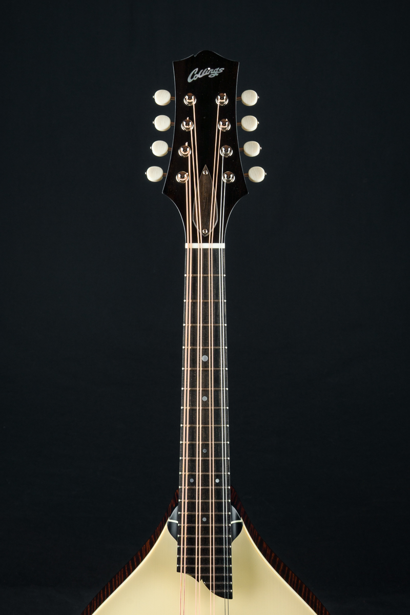This mandola was featured at the 2026 NAMM Show in Anaheim, CA and features a custom cream gloss top, Walnut stained back, sides and neck and Ivoroid top bindings. Other features include Ebony fretboard and adjustable bridge, Nickel tuners with Ivoroid buttons, Collings Nickel one-piece tailpiece, Pearl dot inlays and logo, Ebony headstock overlay, 1 5/16″ Bone nut, 1 11/16″ saddle spacing and more.
