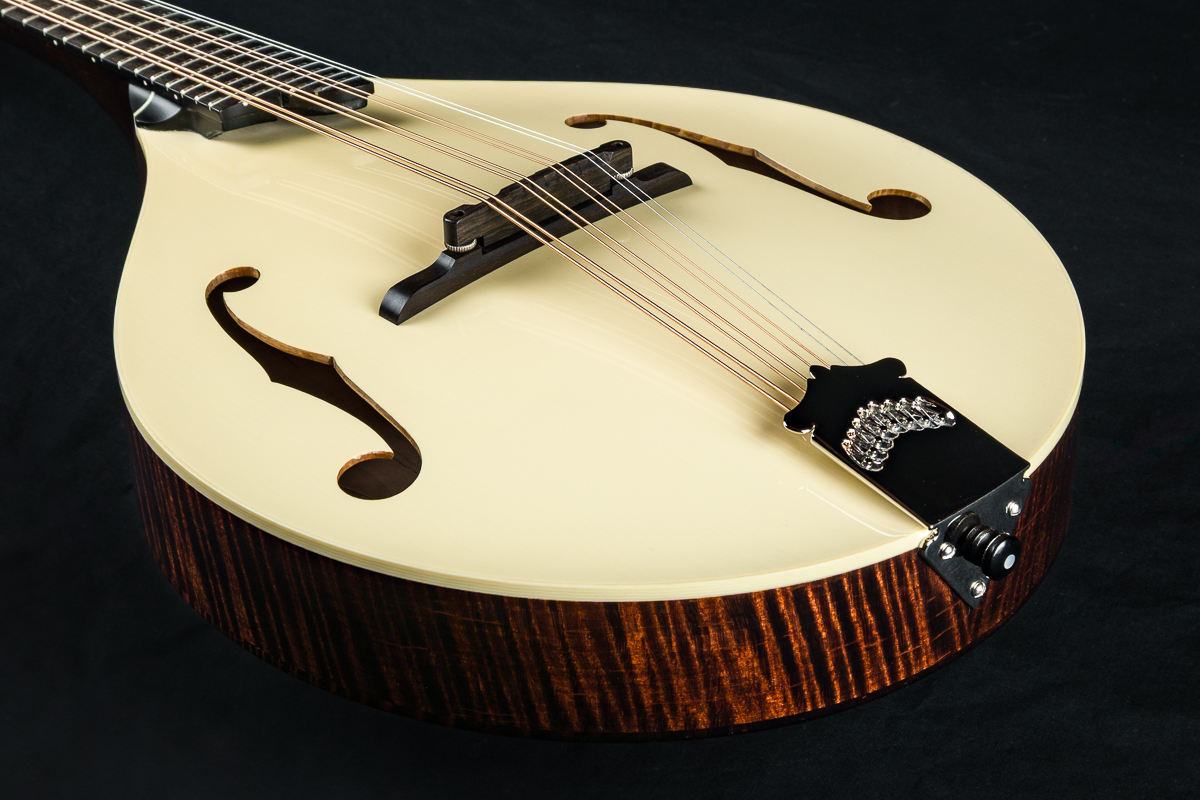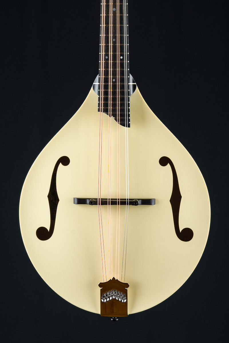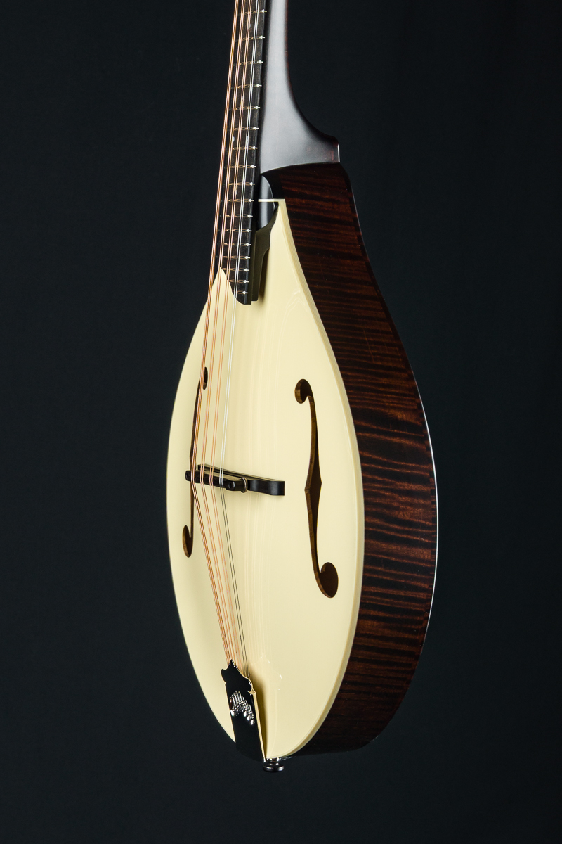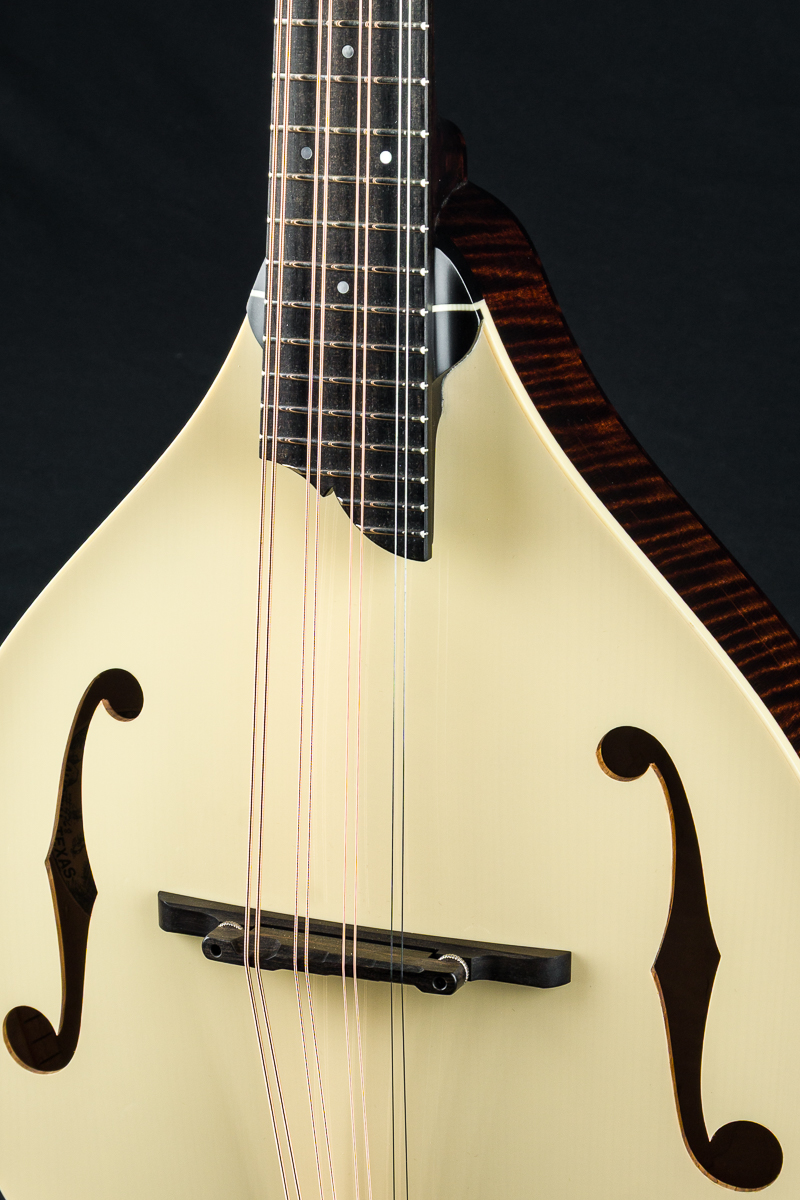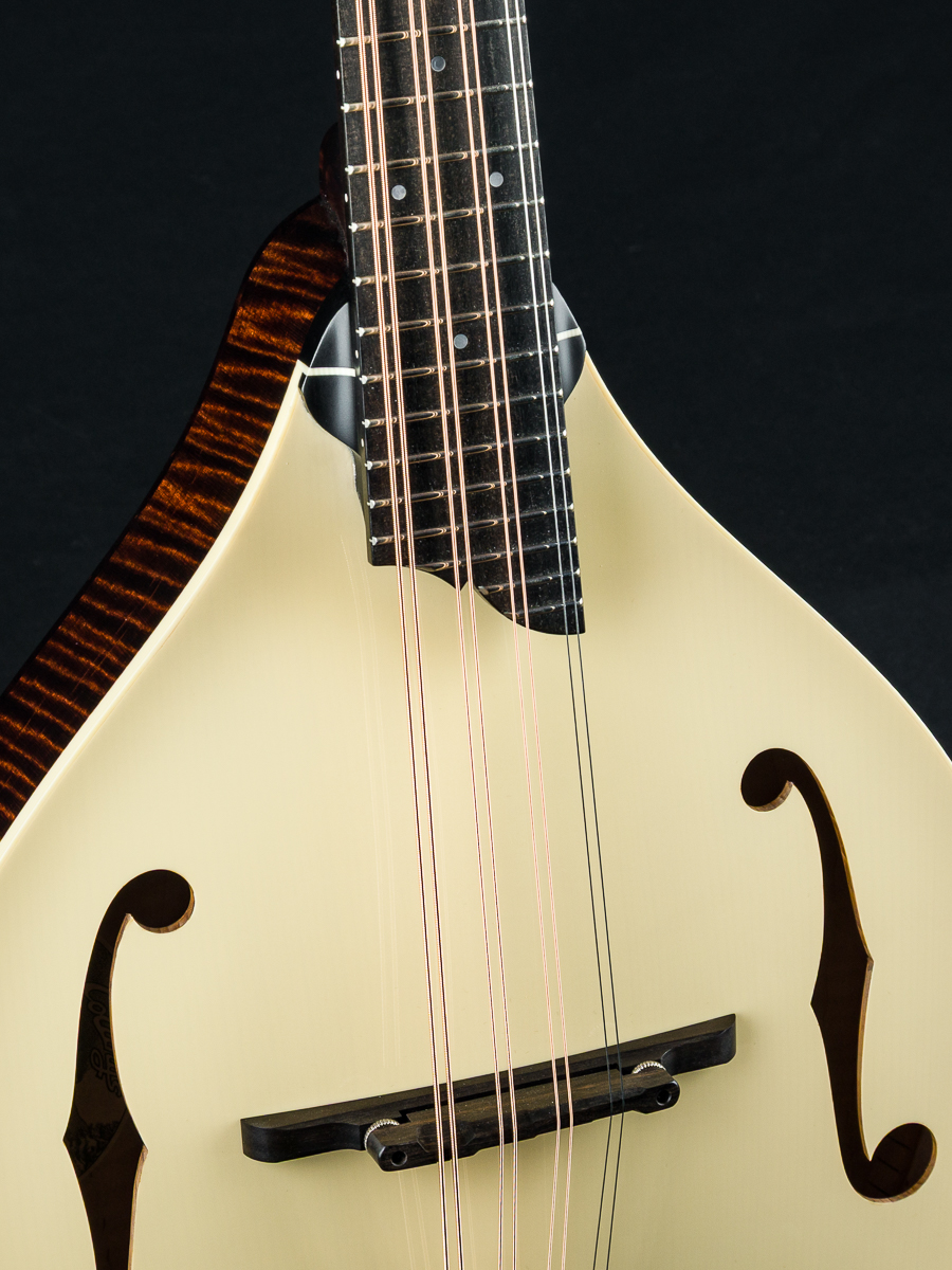 This mandola was featured at the 2026 NAMM Show in Anaheim, CA and features a custom cream gloss top, Walnut stained back, sides and neck and Ivoroid top bindings. Other features include Ebony fretboard and adjustable bridge, Nickel tuners with Ivoroid buttons, Collings Nickel one-piece tailpiece, Pearl dot inlays and logo, Ebony headstock overlay, 1 5/16″ Bone nut, 1 11/16″ saddle spacing and more.