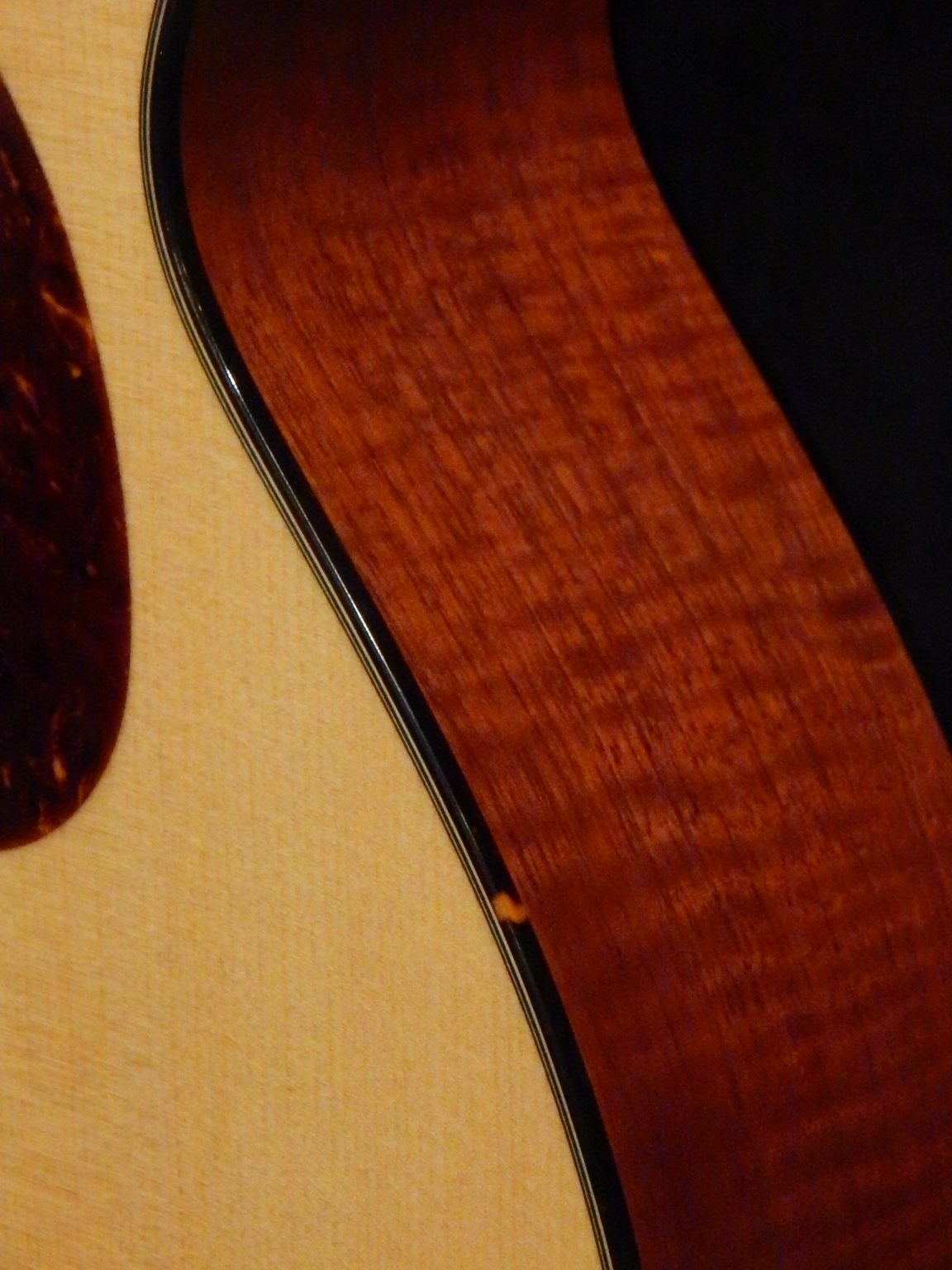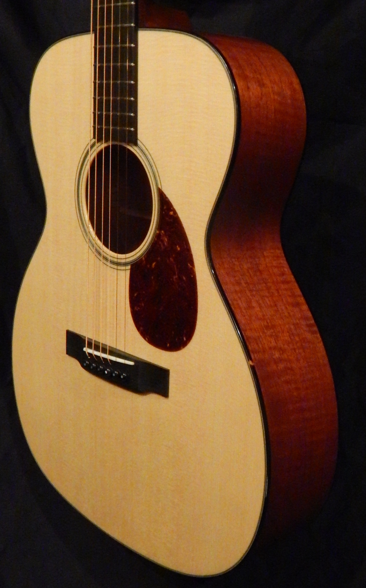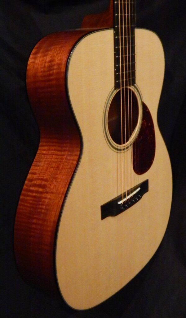 This great set of Flamed Red Mountain Cedar for the back and sides comes from the mountains of Peru. It is light weight yet stable, and has a high level of vibration. Paired with a premium Sitka Spruce top with Adirondack braces, this guitar sings in your hands. Other features are Figured Honduran Mahogany neck that compliments the Mountain Cedar and the custom 1 3/4″ nut width for comfort. This guitar is a great rounded sounding OM with balance and clarity right from the mountain top.