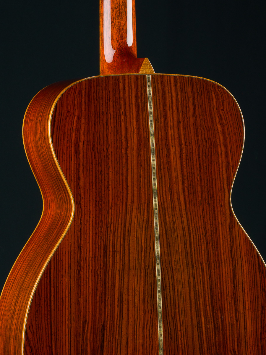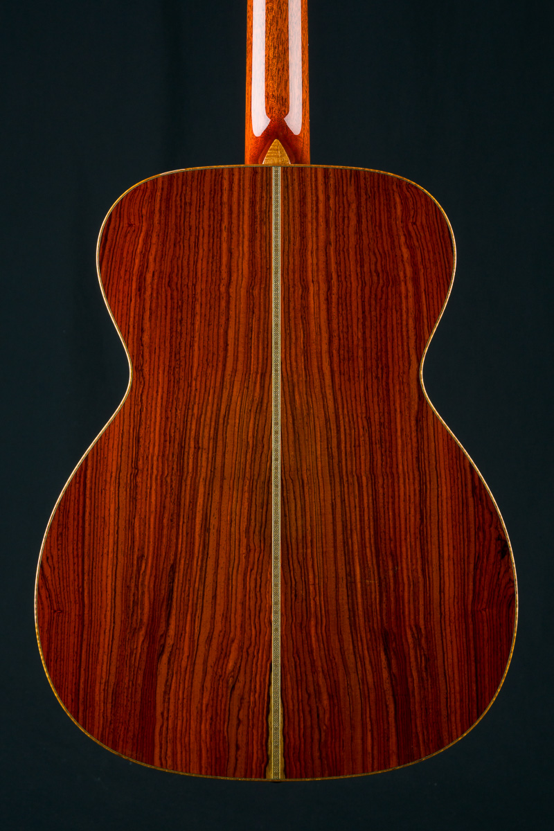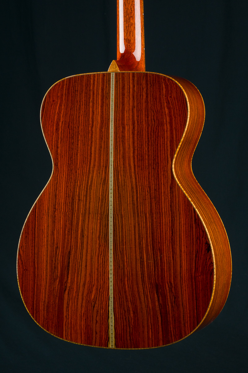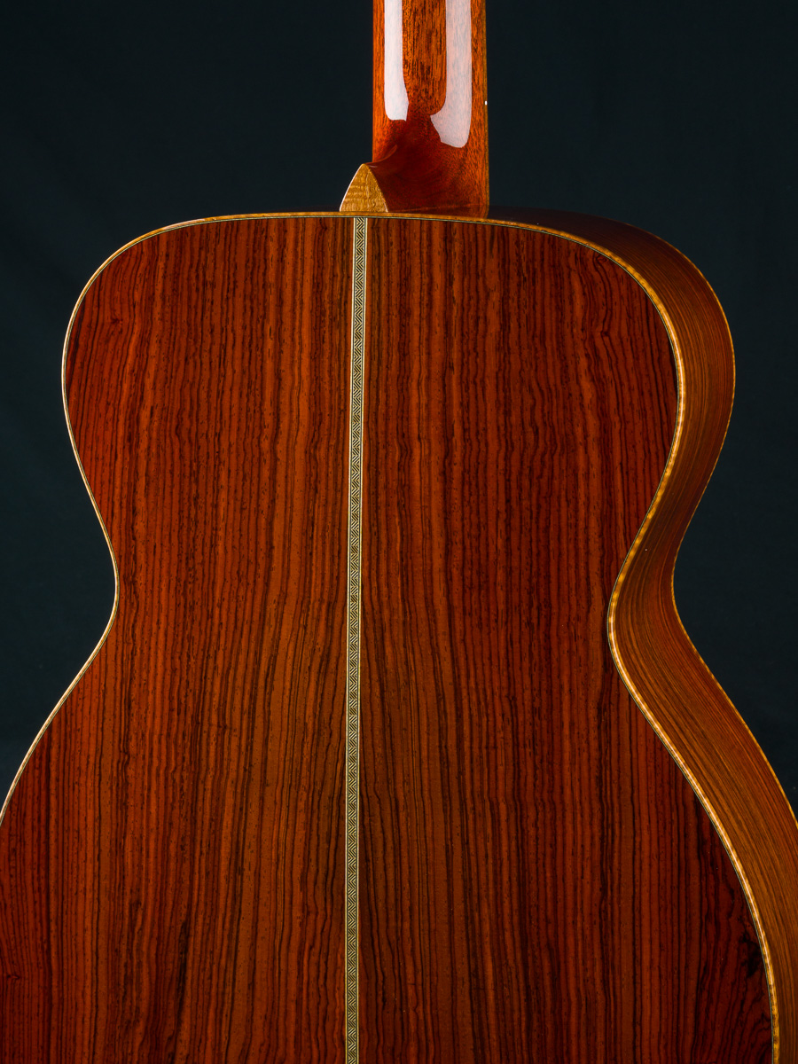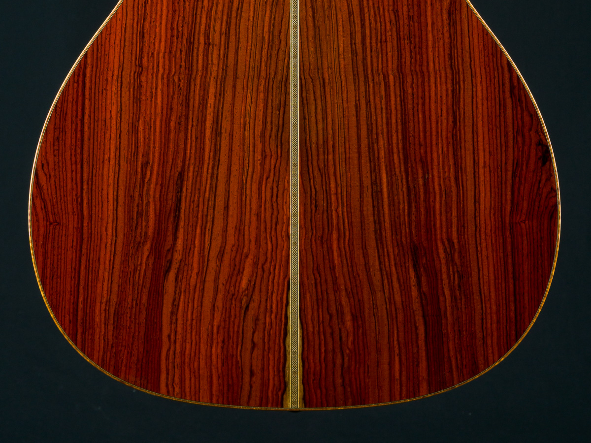 Cocobolo (Dalbergia retusa) is a true Rosewood from Central America that compares with Brazilian Rosewood in terms of tonal quality, warmth and stunning beauty. It is denser and harder than most other Rosewoods and thus creates great sustain and a powerful tone. Paired with the 50+ year old Old Growth Sitka Spruce top, this guitar has the warmth, presence and clarity with a broken in feel that is versatile for all styles of playing.