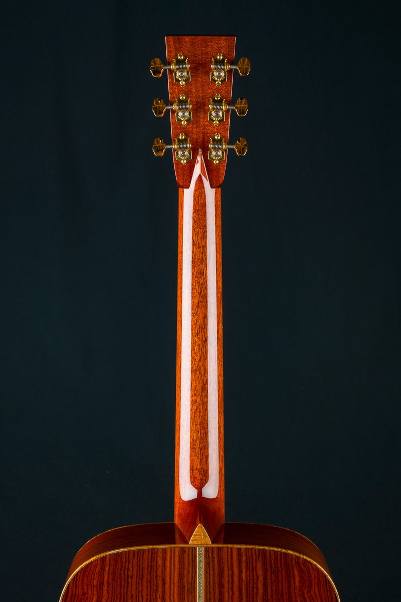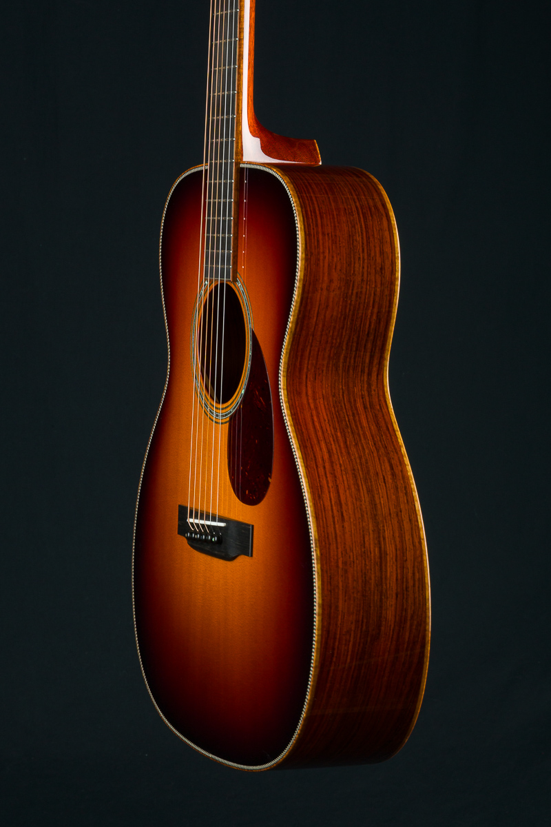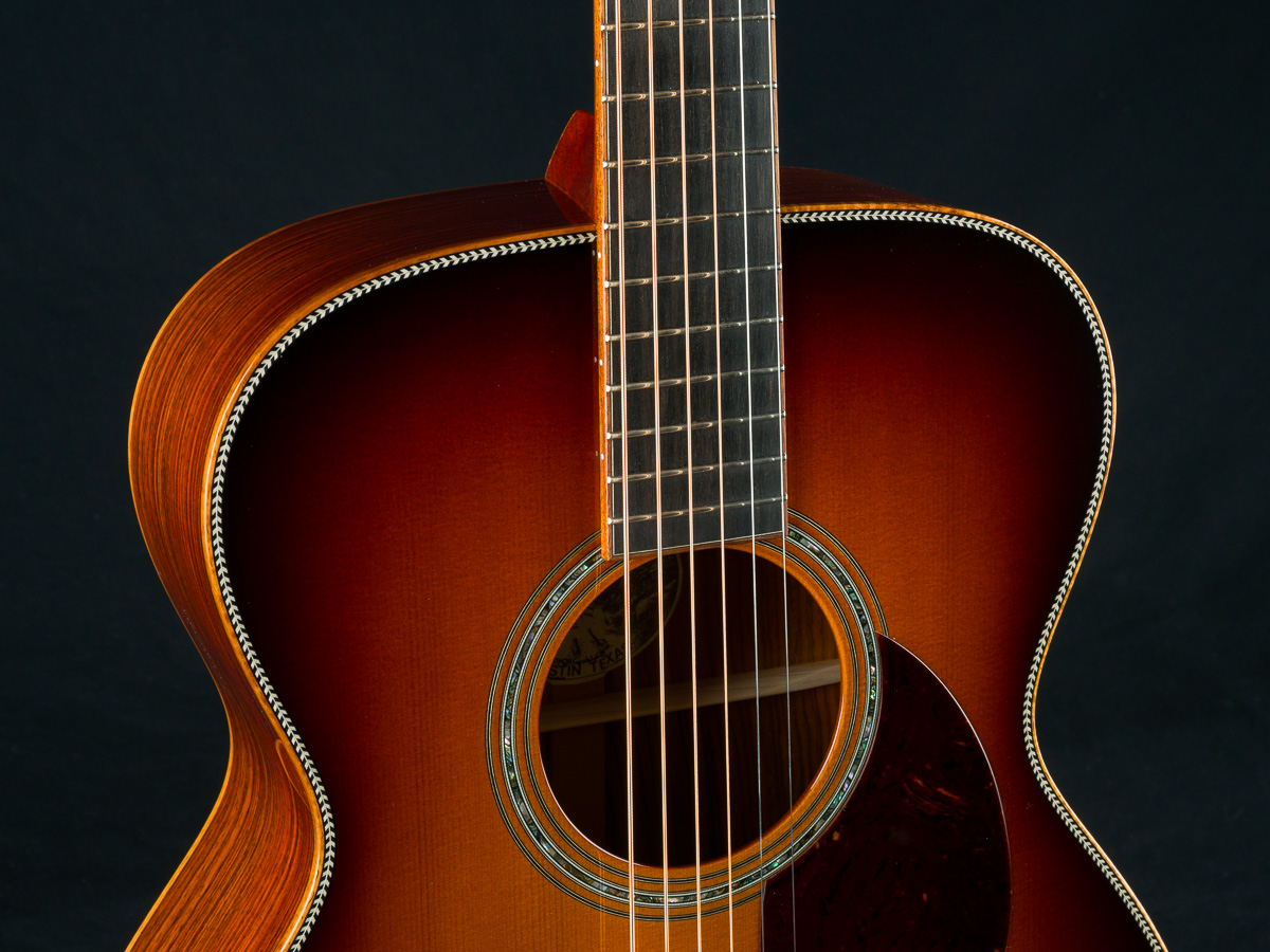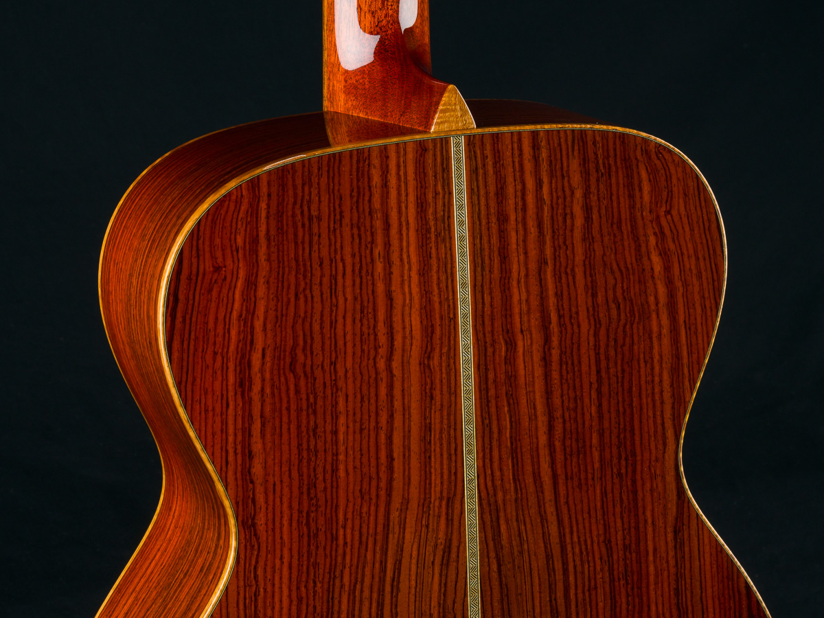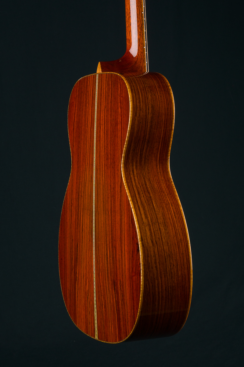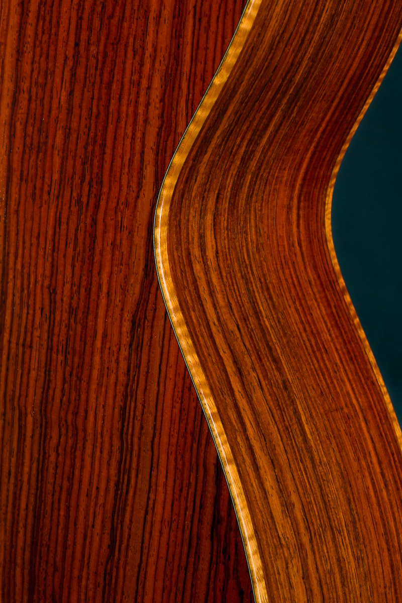 Cocobolo (Dalbergia retusa) is a true Rosewood from Central America that compares with Brazilian Rosewood in terms of tonal quality, warmth and stunning beauty. It is denser and harder than most other Rosewoods and thus creates great sustain and a powerful tone. Paired with the 50+ year old Old Growth Sitka Spruce top, this guitar has the warmth, presence and clarity with a broken in feel that is versatile for all styles of playing.