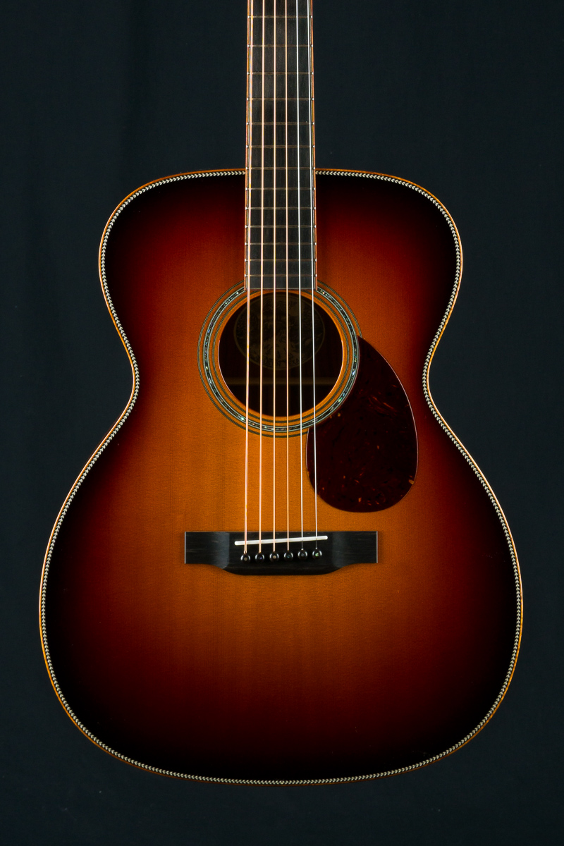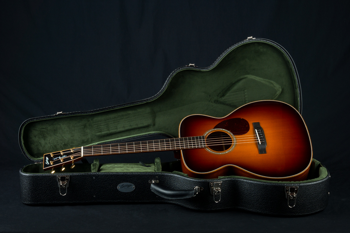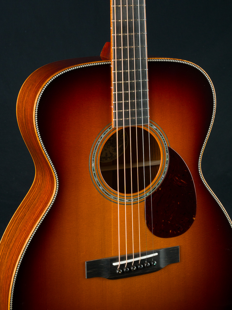 Another great custom from our friends at Colling in Austin, TX. This custom OM2HG features a colorful red set of Cocobolo for the back and sides with contrasting dark grain paired with a German Spruce top with rich vibrant sunburst. Fully wrapped in figured Hawaiian Koa full body, fretboard and headstock bindings, along with custom Abalone rosette and flourish peghead inlay, Adirondack Spruce bracing, no tongue brace and Gold Waverly tuners.