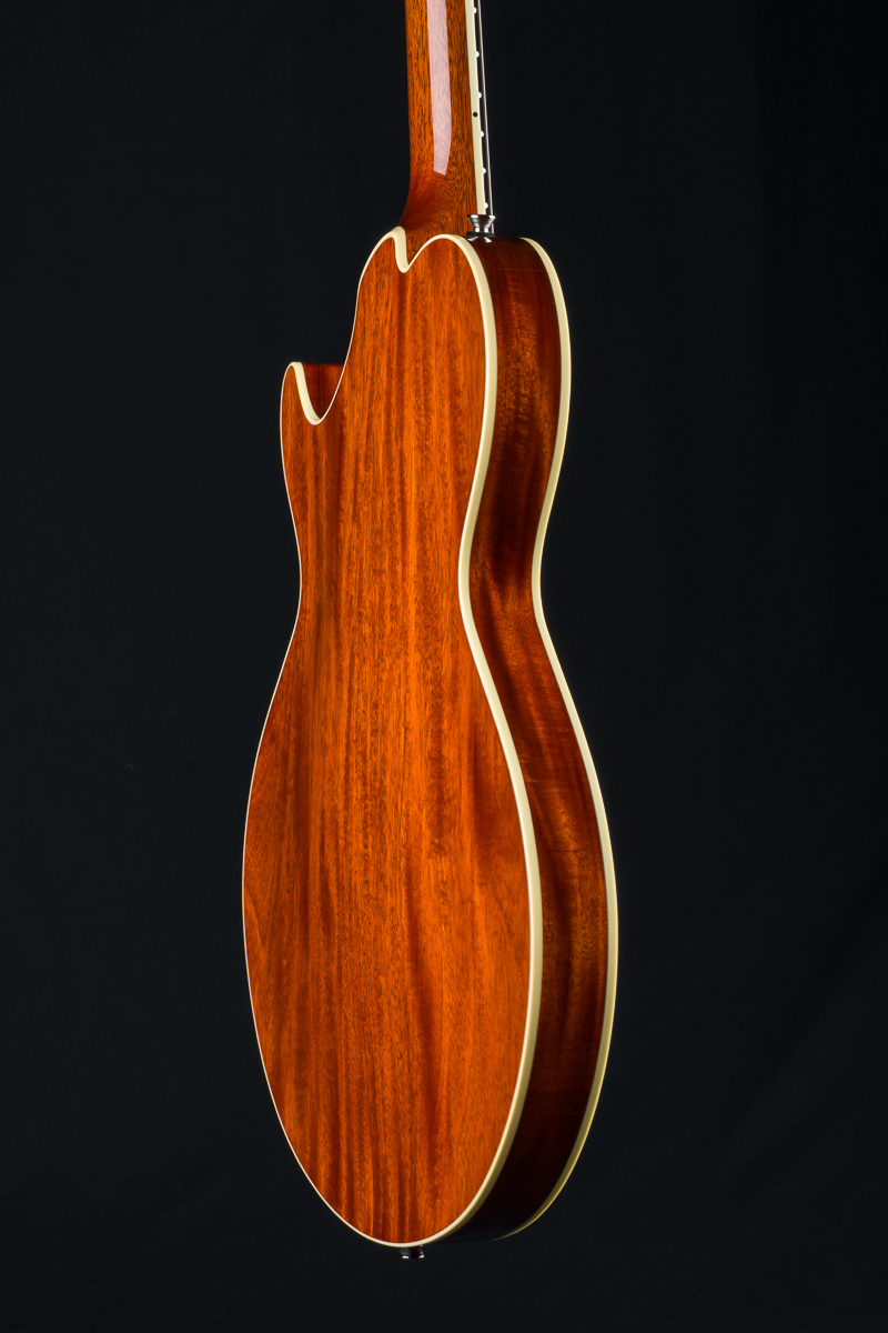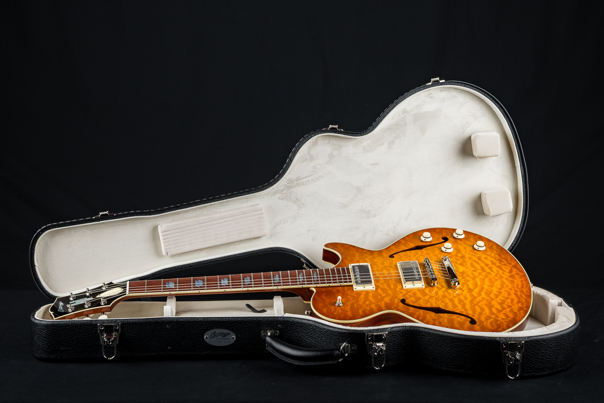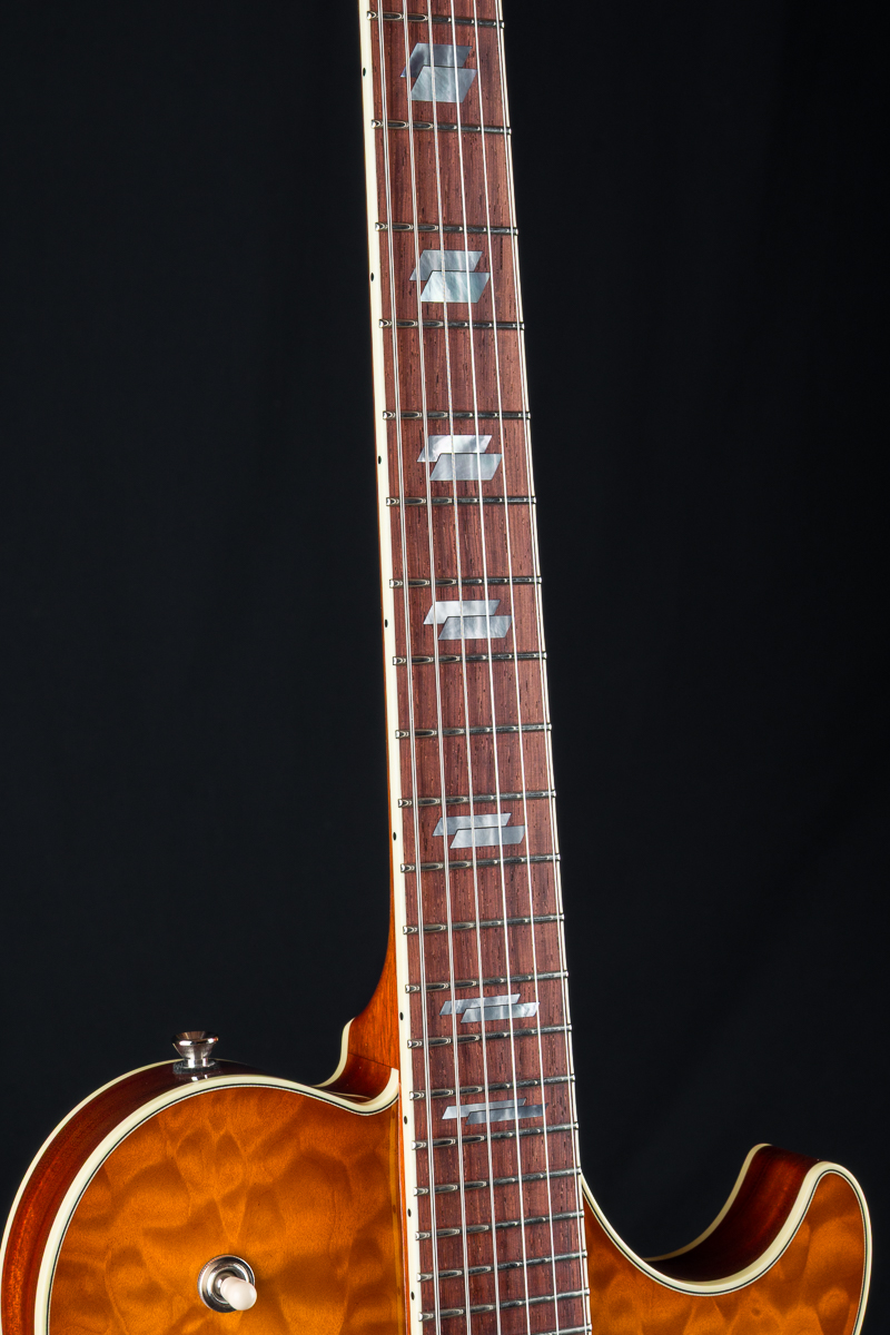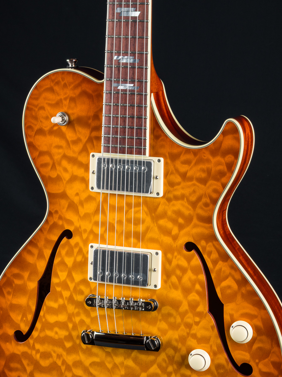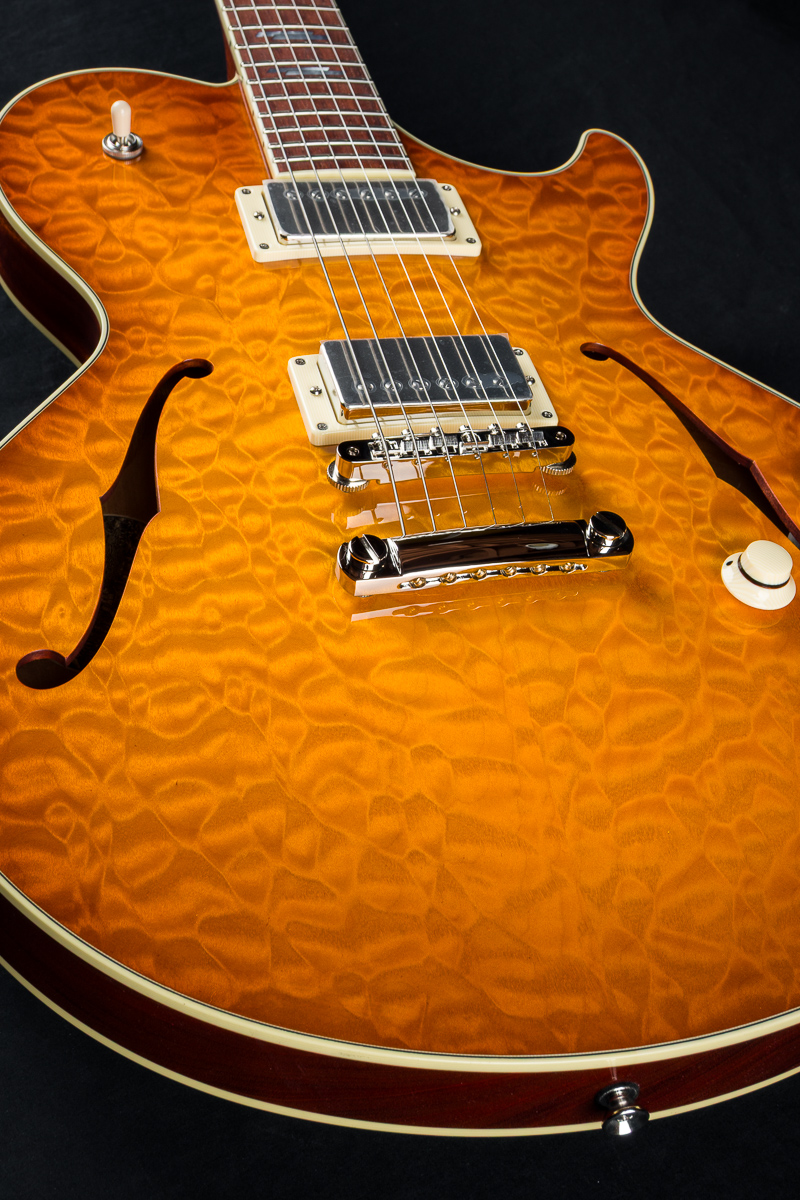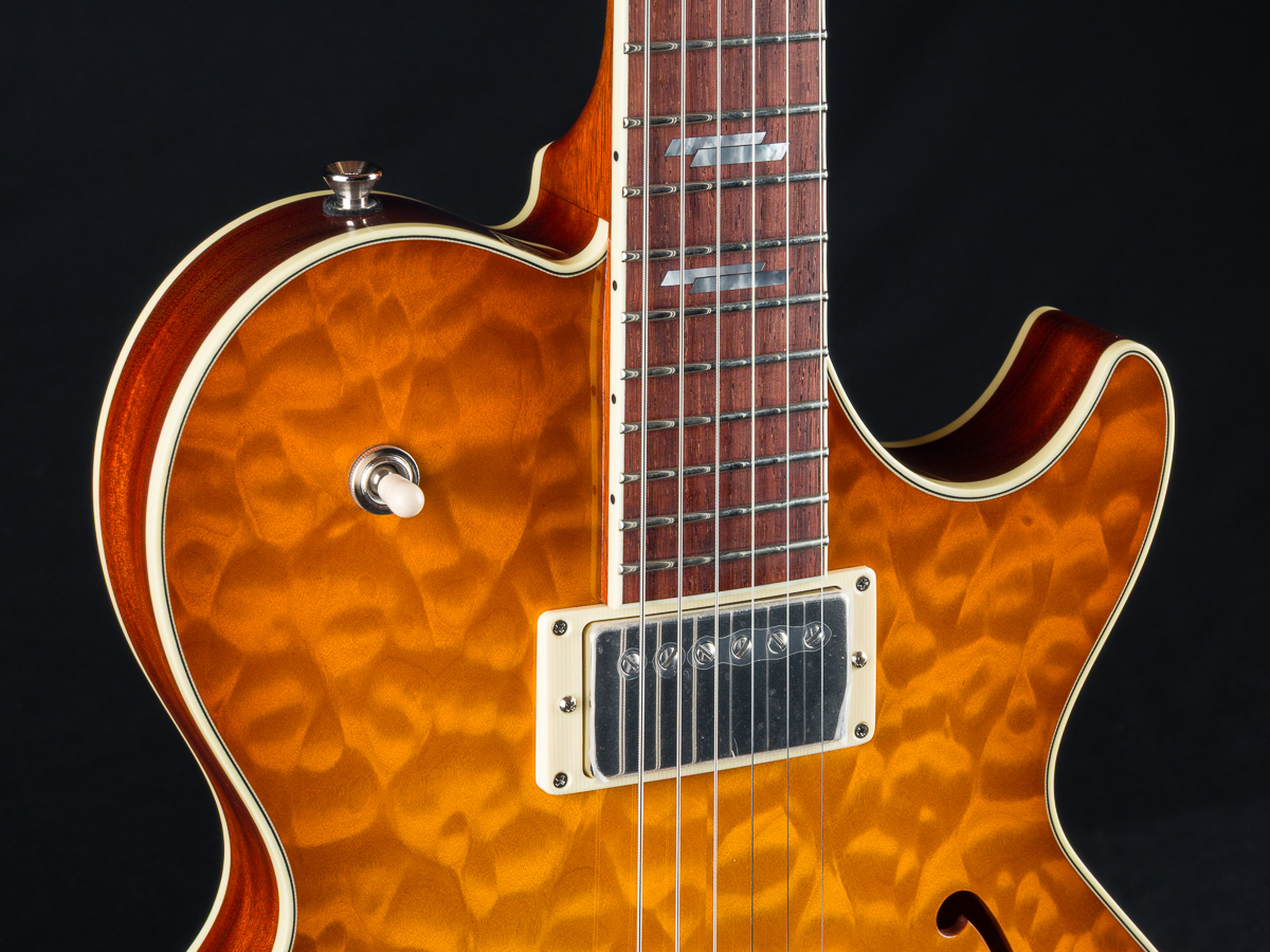 • Solid carved Premium Flamed Maple top with F holes