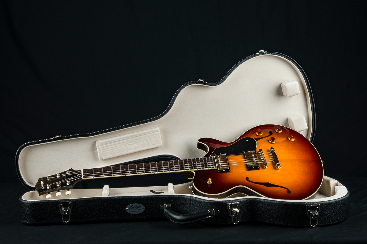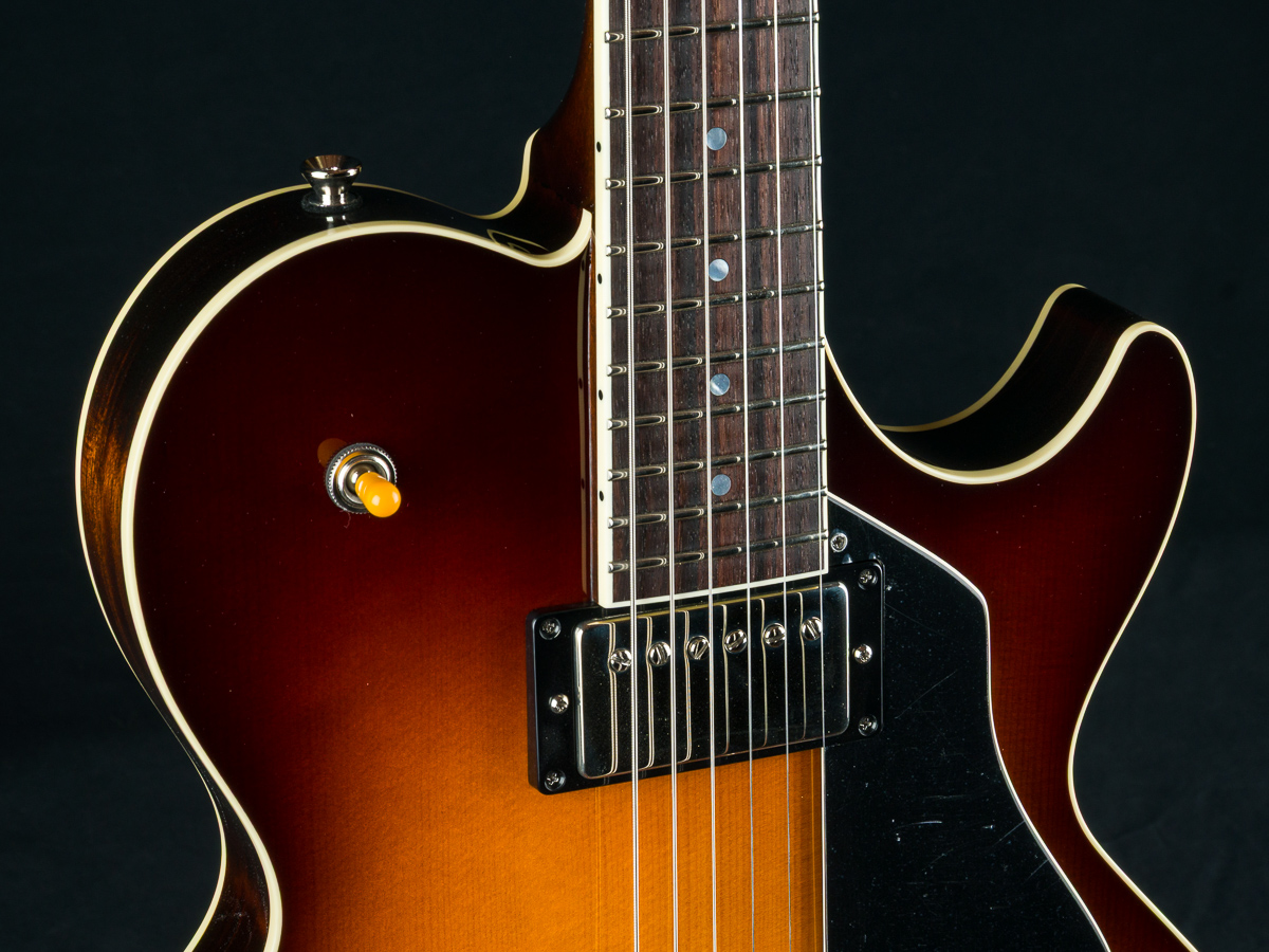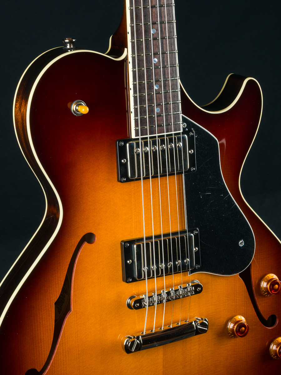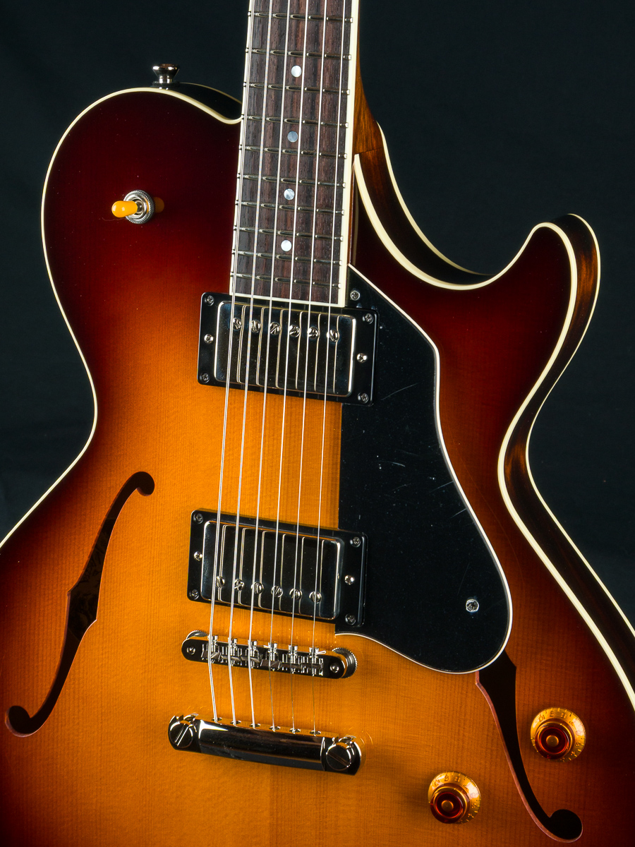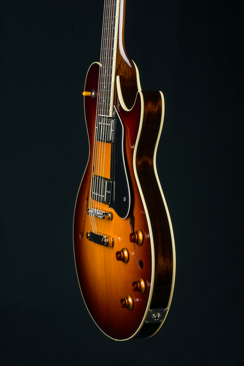 Named after the vibrant and eclectic South Congress district of Austin, TX, The all solid SoCo combines some of the most well-loved features and sounds from the heritage of semi-hollow guitars with a distinctive look and feel all its own. A 15″ lower bout gives this SoCo a lightweight comfortable, well balanced feel and exceptional note articulation. The ergonomically carved neck heel and long neck tenon ensures that each note can be accessed with ease and will ring with balanced sustain. The single-cutaway body design makes for greater mass and contact with the neck joint, providing solid low-end response and a resonance you can feel throughout the instrument. This custom SoCo is built with solid carved European Spruce top with Iced Tea burst, solid Mahogany back and sides, Ron Ellis Signature humbuckers and Ivoroid body and fretboard bindings.