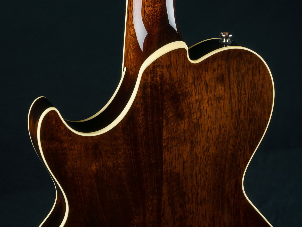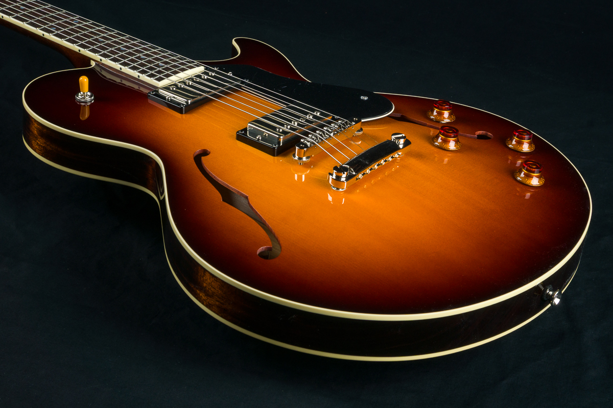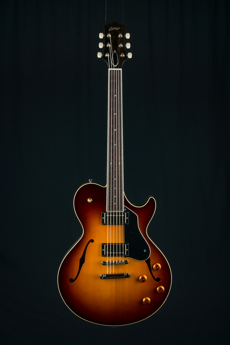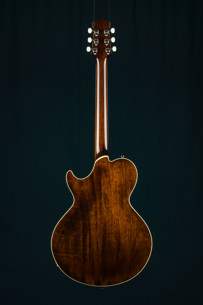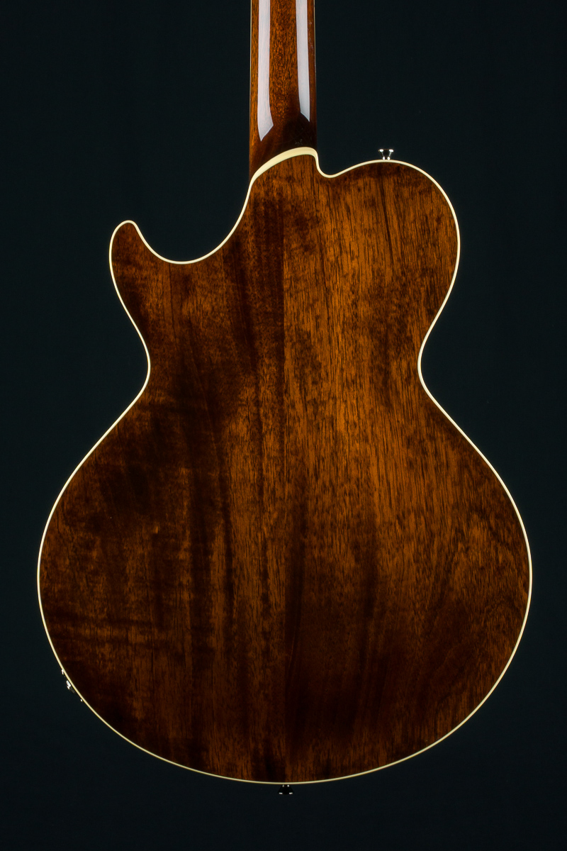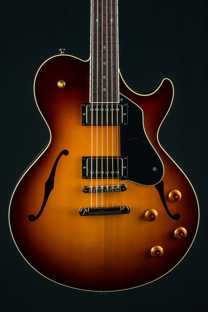 Named after the vibrant and eclectic South Congress district of Austin, TX, The all solid SoCo combines some of the most well-loved features and sounds from the heritage of semi-hollow guitars with a distinctive look and feel all its own. A 15″ lower bout gives this SoCo a lightweight comfortable, well balanced feel and exceptional note articulation. The ergonomically carved neck heel and long neck tenon ensures that each note can be accessed with ease and will ring with balanced sustain. The single-cutaway body design makes for greater mass and contact with the neck joint, providing solid low-end response and a resonance you can feel throughout the instrument. This custom SoCo is built with solid carved European Spruce top with Iced Tea burst, solid Mahogany back and sides, Ron Ellis Signature humbuckers and Ivoroid body and fretboard bindings.
