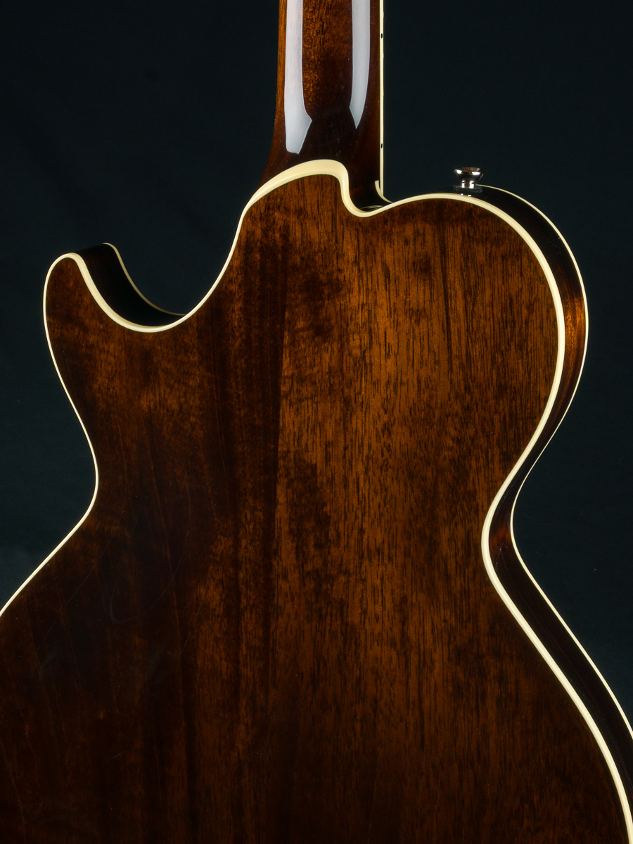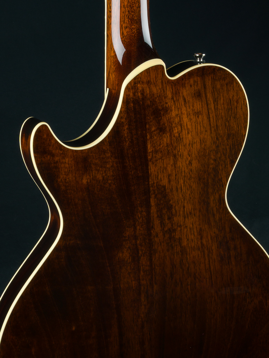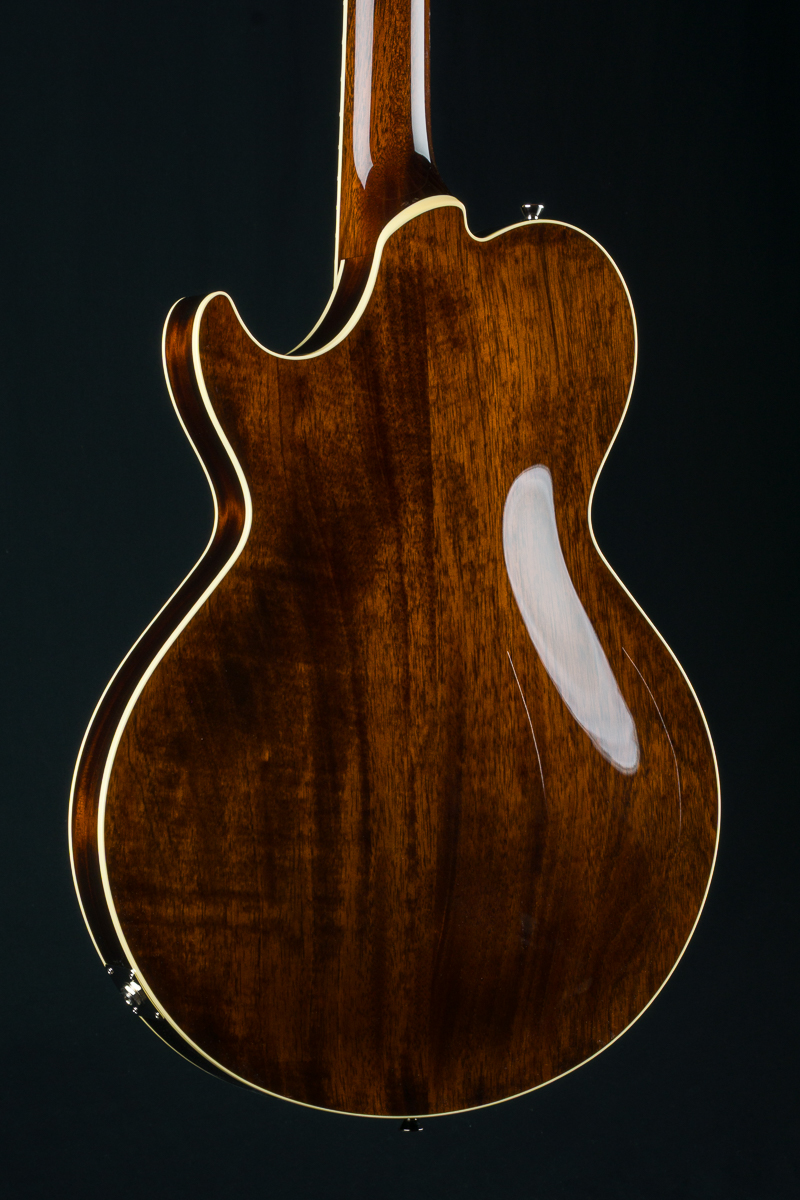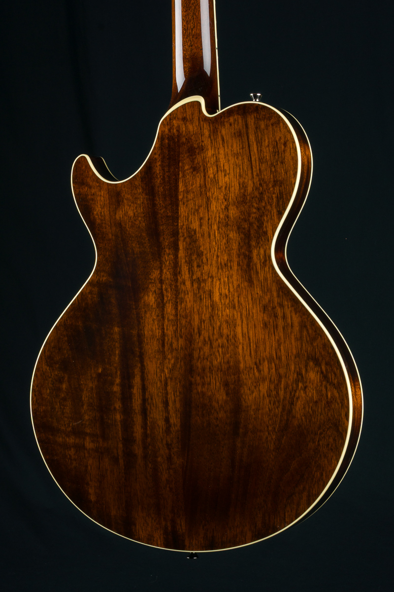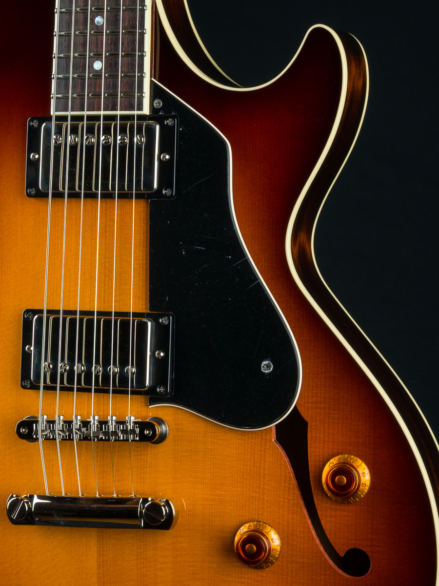Named after the vibrant and eclectic South Congress district of Austin, TX, The all solid SoCo combines some of the most well-loved features and sounds from the heritage of semi-hollow guitars with a distinctive look and feel all its own. A 15″ lower bout gives this SoCo a lightweight comfortable, well balanced feel and exceptional note articulation. The ergonomically carved neck heel and long neck tenon ensures that each note can be accessed with ease and will ring with balanced sustain. The single-cutaway body design makes for greater mass and contact with the neck joint, providing solid low-end response and a resonance you can feel throughout the instrument. This custom SoCo is built with solid carved European Spruce top with Iced Tea burst, solid Mahogany back and sides, Ron Ellis Signature humbuckers and Ivoroid body and fretboard bindings.