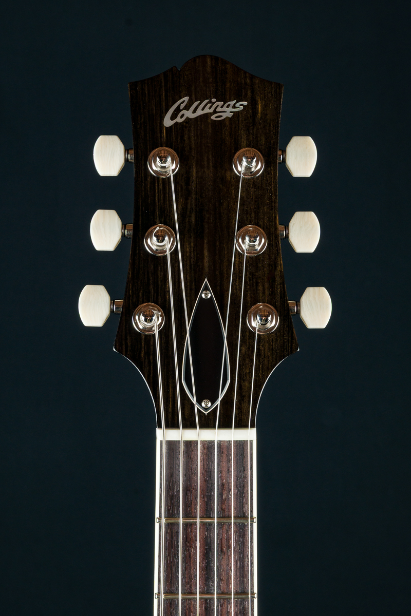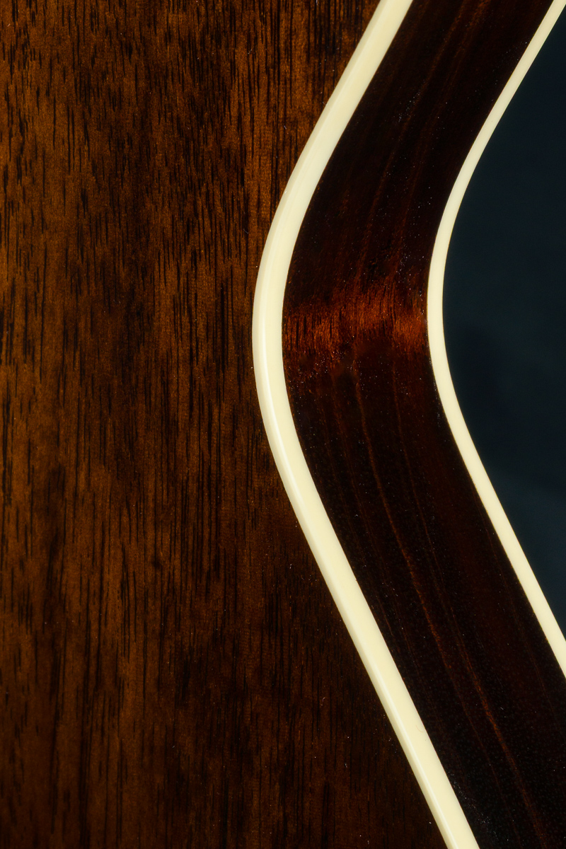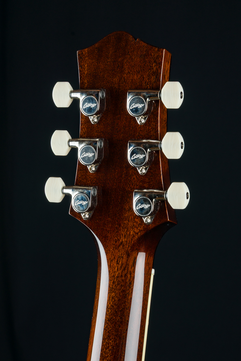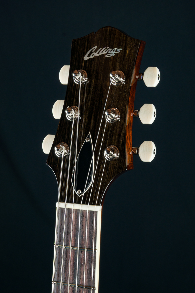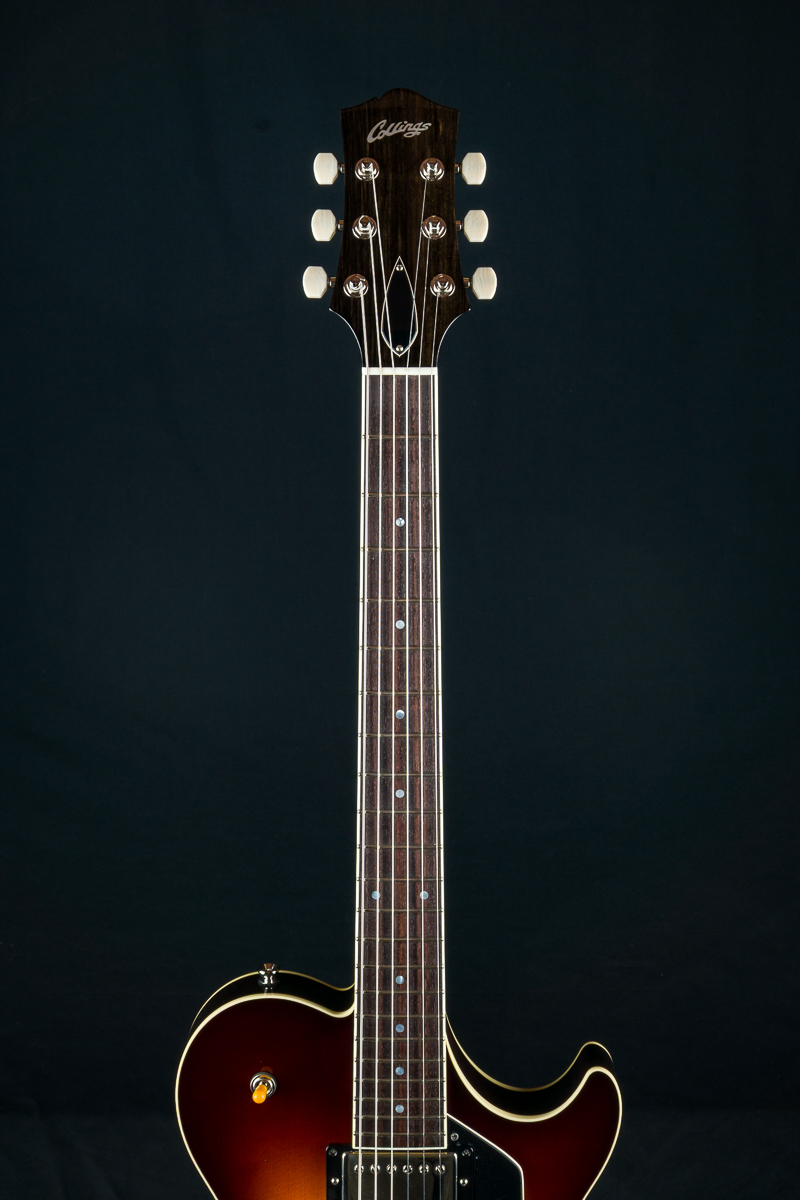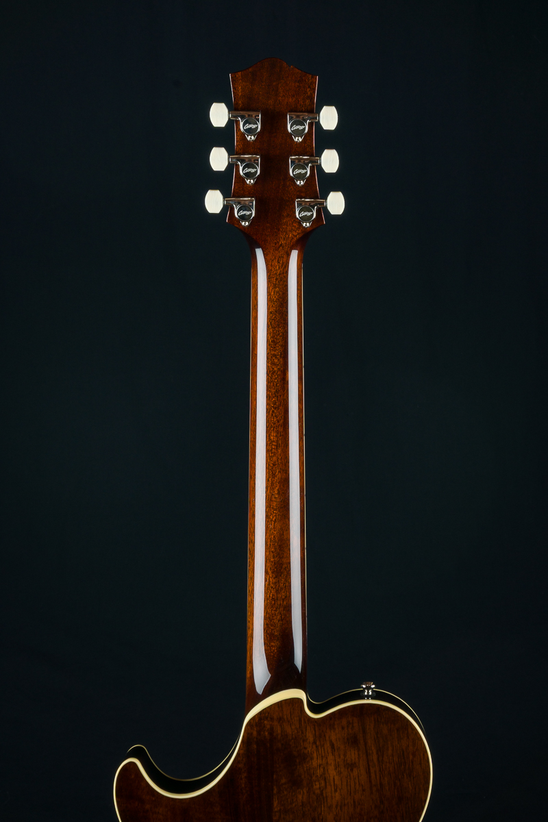 Named after the vibrant and eclectic South Congress district of Austin, TX, The all solid SoCo combines some of the most well-loved features and sounds from the heritage of semi-hollow guitars with a distinctive look and feel all its own. A 15″ lower bout gives this SoCo a lightweight comfortable, well balanced feel and exceptional note articulation. The ergonomically carved neck heel and long neck tenon ensures that each note can be accessed with ease and will ring with balanced sustain. The single-cutaway body design makes for greater mass and contact with the neck joint, providing solid low-end response and a resonance you can feel throughout the instrument. This custom SoCo is built with solid carved European Spruce top with Iced Tea burst, solid Mahogany back and sides, Ron Ellis Signature humbuckers and Ivoroid body and fretboard bindings.