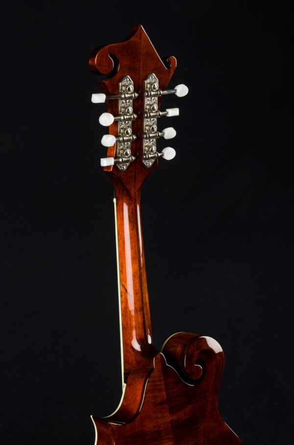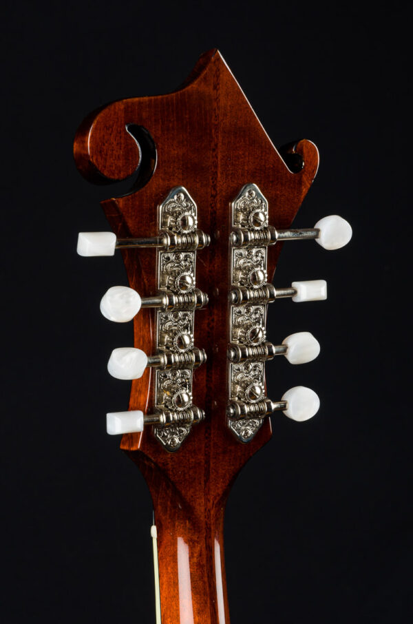 Features include carved solid Spruce top, solid carved Maple back, sides and neck, gloss nitrocellulose lacquer ‘classic’ finish, Ebony radiused fretboard and adjustable bridge, Ivoroid top binding, chrome tailpiece, Nickel tuners with Pearl buttons, Bone nut, white Mother of Pearl dot inlays, black/ white top purfling, 1 3/32″ nut width, 13 7/8″ scale length and 1 5/8″ string spacing.