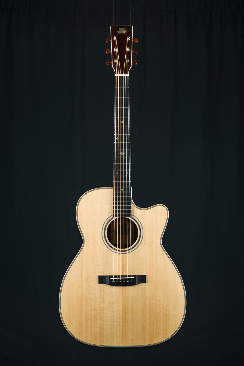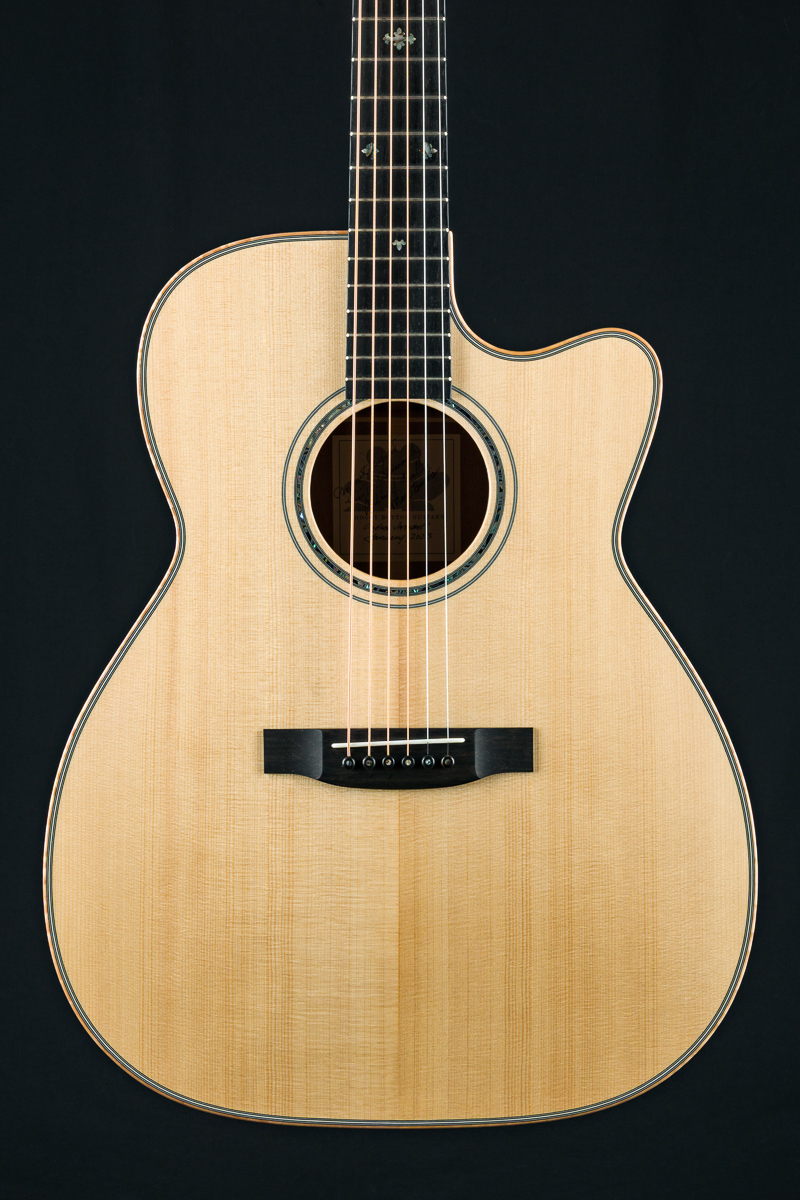Other features include Mahogany neck, Ebony fretboard and bridge, Flamed Maple bindings and wedge, Rosewood headstock overlay, Venetian cutaway, Ebony pins with Pearl dots, Ivoroid black purfling, 25 1/4” scale length, 1 3/4” nut width, and 2 3/16” bridge spacing. Interior label signed by Michael Millard, Eric Goodenough, Andy Mueller and Mark Burds dated January 2023.