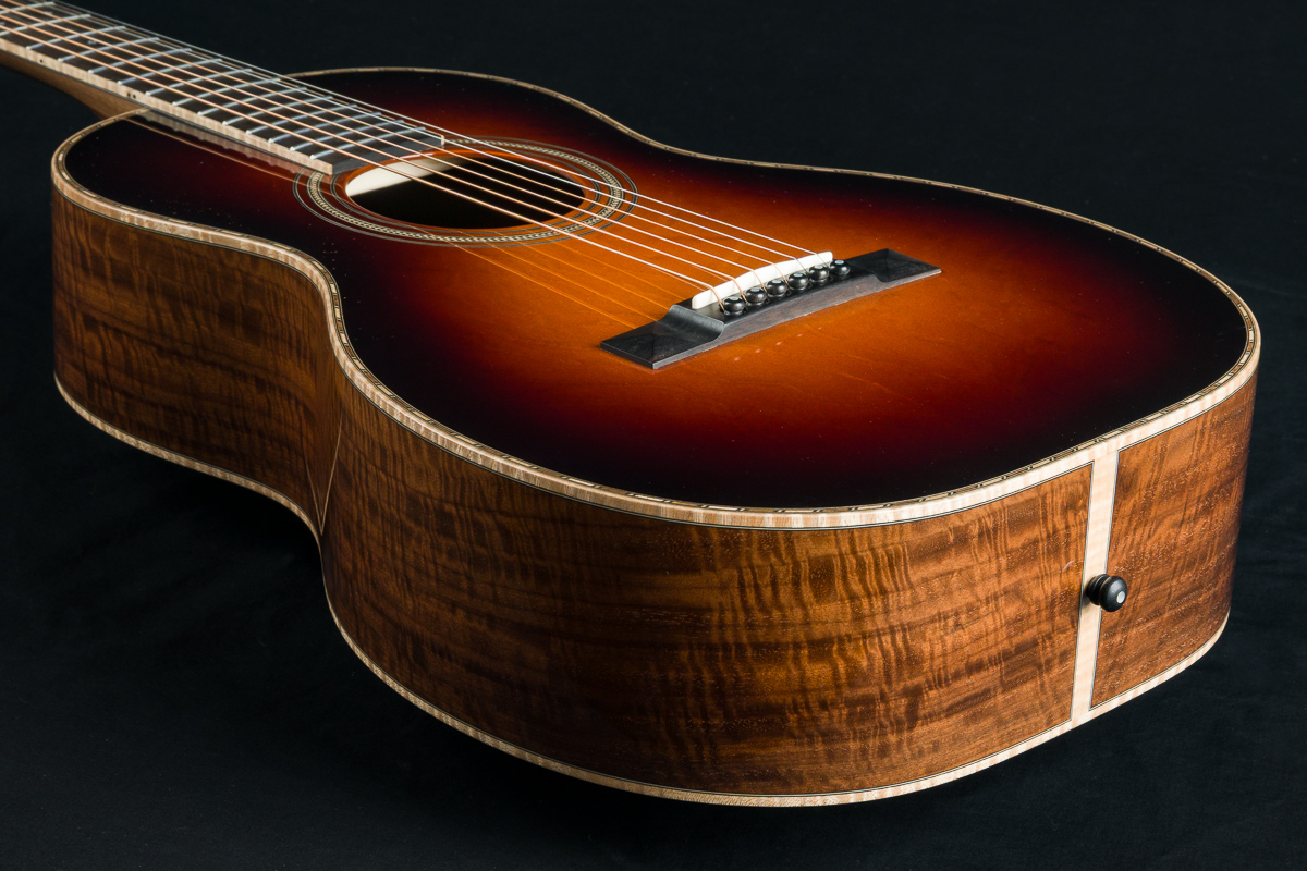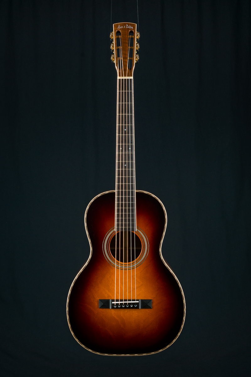The 0 is Huss & Dalton’s very comfortable sweet Parlor build. Measuring 13.5 inches across this is the versatile small body build with large robust tone and clarity that is sure to surprise you. Built with the short scale 24.9″ scale with 1 3/4″ nut width, this very comfortable lap guitar is a joy to play and sounds as good as it looks.