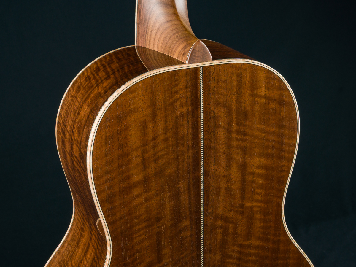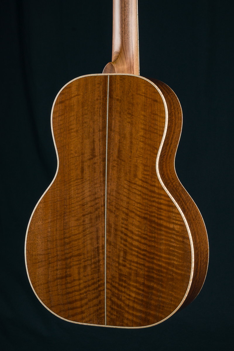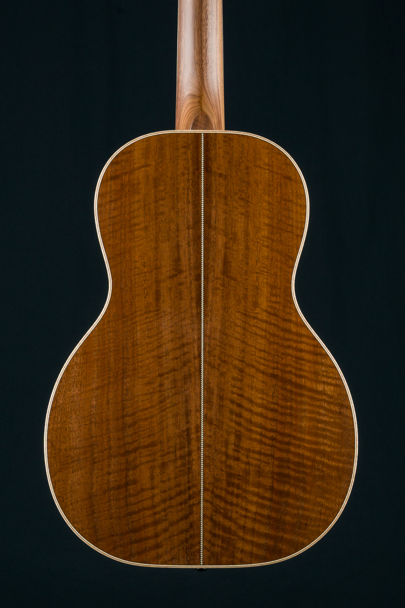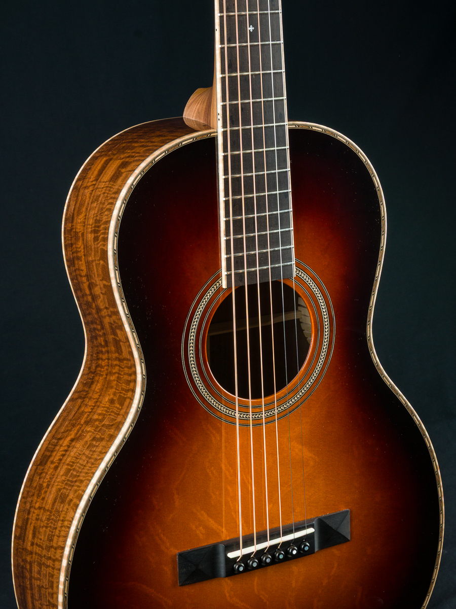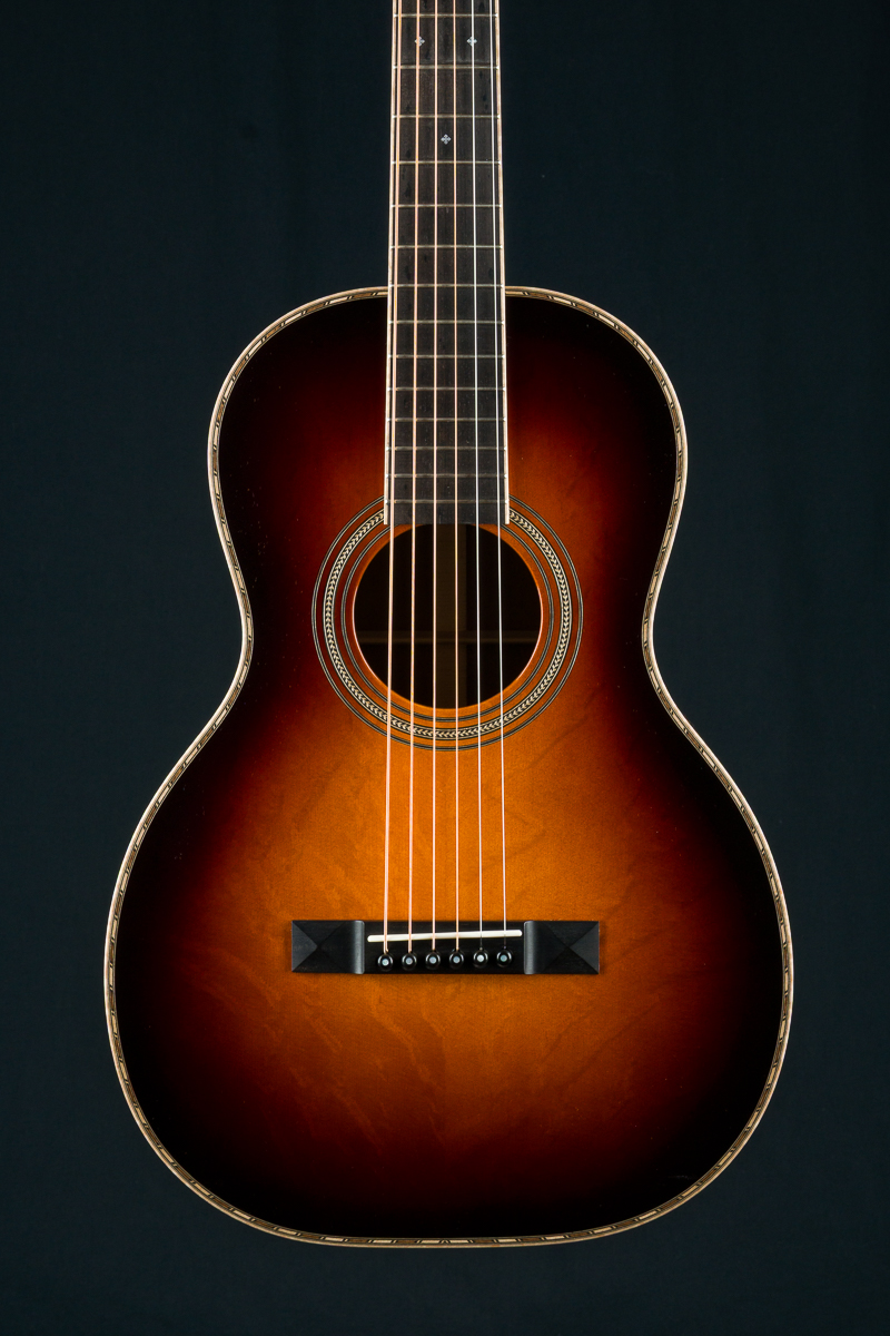 A showpiece at the 2025 Fretboard Summit in Chicago, this 0 Parlor Custom is a great custom build with a wonderful broken in robust sound. Custom features include flame figured Black Walnut back and sides, Bearclaw Sitka Spruce sunburst top, Walnut neck with slotted headstock, Flamed Maple full body, neck and headstock bindings plus Walnut/ Maple rope purfling taken from an early H&D banjo model.