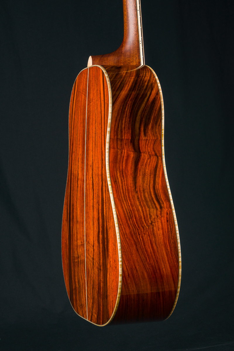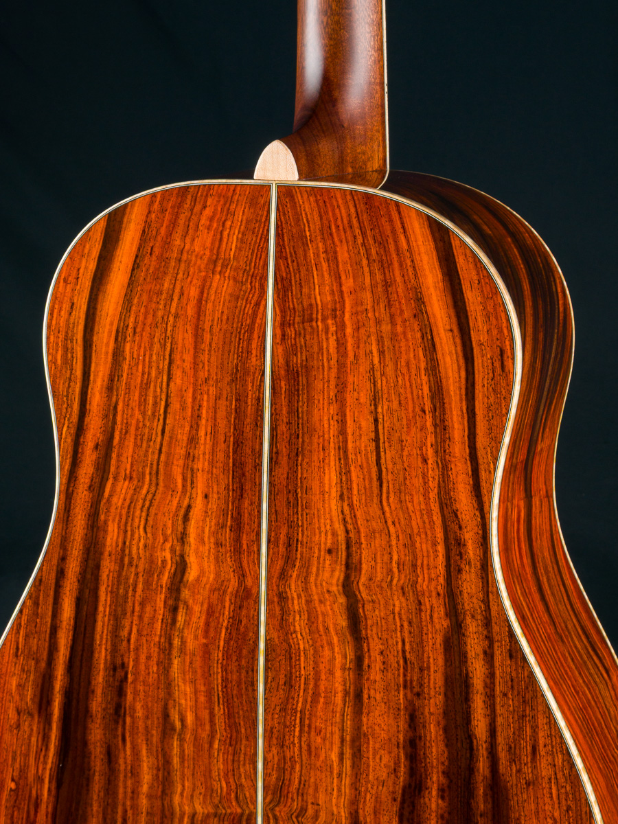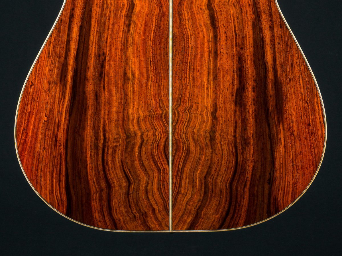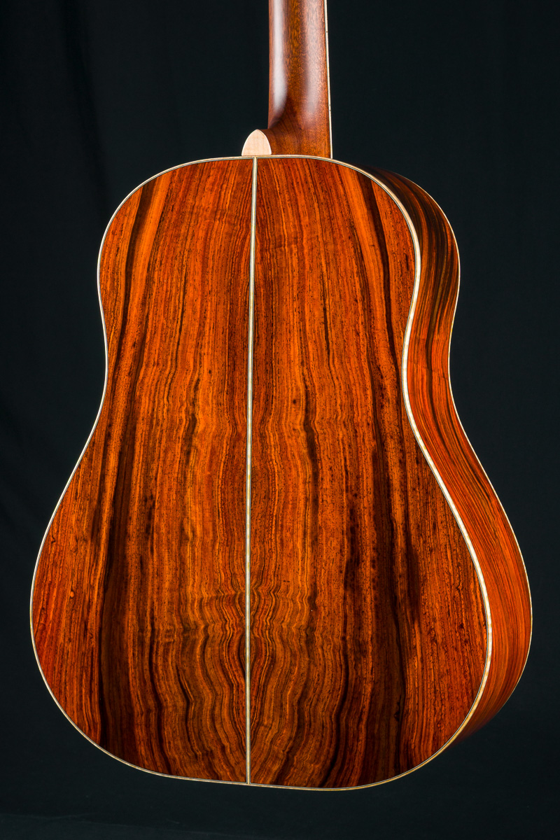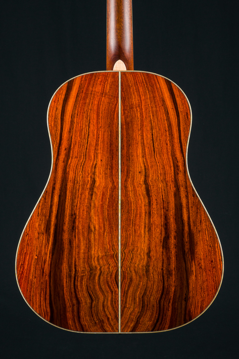 This one-of-a-kind DS-41 features a premium set of Cocobolo back and sides personally selected by Brian Dickel of H&D at the NAMM Show from a renowned tonewood collector. The Cocobolo’s vivid red-orange hue, accented by dark streaks and rippling figure reminiscent of flowing hair or flames, is absolutely captivating. Cocobolo (Dalbergia Retusa) is a true Rosewood from Central America with a sweet glassy tone that is a great substitute for the famed and coveted Brazilian Rosewood and can be more visually stunning in color and figure than Brazilian.