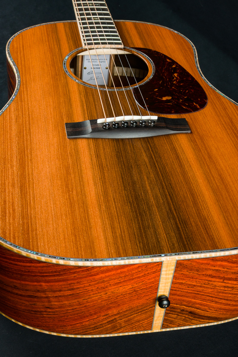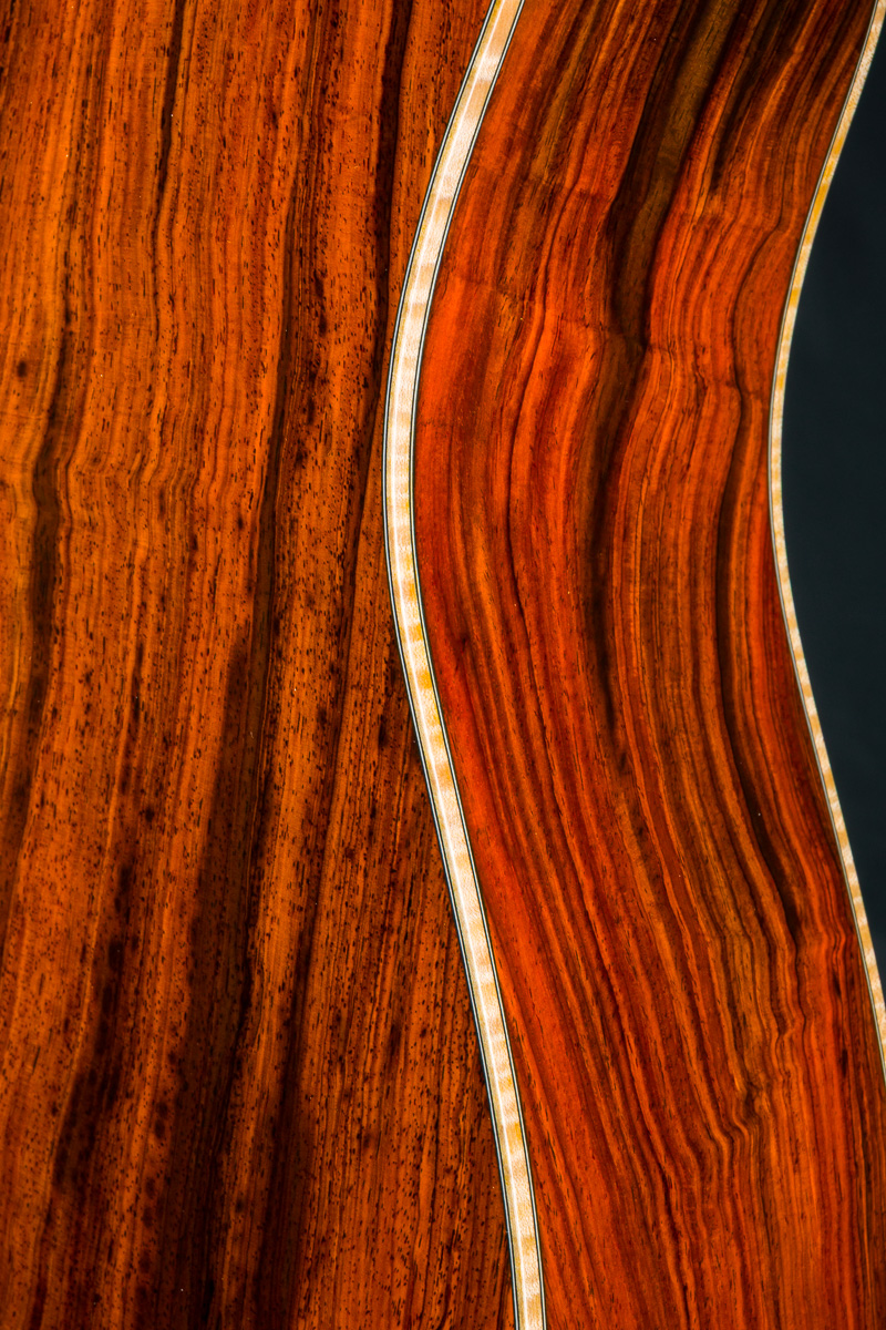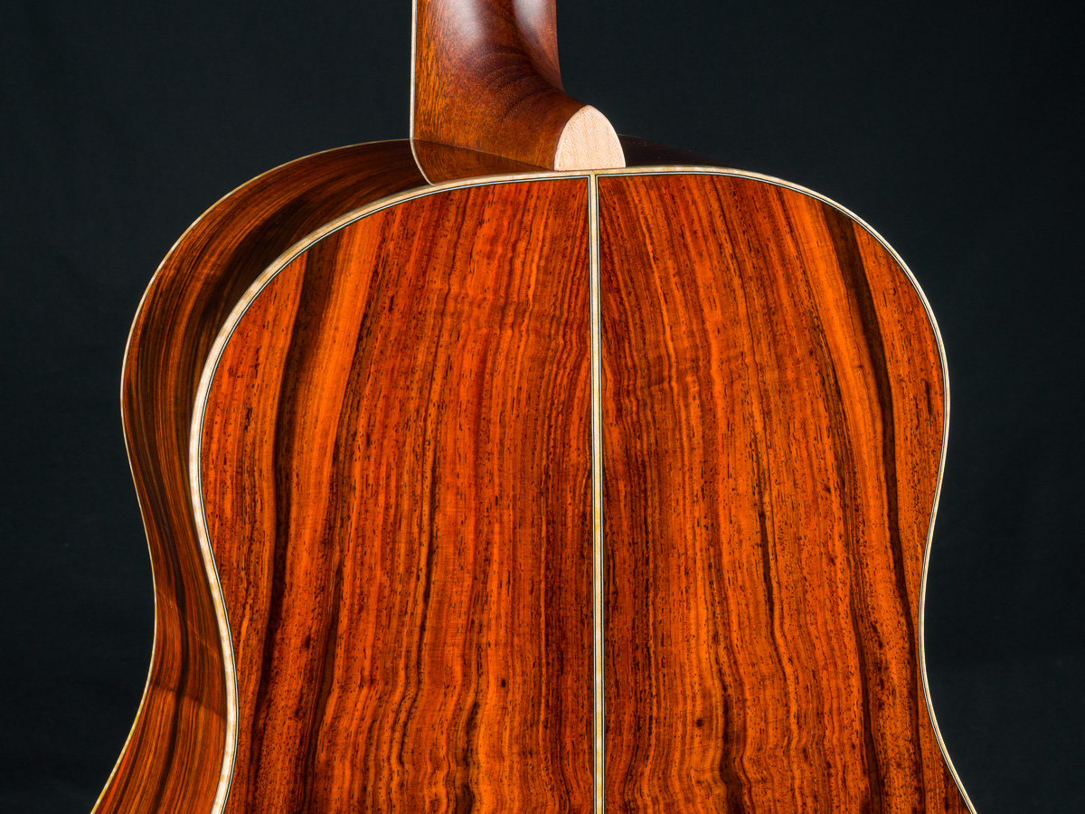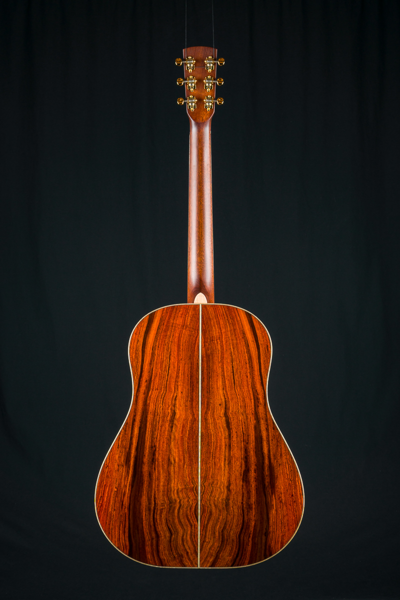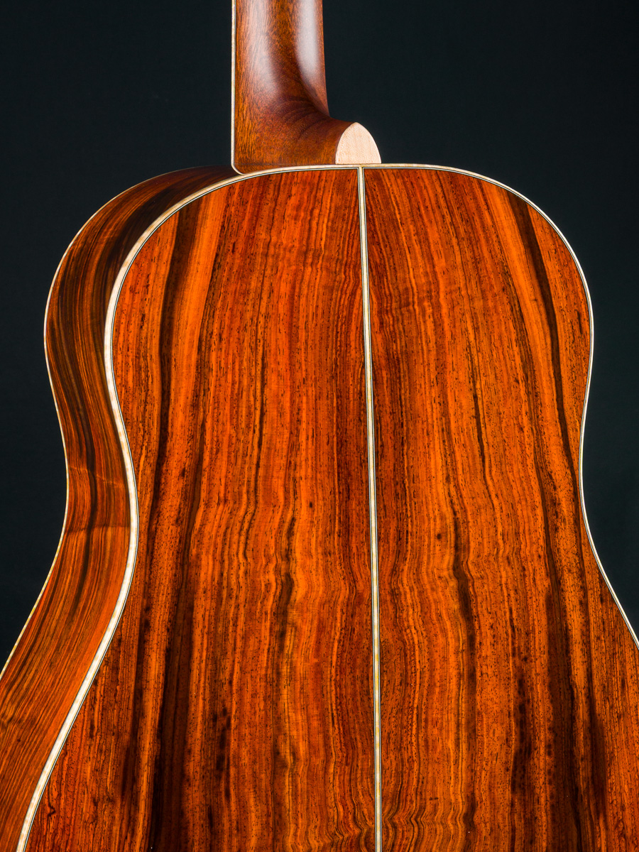This one-of-a-kind DS-41 features a premium set of Cocobolo back and sides personally selected by Brian Dickel of H&D at the NAMM Show from a renowned tonewood collector. The Cocobolo’s vivid red-orange hue, accented by dark streaks and rippling figure reminiscent of flowing hair or flames, is absolutely captivating. Cocobolo (Dalbergia Retusa) is a true Rosewood from Central America with a sweet glassy tone that is a great substitute for the famed and coveted Brazilian Rosewood and can be more visually stunning in color and figure than Brazilian.