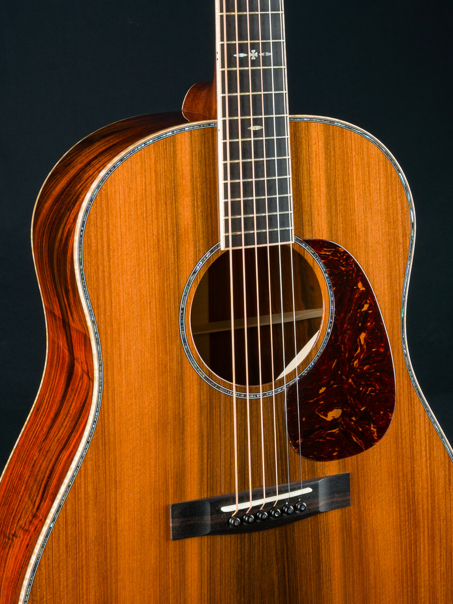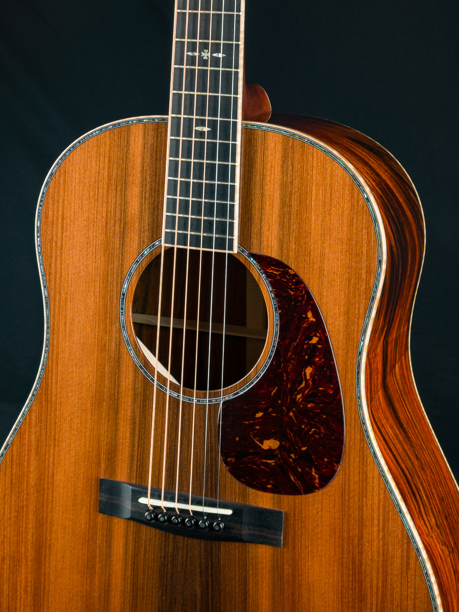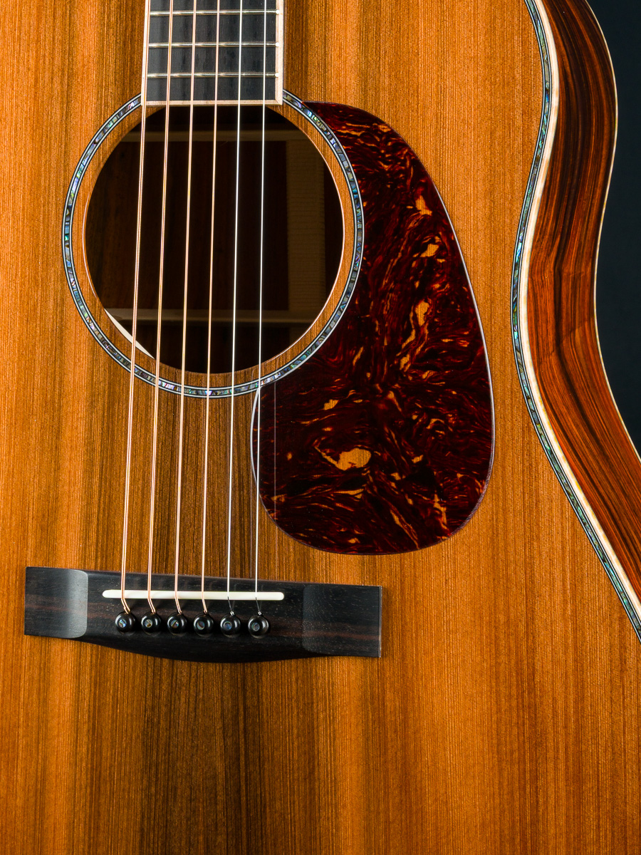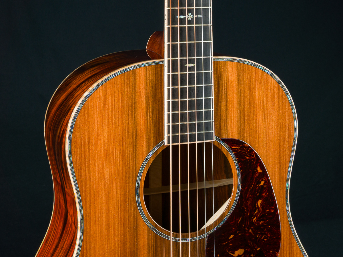 The Sinker Redwood top complements the Cocobolo perfectly, both tonally and visually, adding warmth and depth to the guitar’s dynamic voice. Elegant Paua Pearl 41-style top trim and rosette, along with 42-style snowflake fretboard inlays, lend just the right amount of sparkle. Fully wrapped figured Maple bindings on the body, neck, and headstock ties the entire build together into one cohesive, breathtaking instrument.