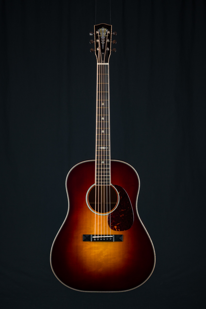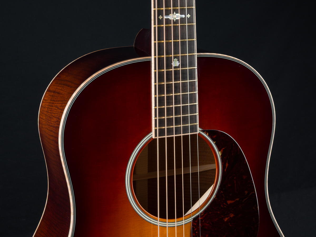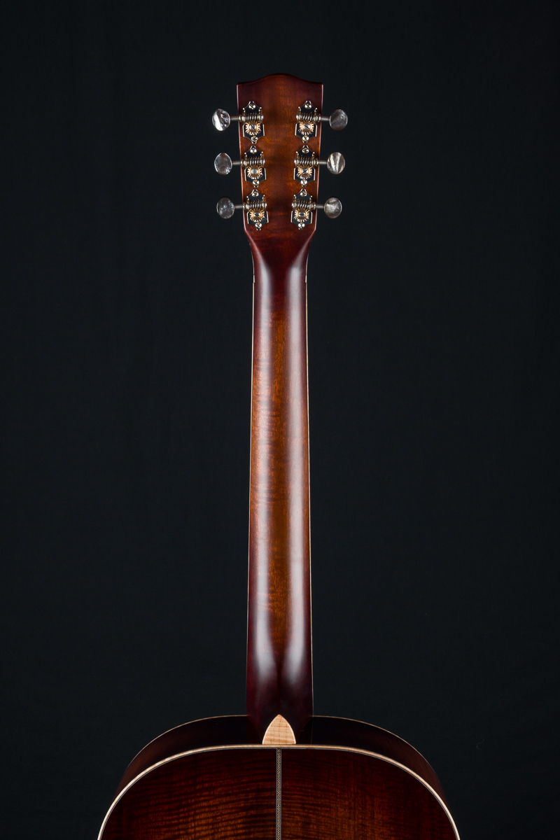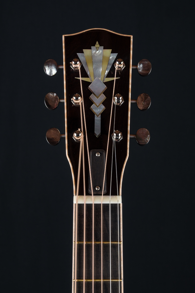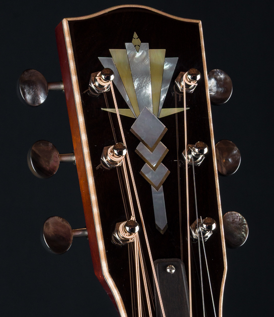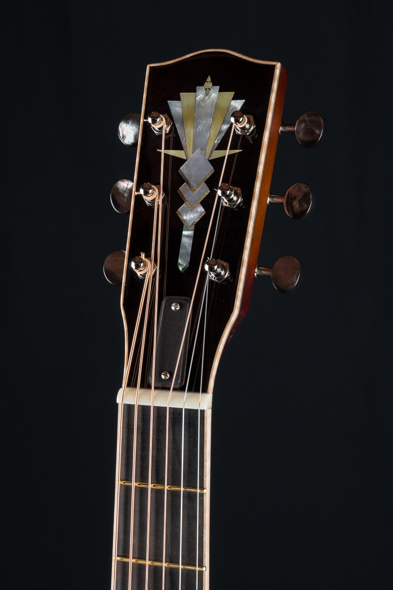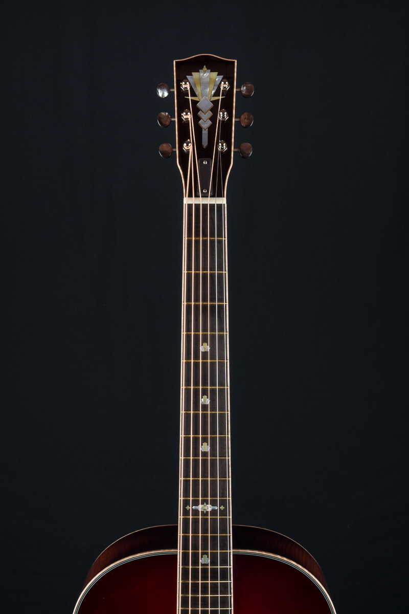 A sparkling highlight of the Huss & Dalton collection at the 2026 NAMM Show in Anaheim, CA, this DS Custom is the very first guitar to feature the Gold and Silver Mother of Pearl Art Deco fretboard and headstock inlay. The design was inspired by the Art Deco fireplace at the Staunton, Virginia workshop and was both developed and hand-cut in house by Huss & Dalton. This one-of-a-kind build features a premium set of highly flamed Fiddleback Mahogany for the back and sides, paired with a Bearclaw Lutz Spruce top with 2-tone all over sunburst finish and full Flamed Maple body, fretboard and headstock bindings. A nod to the traditional slope-shoulder guitars of the 1930s and ’40s, the Huss & Dalton DS Custom is designed for brawny power with premium tonewoods and dashing good looks.