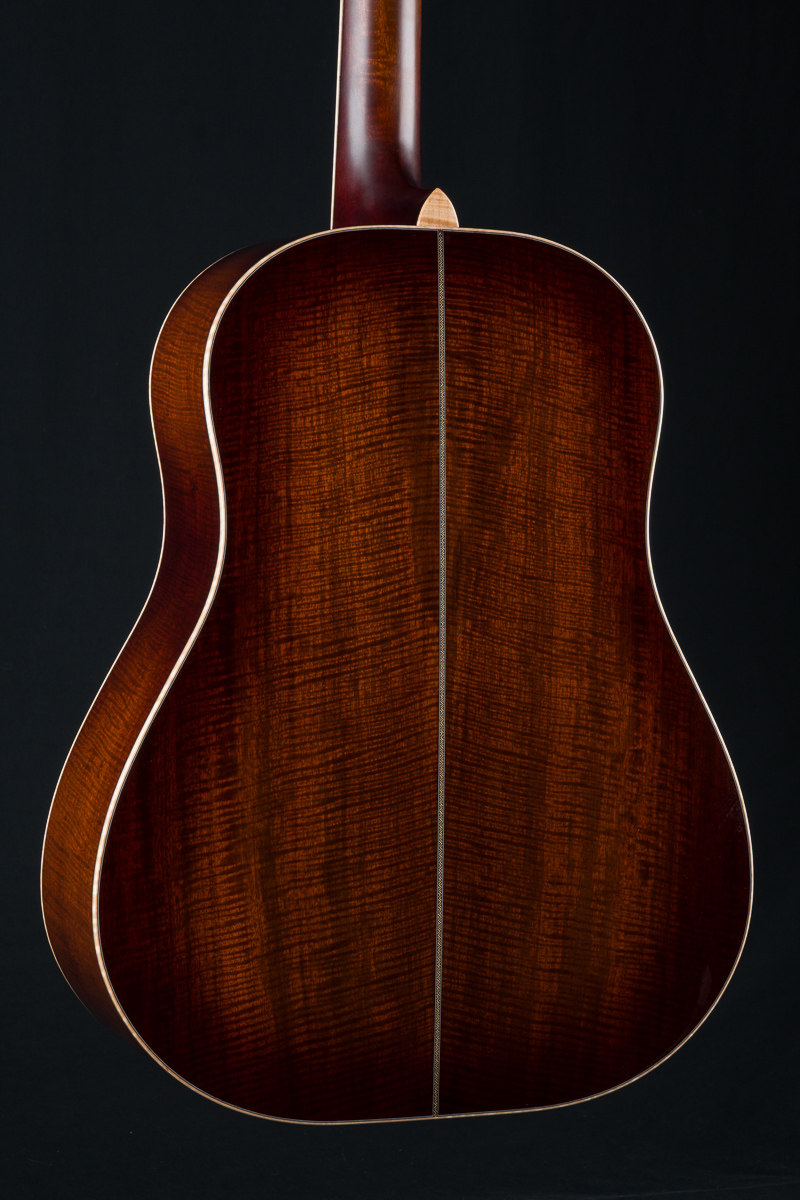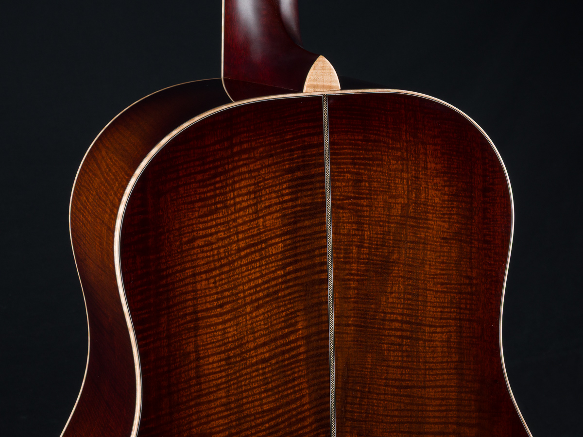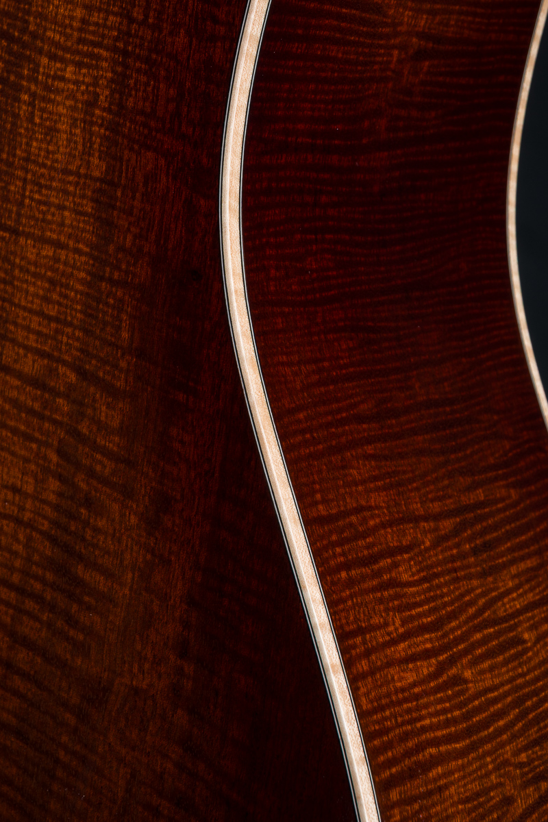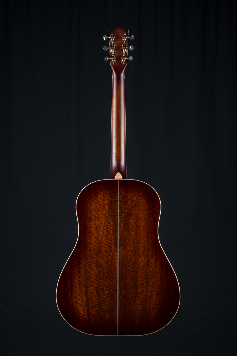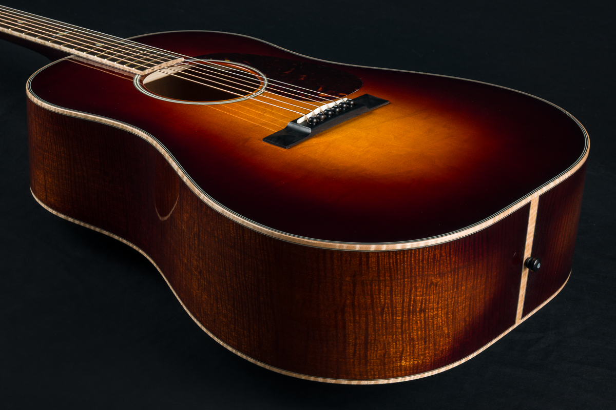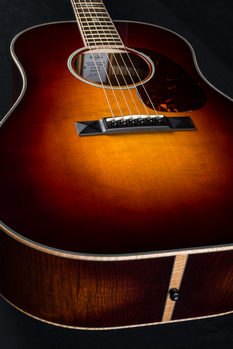 A sparkling highlight of the Huss & Dalton collection at the 2026 NAMM Show in Anaheim, CA, this DS Custom is the very first guitar to feature the Gold and Silver Mother of Pearl Art Deco fretboard and headstock inlay. The design was inspired by the Art Deco fireplace at the Staunton, Virginia workshop and was both developed and hand-cut in house by Huss & Dalton. This one-of-a-kind build features a premium set of highly flamed Fiddleback Mahogany for the back and sides, paired with a Bearclaw Lutz Spruce top with 2-tone all over sunburst finish and full Flamed Maple body, fretboard and headstock bindings. A nod to the traditional slope-shoulder guitars of the 1930s and ’40s, the Huss & Dalton DS Custom is designed for brawny power with premium tonewoods and dashing good looks.