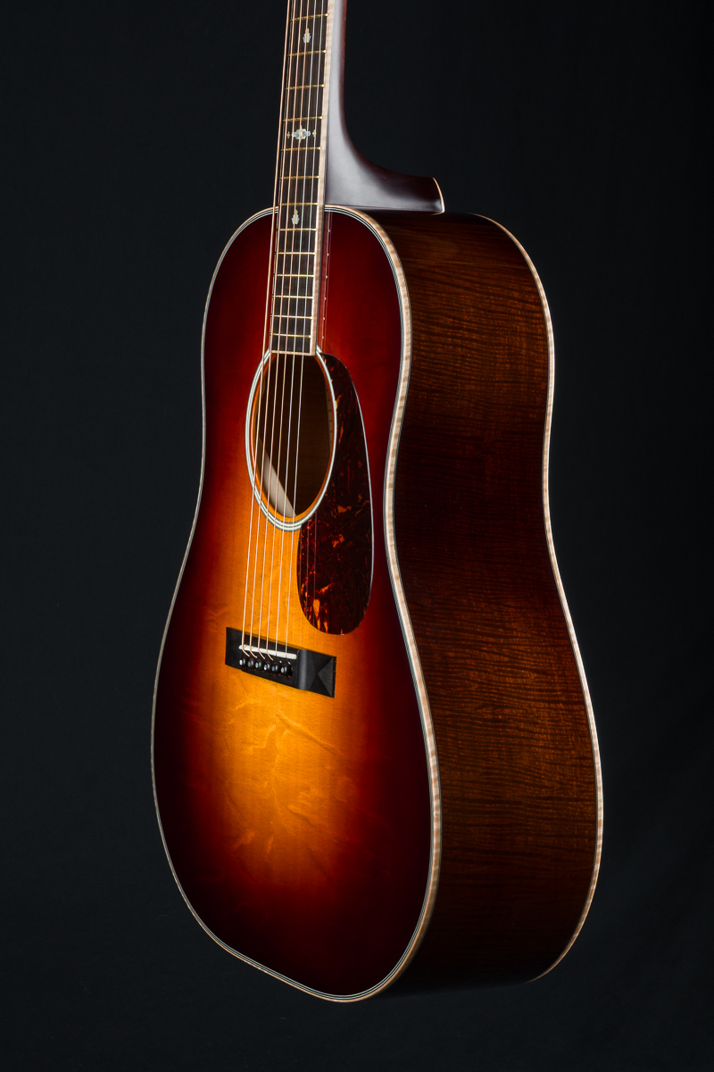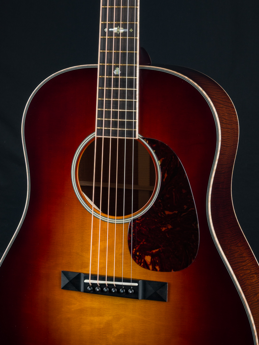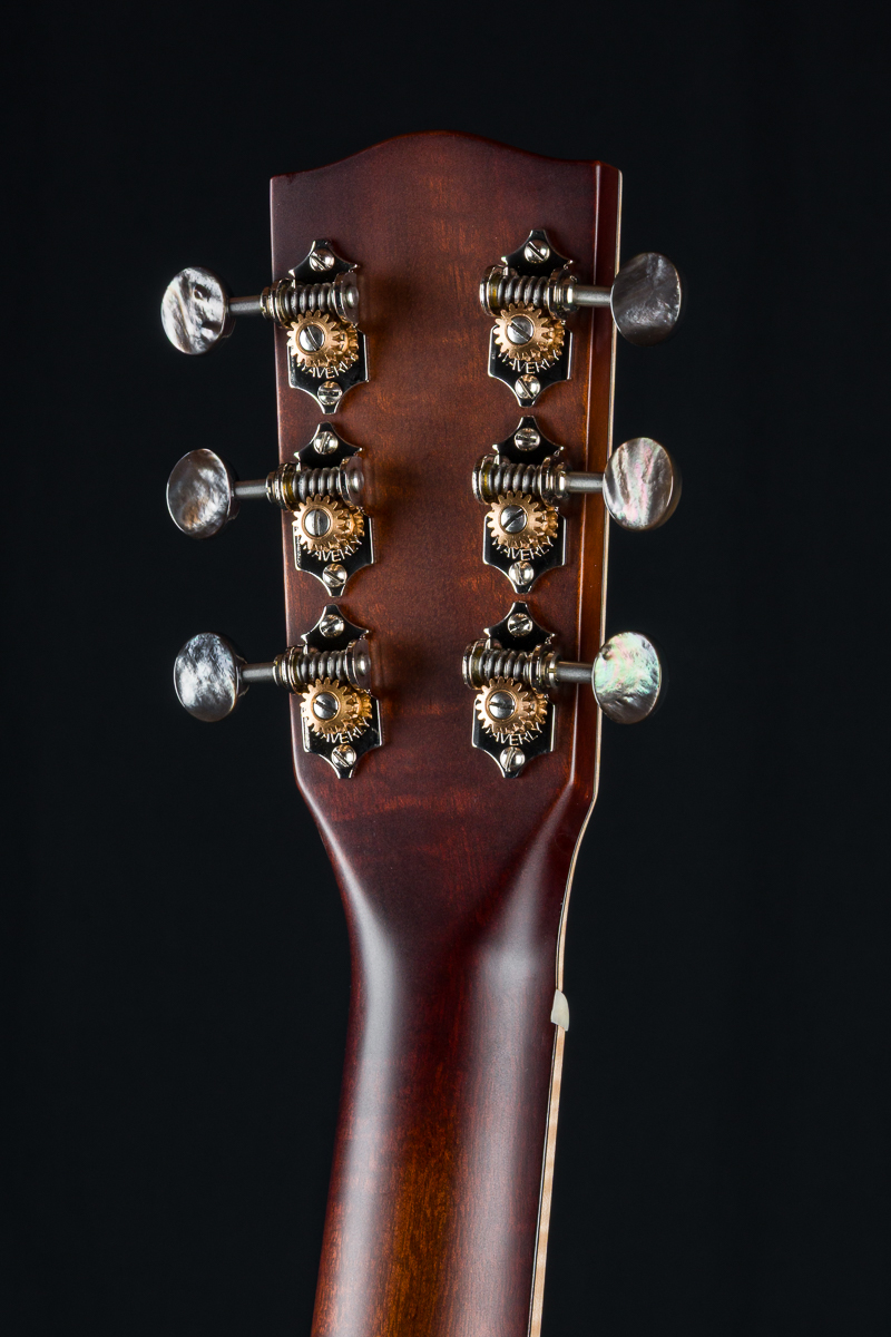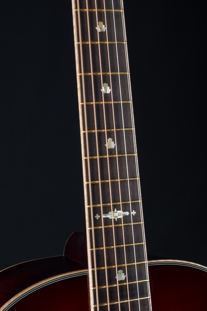 Other features include Ebony fretboard and pyramid bridge, Ivoroid/ black top purfling and rosette, Mahogany neck, Nickel Waverly tuners with Black Pearl buttons, Ebony headstock overlay, Maple heelcap and wedge, zig zag backstrip, 1 23/32″ nut width and more.