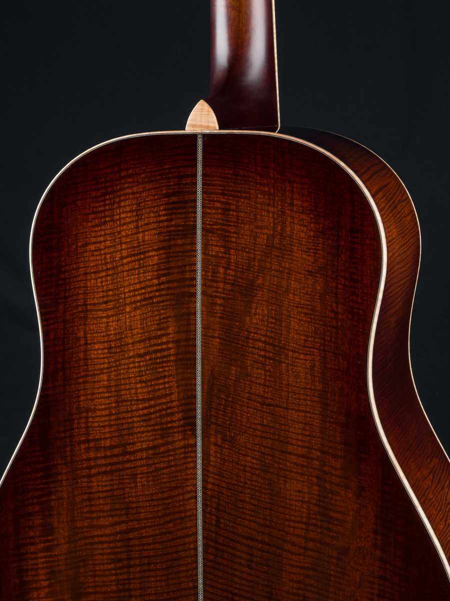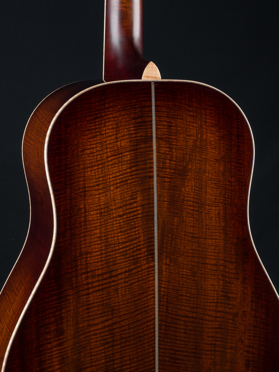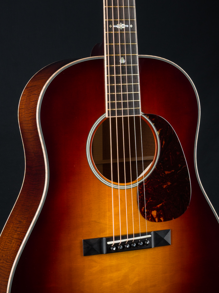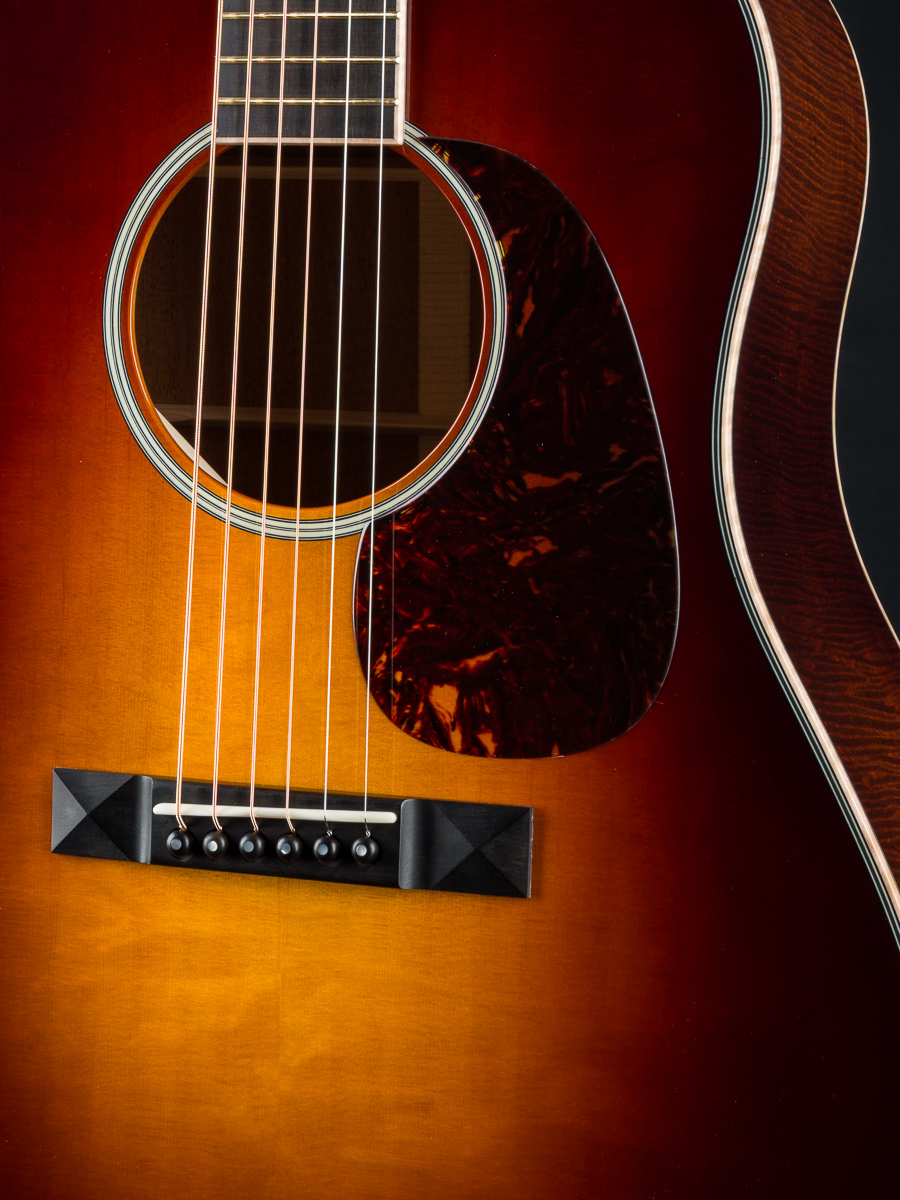 Other features include Ebony fretboard and pyramid bridge, Ivoroid/ black top purfling and rosette, Mahogany neck, Nickel Waverly tuners with Black Pearl buttons, Ebony headstock overlay, Maple heelcap and wedge, zig zag backstrip, 1 23/32″ nut width and more.
