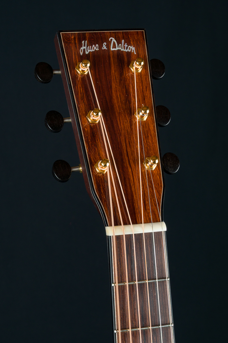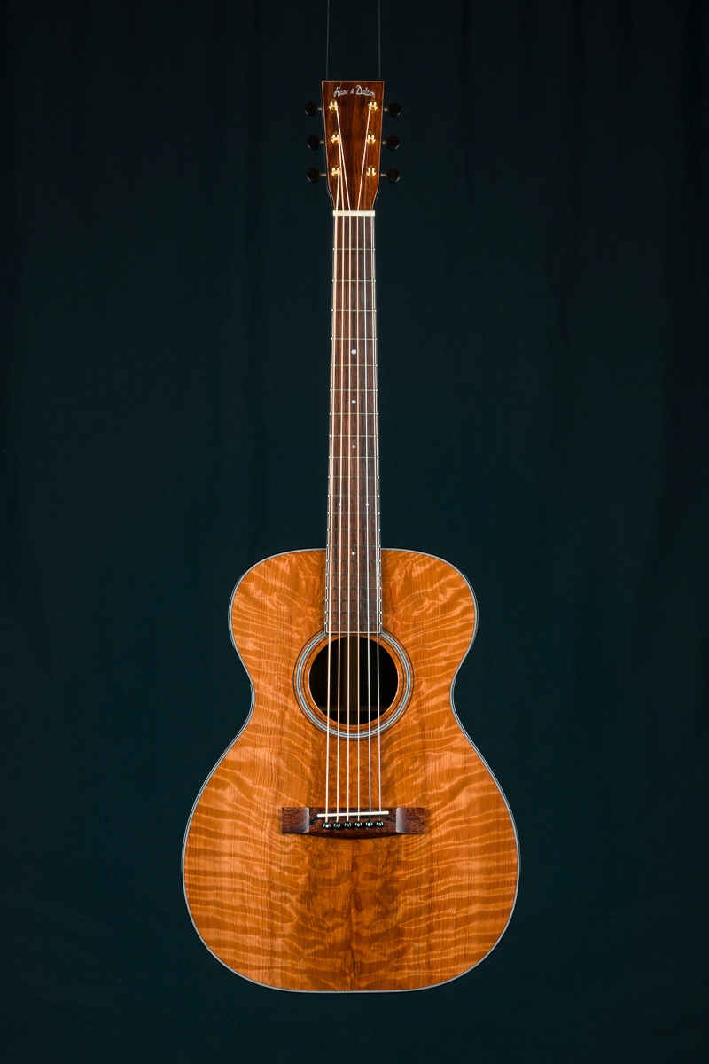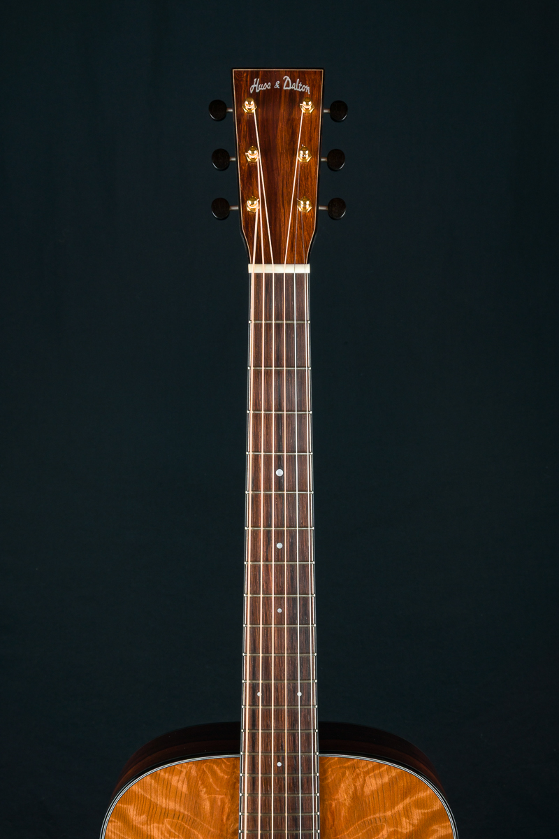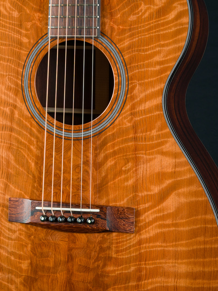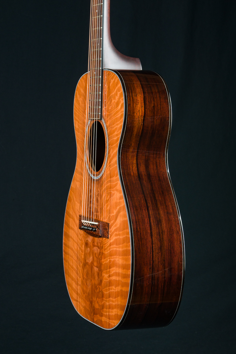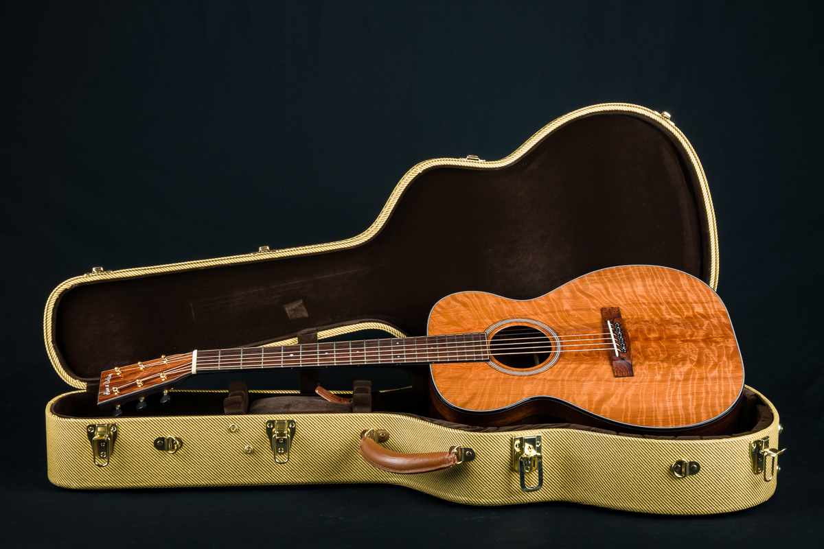 Other features include Mahogany neck, black/ white multi-strip top purfling and rosette, custom Gold Waverly tuners with Ebony buttons, Adirondack Spruce scalloped bracing, Pearl dot inlays, Ebony pins with Pearl dots, 1 23/32″ nut width, 24.9″ short scale length and more.
