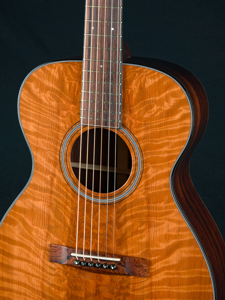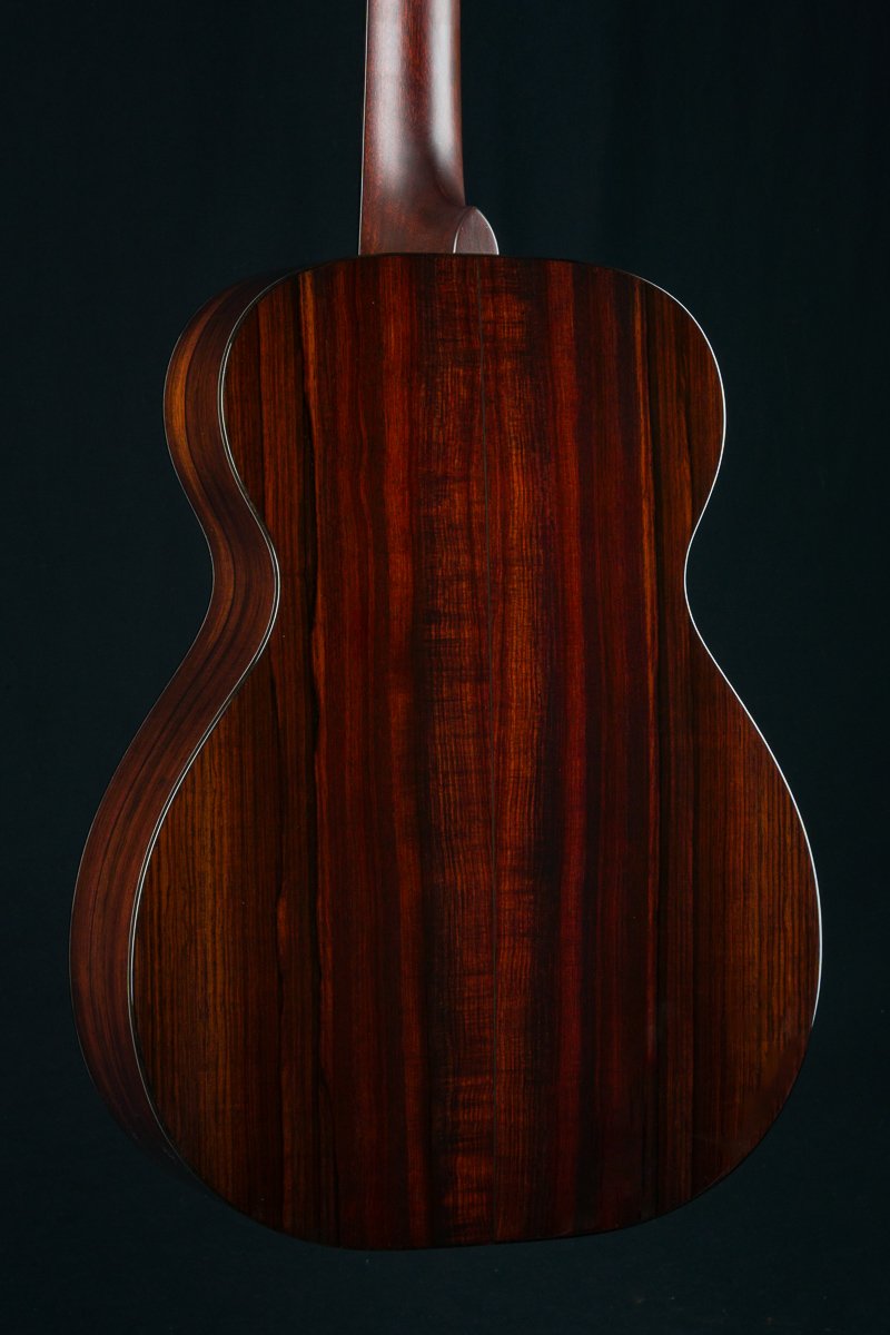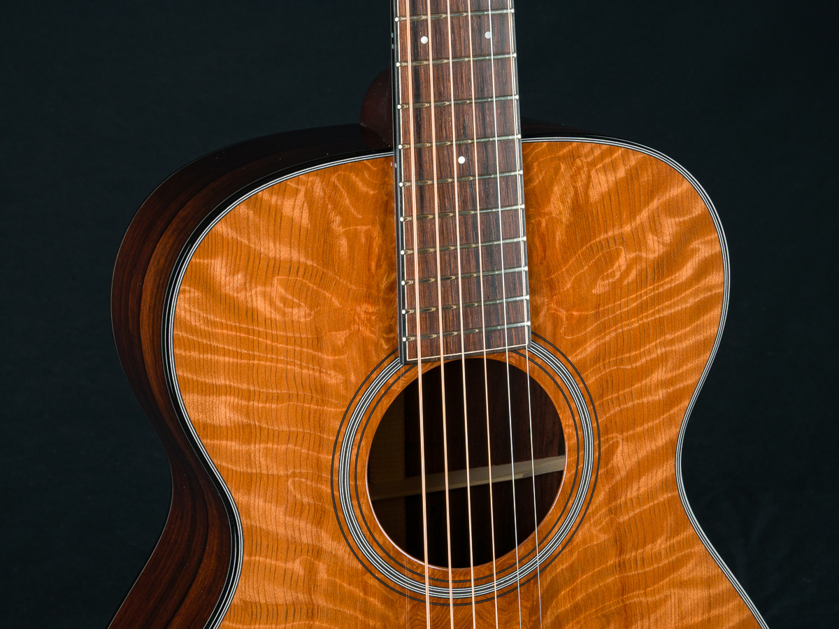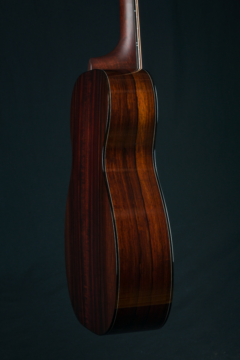 The back and sides of the T-0014 is a rich hued set of straight grained Madagascar Rosewood back and sides with deep red and brown color with contrasting dark streaks throughout. The top is hand picked highly figured and dimensional premium Redwood with mesmerizing ripples and curl which compliments the Rosewood nicely giving a sweet tone with punch, depth, balance and responsiveness in the 00 14-fret size body. The fretboard, bridge and headstock overlay are all matching Madagascar Rosewood and the full Ebony body, fretboard and headstock bindings complete the custom package. A great couch or lap guitar, but also perfect for a jam session or studio.