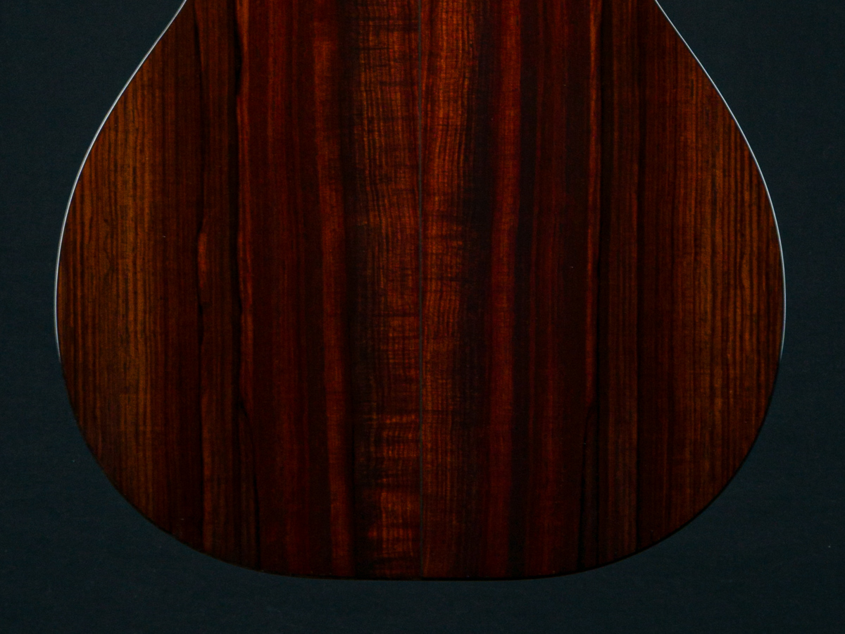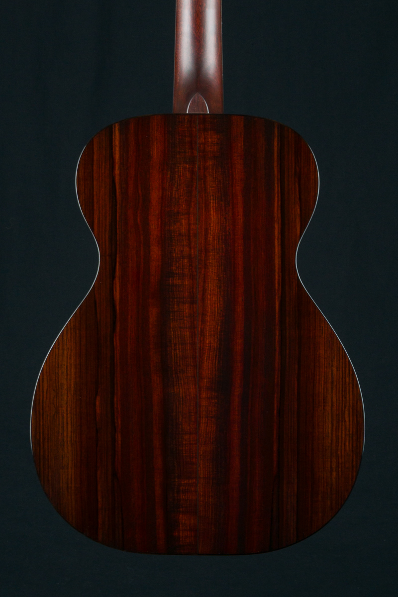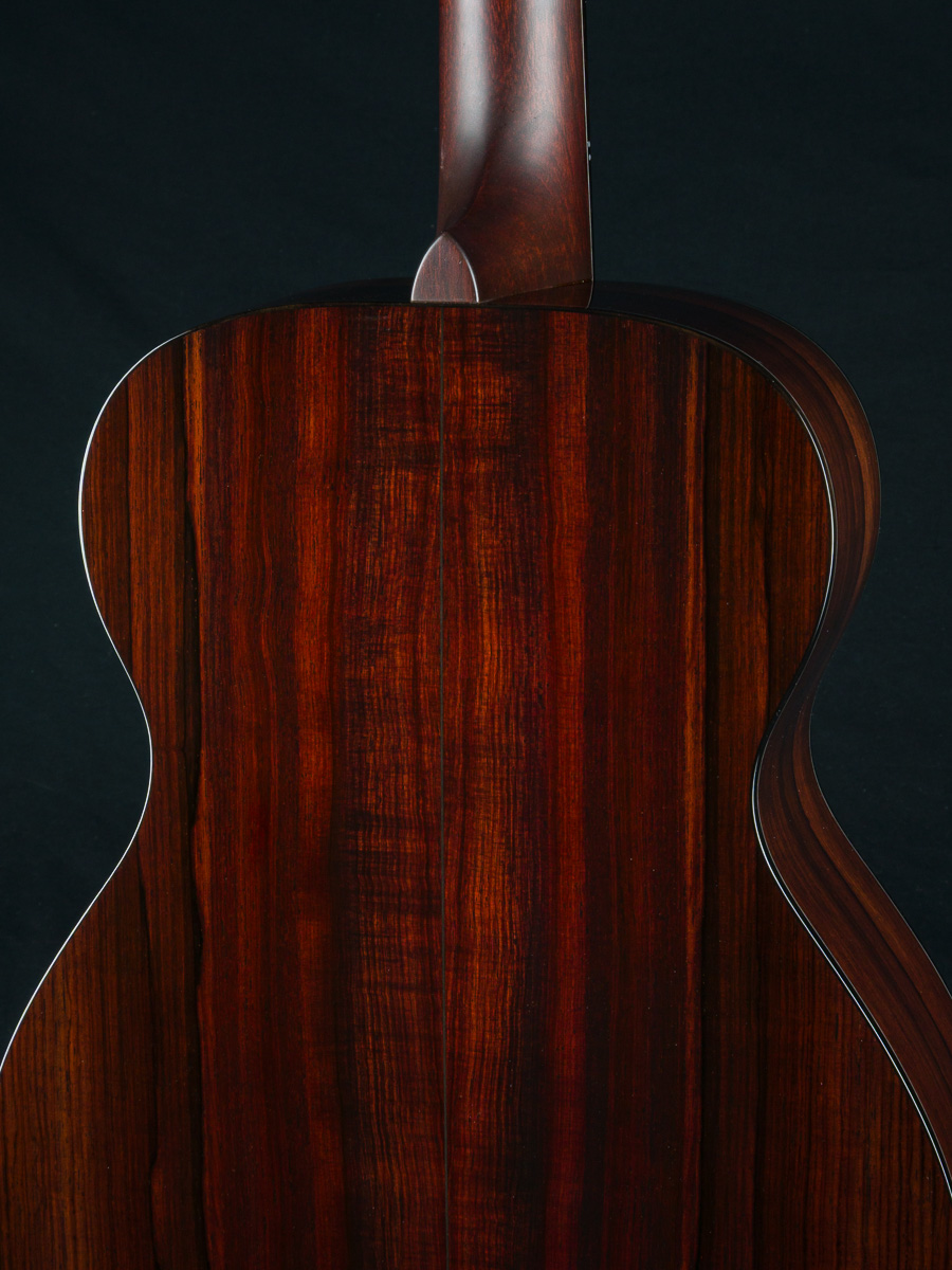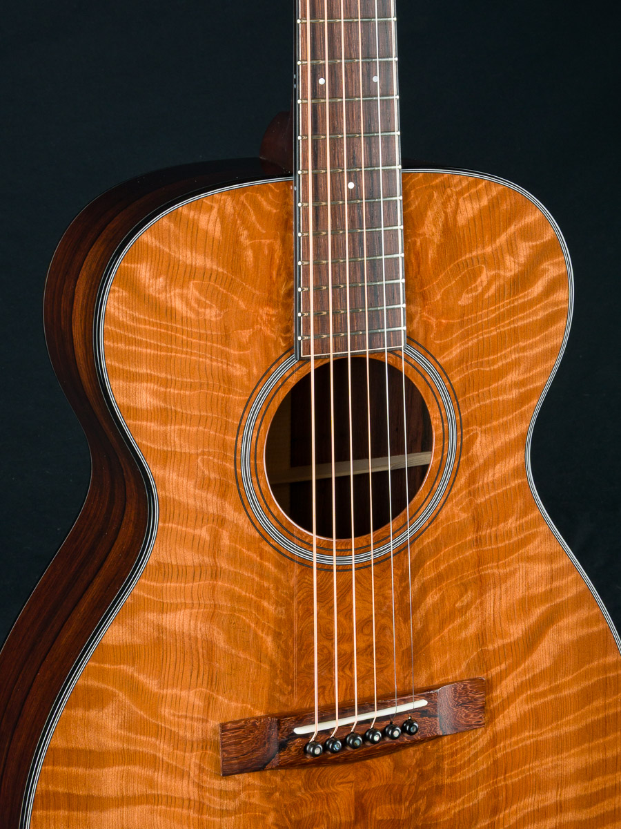 The back and sides of the T-0014 is a rich hued set of straight grained Madagascar Rosewood back and sides with deep red and brown color with contrasting dark streaks throughout. The top is hand picked highly figured and dimensional premium Redwood with mesmerizing ripples and curl which compliments the Rosewood nicely giving a sweet tone with punch, depth, balance and responsiveness in the 00 14-fret size body. The fretboard, bridge and headstock overlay are all matching Madagascar Rosewood and the full Ebony body, fretboard and headstock bindings complete the custom package. A great couch or lap guitar, but also perfect for a jam session or studio.