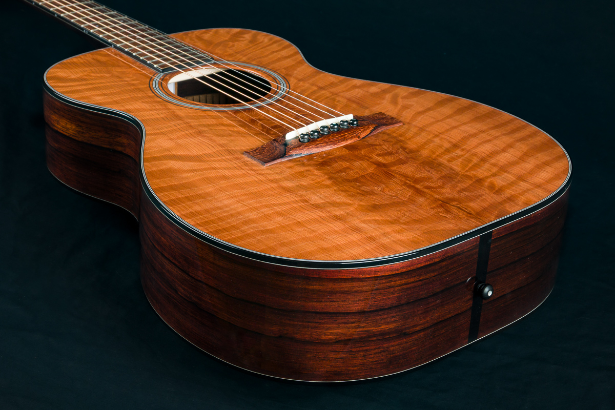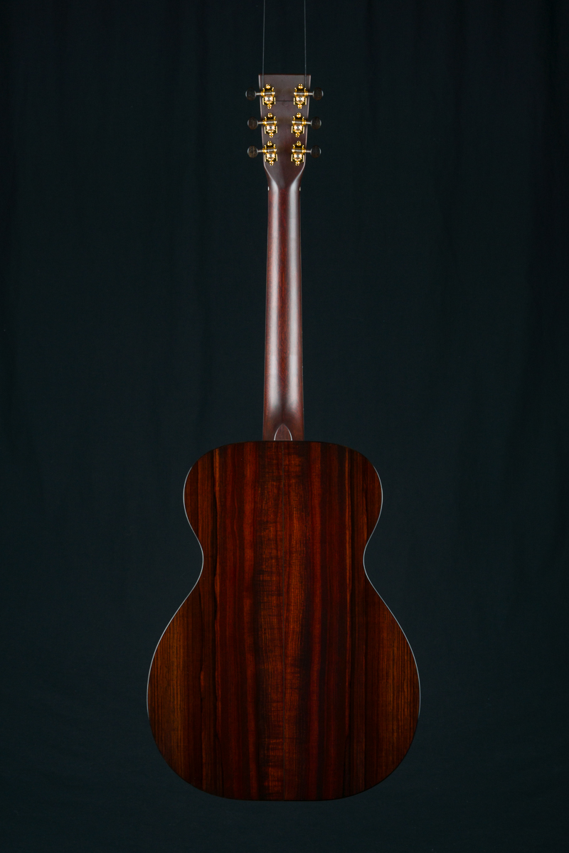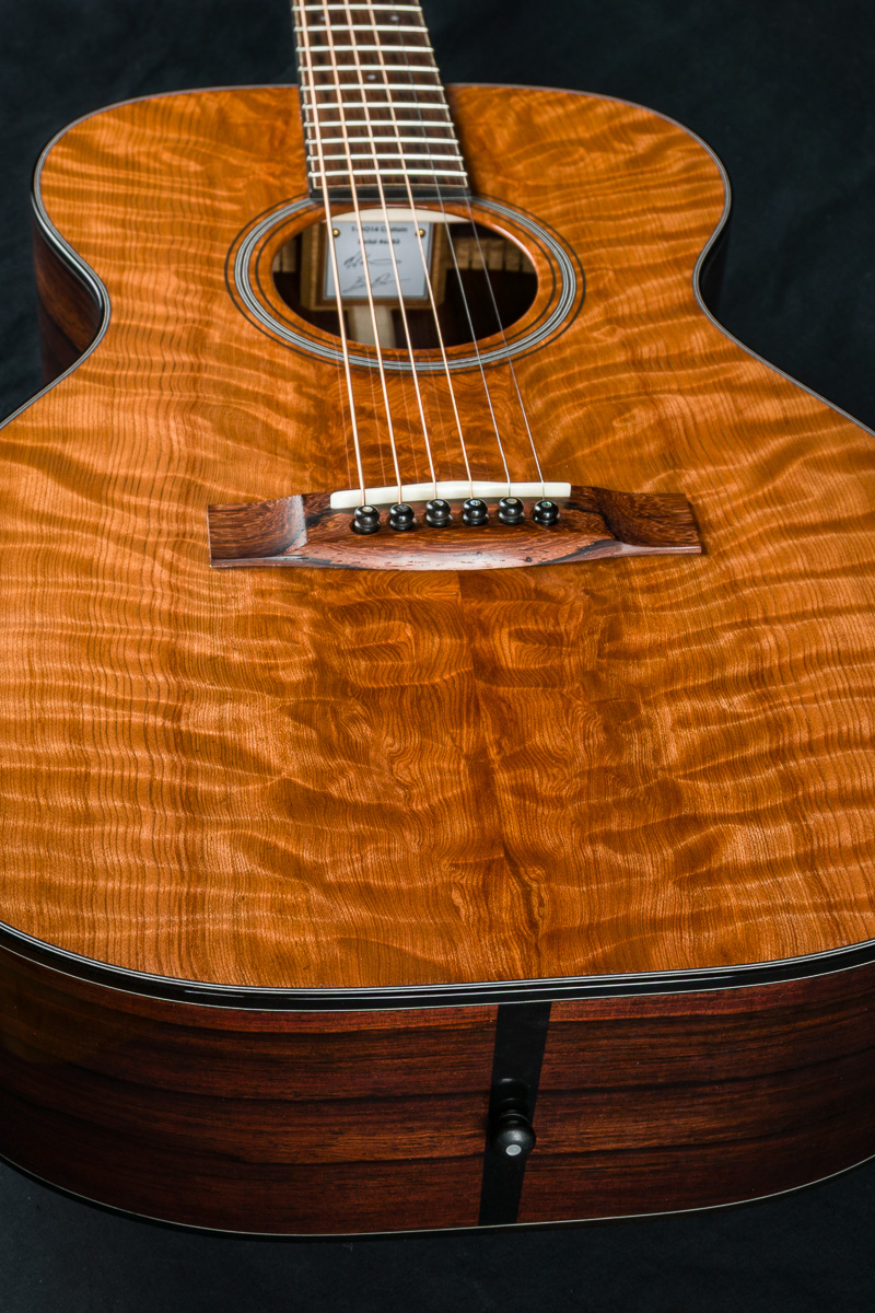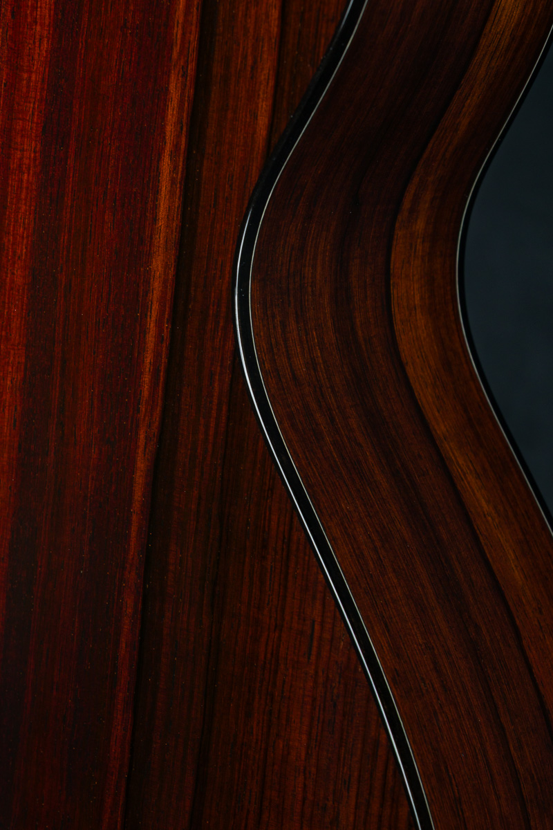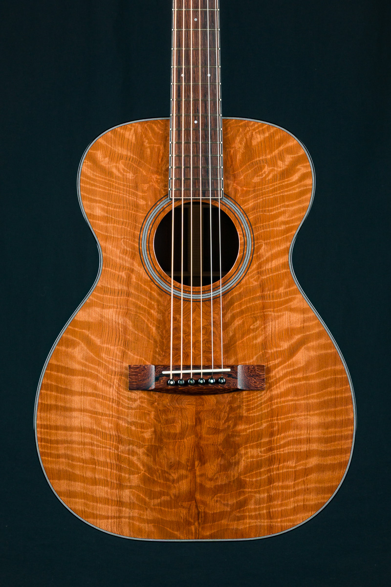 The back and sides of the T-0014 is a rich hued set of straight grained Madagascar Rosewood back and sides with deep red and brown color with contrasting dark streaks throughout. The top is hand picked highly figured and dimensional premium Redwood with mesmerizing ripples and curl which compliments the Rosewood nicely giving a sweet tone with punch, depth, balance and responsiveness in the 00 14-fret size body. The fretboard, bridge and headstock overlay are all matching Madagascar Rosewood and the full Ebony body, fretboard and headstock bindings complete the custom package. A great couch or lap guitar, but also perfect for a jam session or studio.
