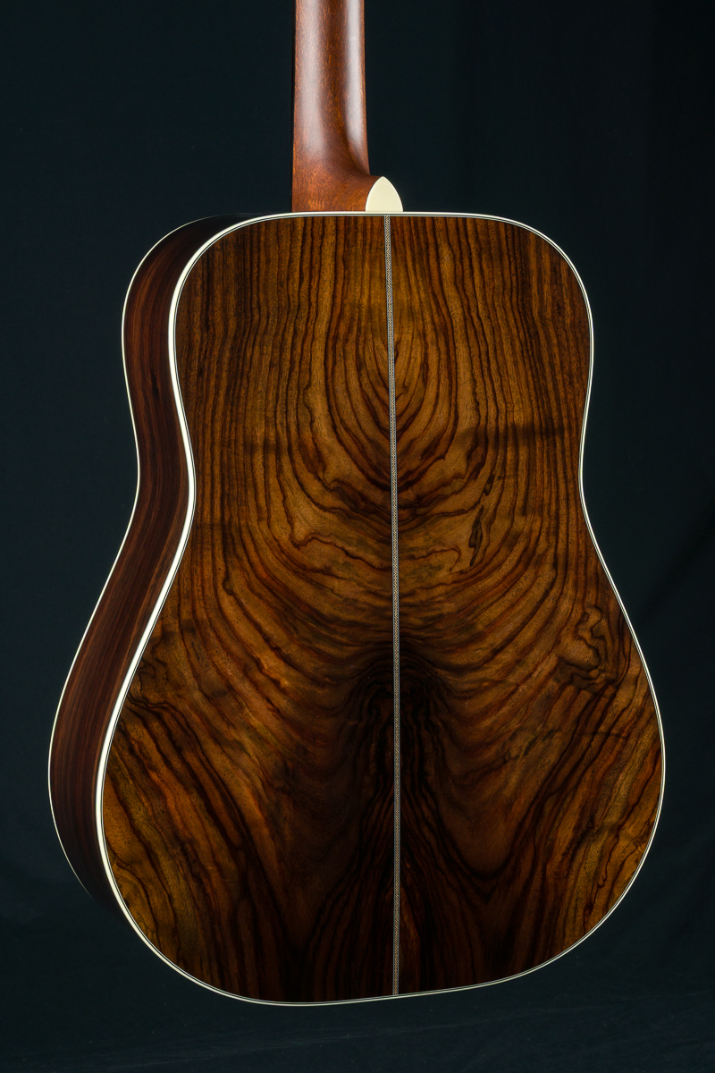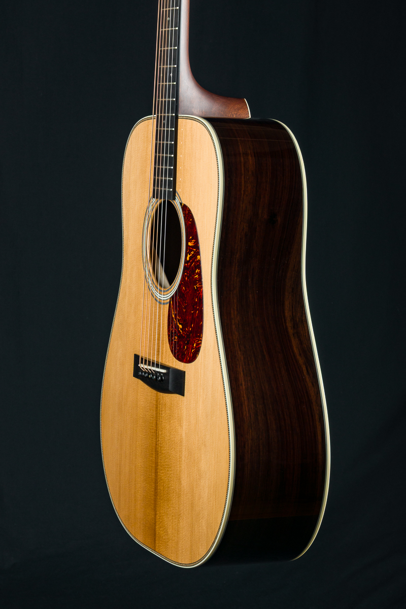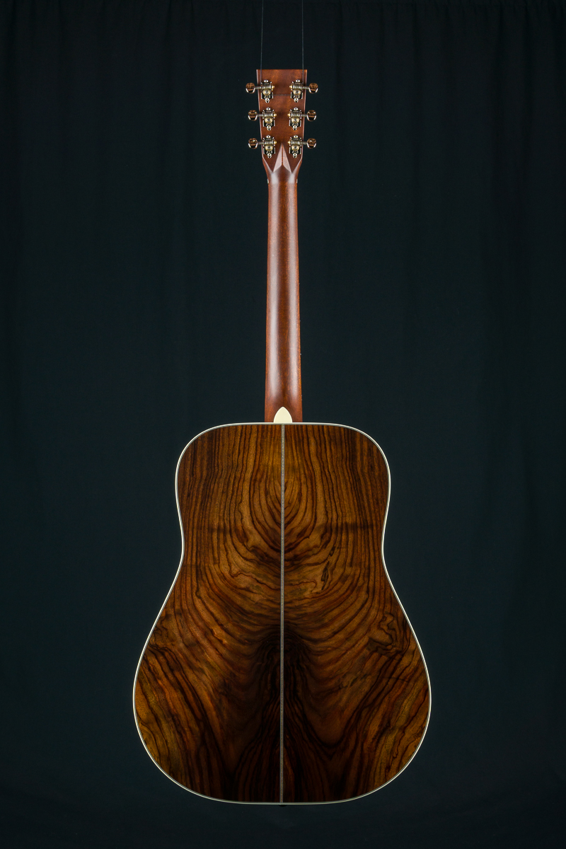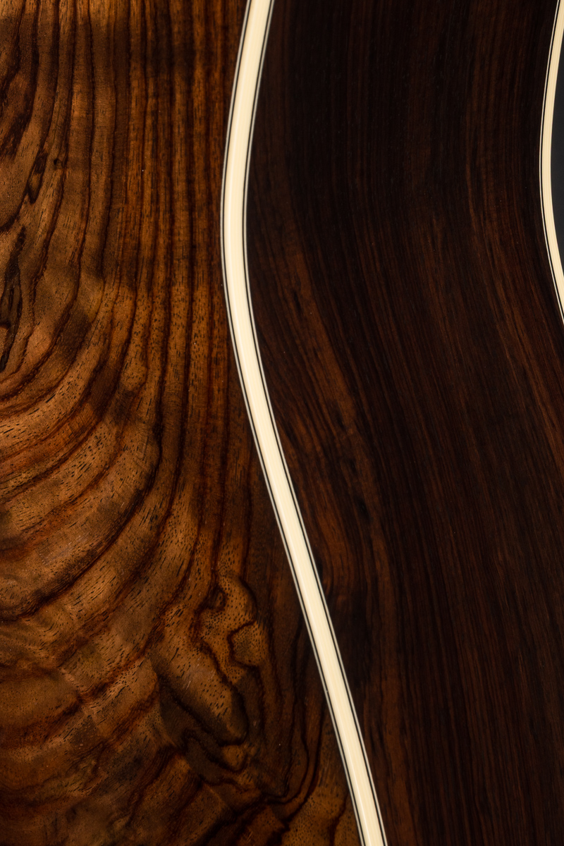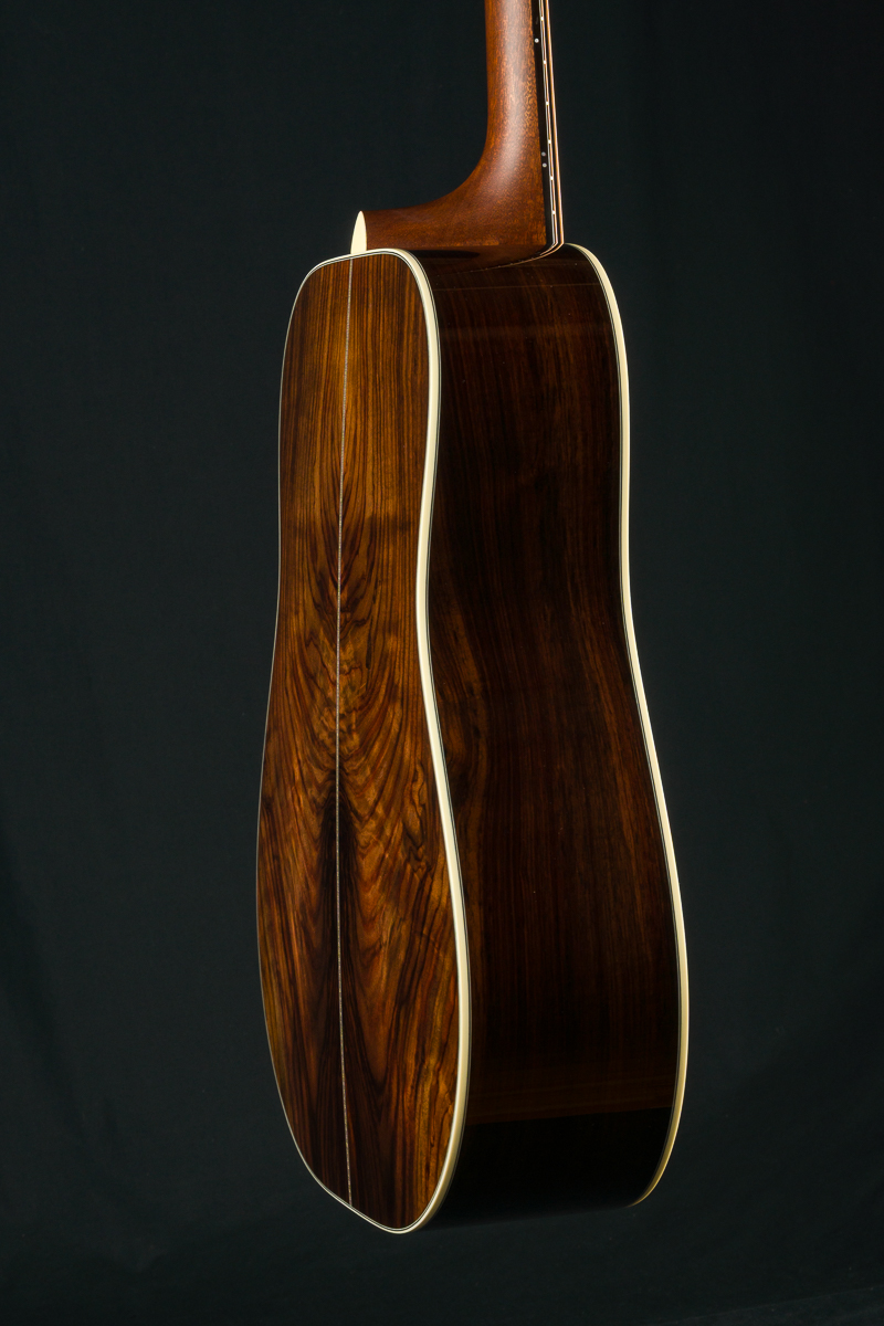 A straight to the point flatpicking herringbone dreadnought with mesmerizing Wild Grain Indian Rosewood. A great guitar with looks and tone for the serious working musician, closet player or collector. The fine set of Wild Grain Indian Rosewood back and sides with wonderful figuring and color is paired with a torrefied ‘Thermo-Cured’ Adirondack Red Spruce flat top along with Ivoroid bindings, herringbone top purfling and custom 1 11/16″ nut width, 2 3/16″ saddle spacing and drop in saddle.