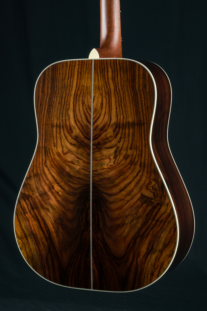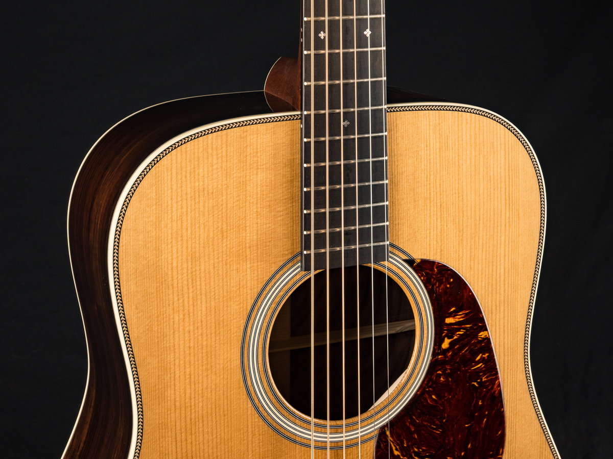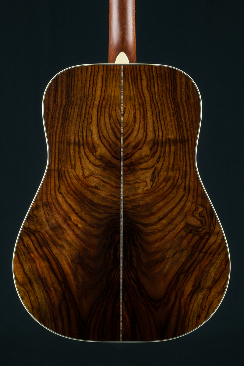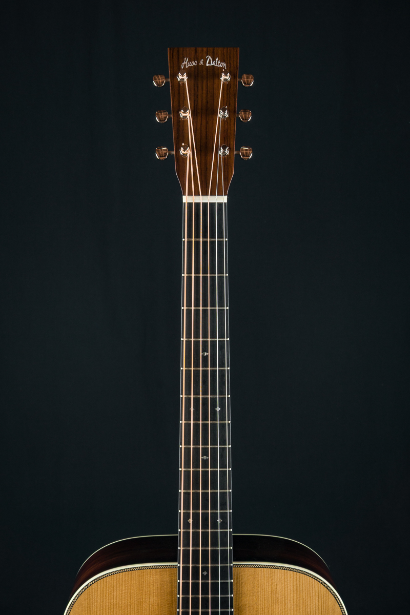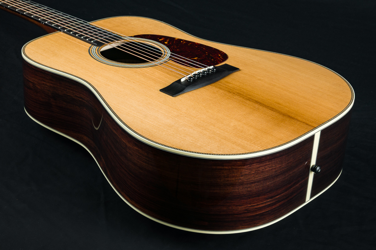 A straight to the point flatpicking herringbone dreadnought with mesmerizing Wild Grain Indian Rosewood. A great guitar with looks and tone for the serious working musician, closet player or collector. The fine set of Wild Grain Indian Rosewood back and sides with wonderful figuring and color is paired with a torrefied ‘Thermo-Cured’ Adirondack Red Spruce flat top along with Ivoroid bindings, herringbone top purfling and custom 1 11/16″ nut width, 2 3/16″ saddle spacing and drop in saddle.