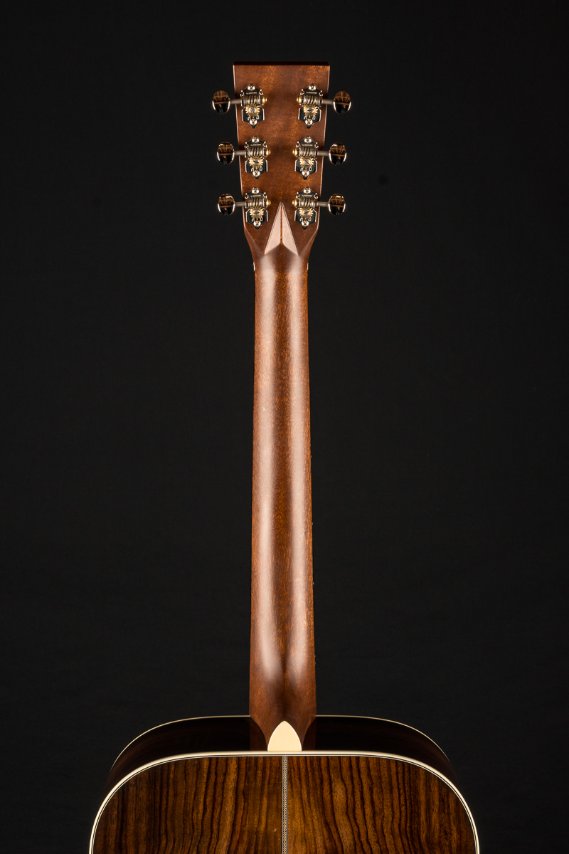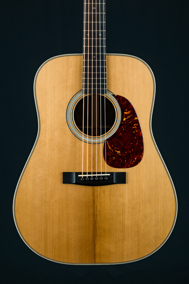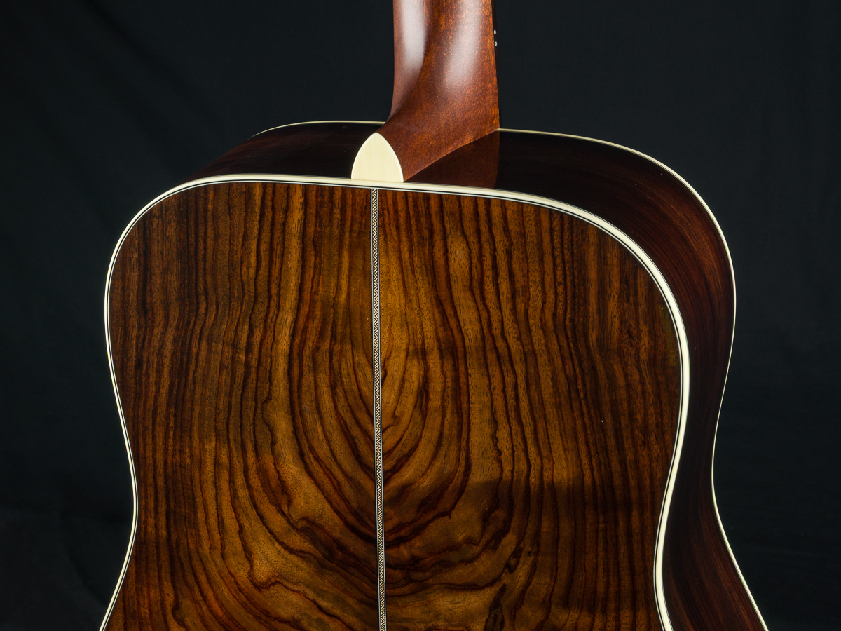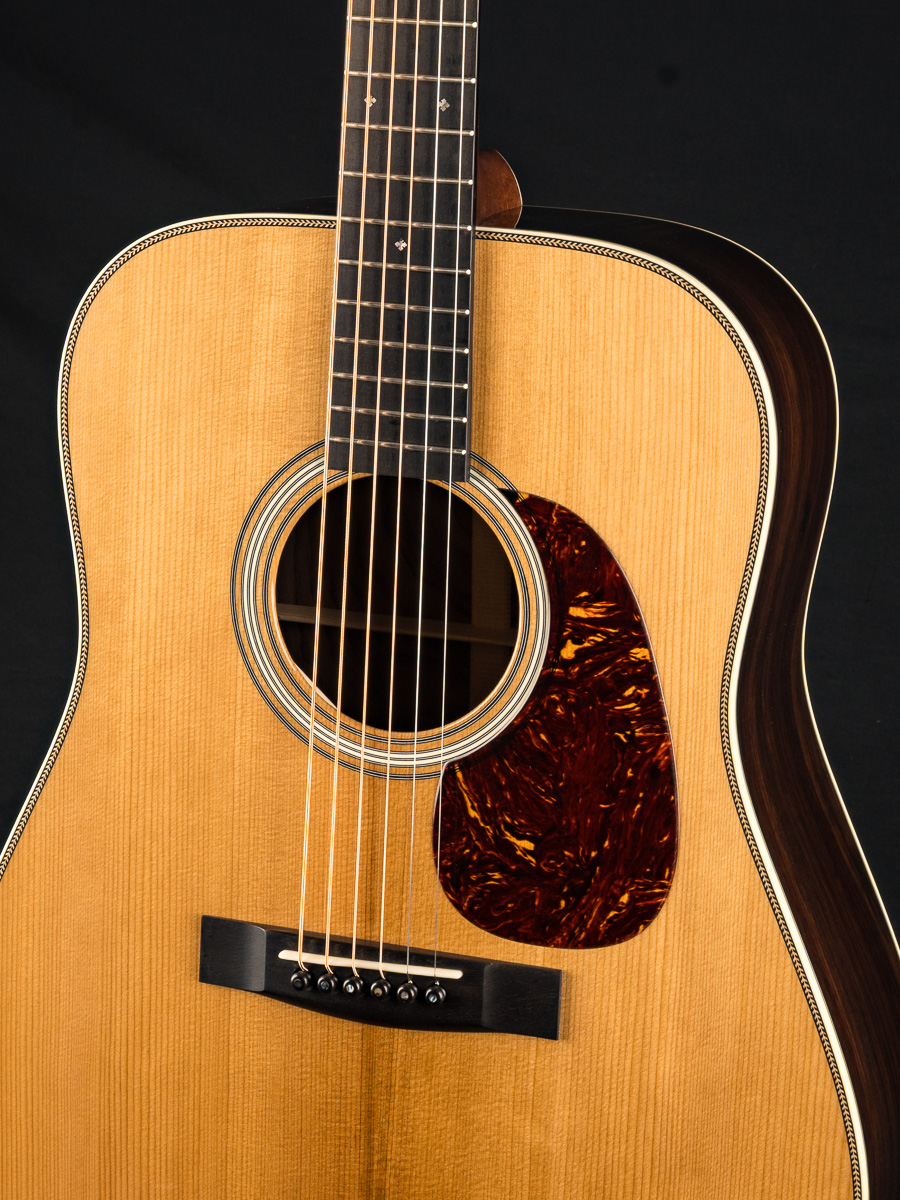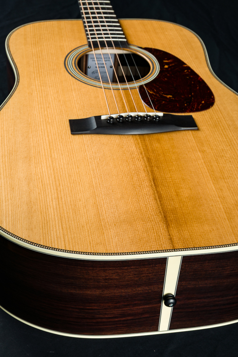 A straight to the point flatpicking herringbone dreadnought with mesmerizing Wild Grain Indian Rosewood. A great guitar with looks and tone for the serious working musician, closet player or collector. The fine set of Wild Grain Indian Rosewood back and sides with wonderful figuring and color is paired with a torrefied ‘Thermo-Cured’ Adirondack Red Spruce flat top along with Ivoroid bindings, herringbone top purfling and custom 1 11/16″ nut width, 2 3/16″ saddle spacing and drop in saddle.